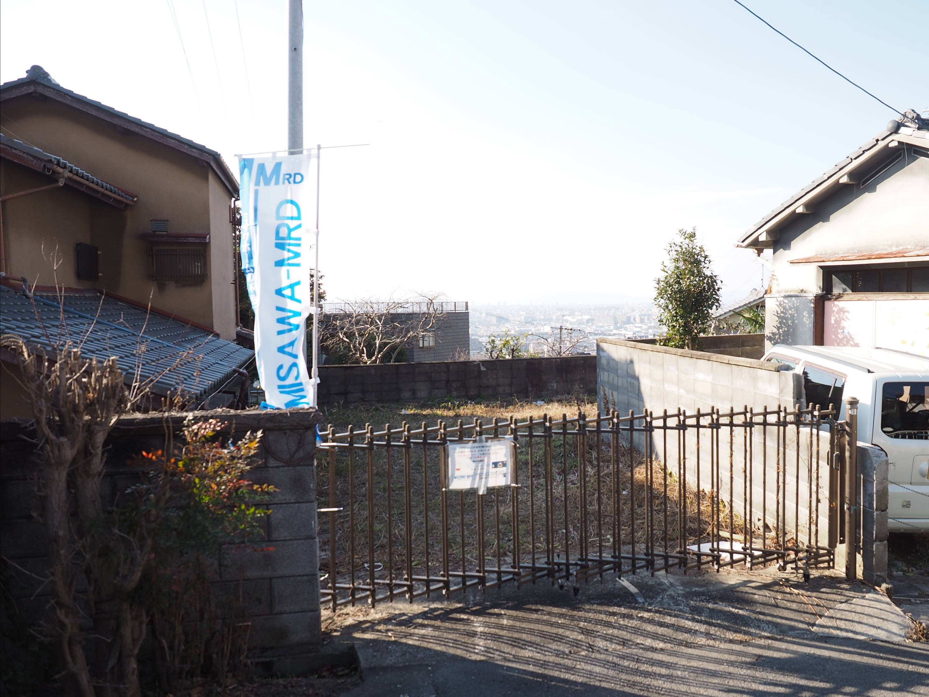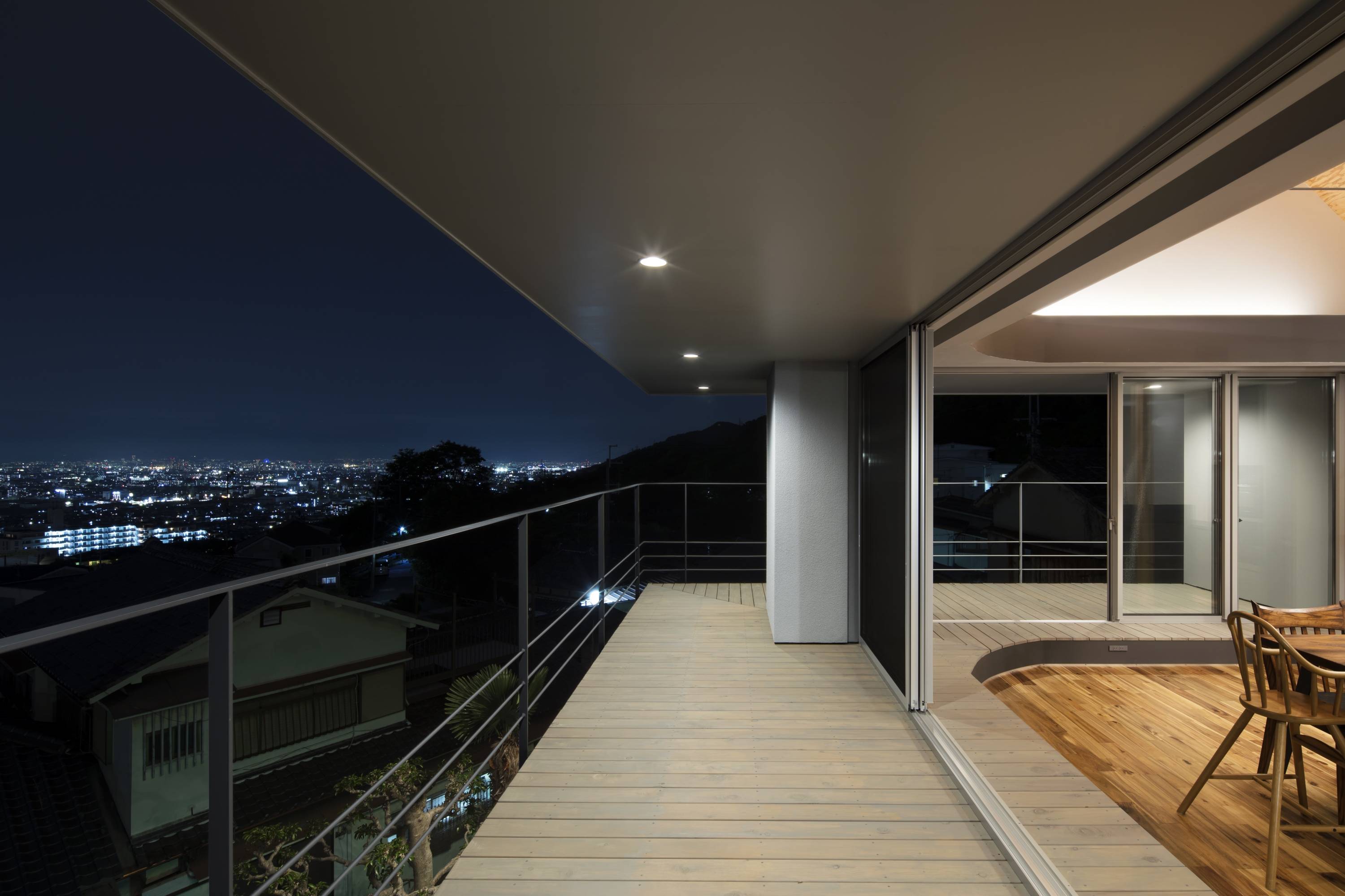 この敷地は、生駒山の中腹に位置している。東側からの接道による旗竿地であるが、西側には都心を超え大阪湾、空気が澄んでいる日には明石海峡大橋、そして六甲連山まで見渡せる眺望があり、春には北側の桜の群生を眼下にみることができる。都心に住むクライアントが、この高台の敷地を購入するきっかけはこの眺望だった。リビングからこの眺望を楽しめるようにしたいと考えていた。また、今までマンション暮らしだったため、天井の高いリビングに憧れているとのことであった。この眺望をどのようにして効果的に生活の一部に取り込んでいくのかというのが最大のテーマだった。