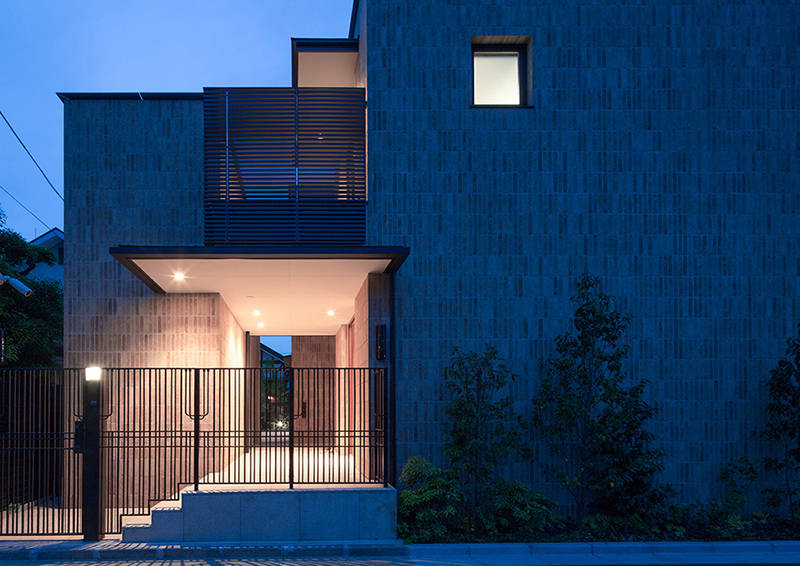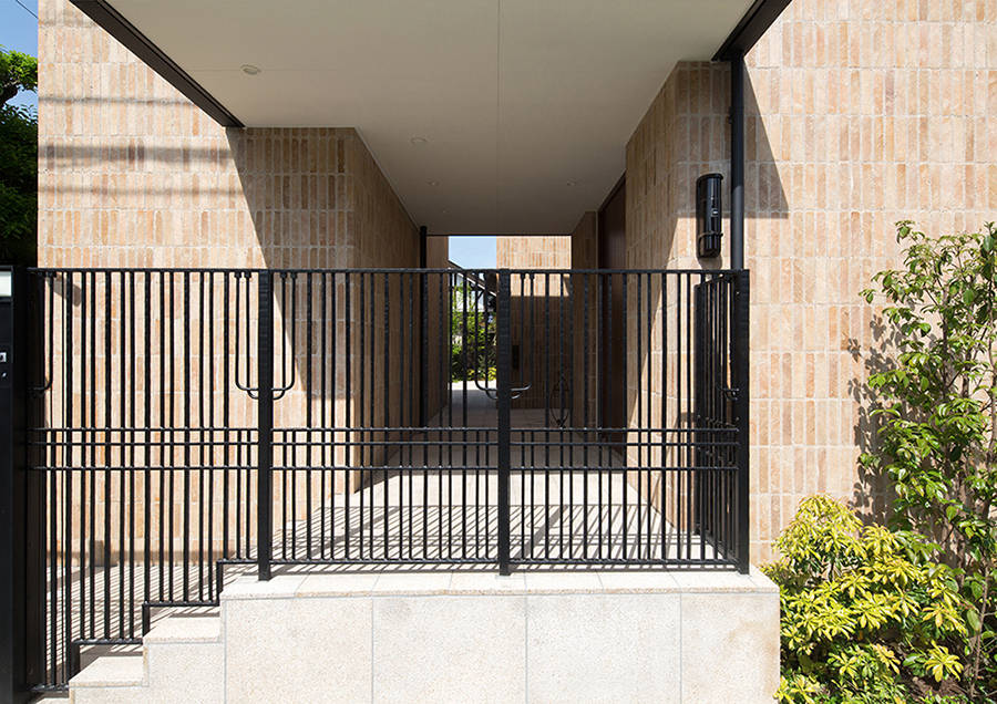 外壁は表面に手加工を加えたタイルと左官材の組合せで、ロートアイアンのフェンスや門扉がアクセントとなっています。
