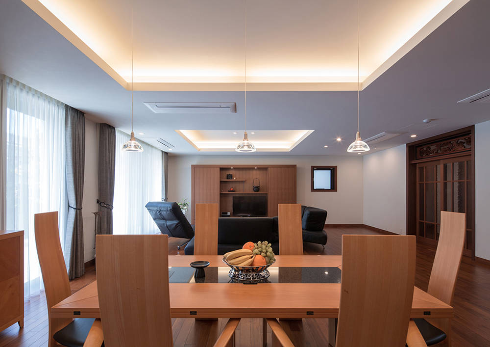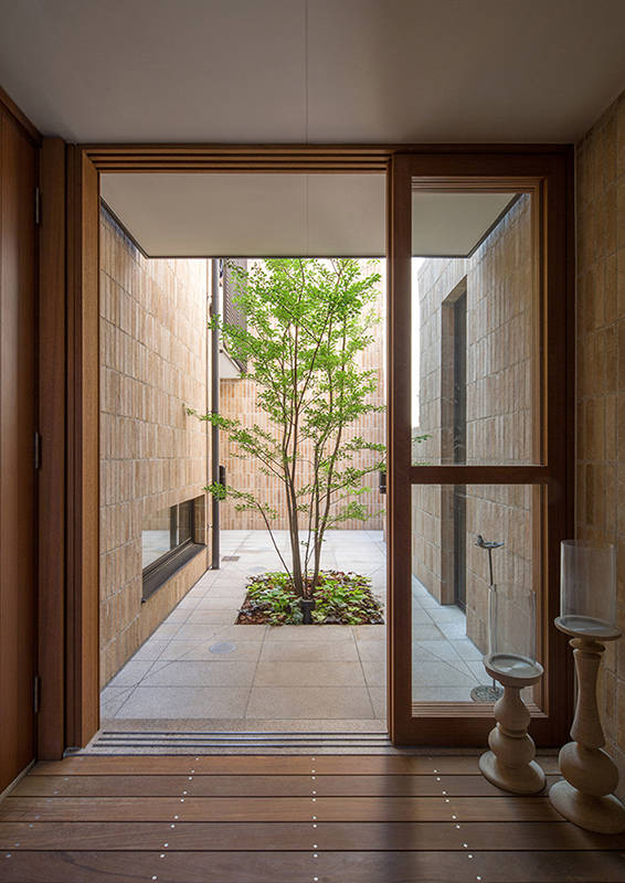テラスや中庭はさび石のビシャン仕上げ。植栽はアオハダやアオダモ、エゴノキ等の落葉樹とツバキやソヨゴ等の常緑樹の組合せで、足元には多くの山野草が植えられています。