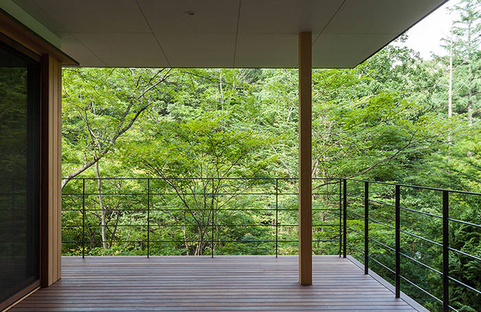 北斜面に半分埋め込まれたコンクリート造の上に木造が乗る混構造です。冬の寒さと夏の結露対策のため高断熱高気密工法としています。外壁はコンクリート打放しと米杉縁甲板貼。屋根を掛けたテラスと大きく張り出した軒が特徴となっています。上階のリビングからは木製サッシュの大開口からモミジ林を眺めることができます。