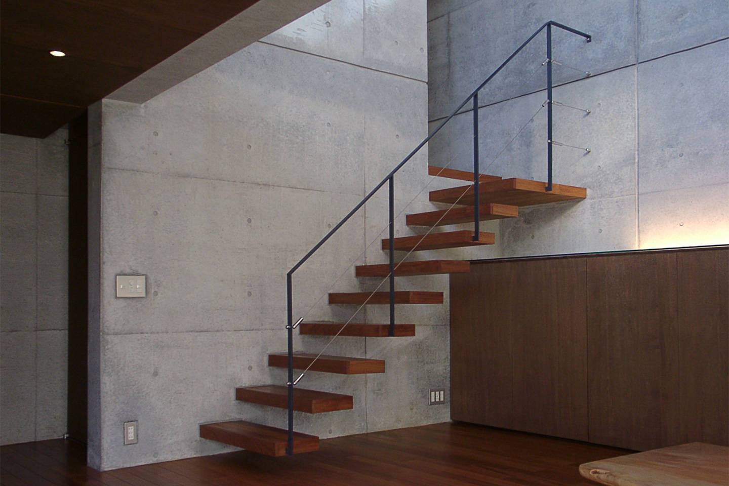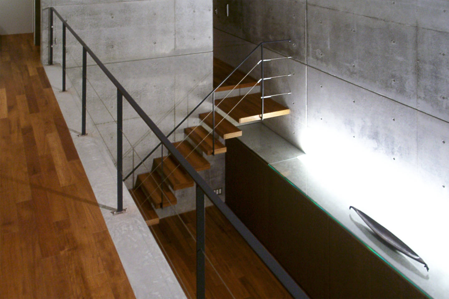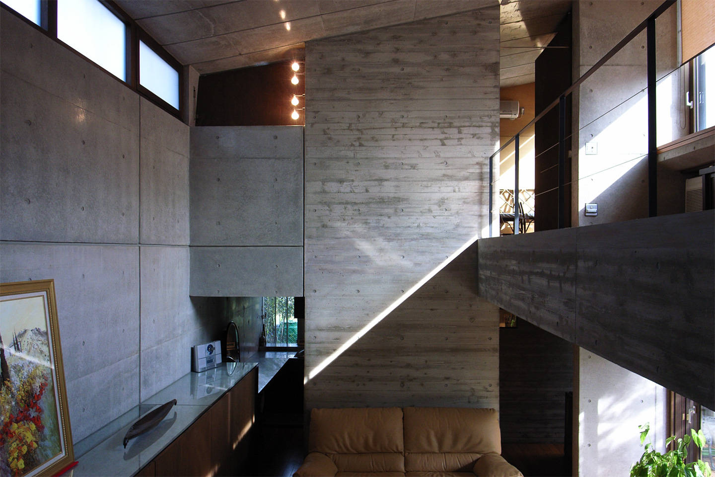 大きな吹き抜けがある打ち放しながら暖かみのある室内空間を持ちます。