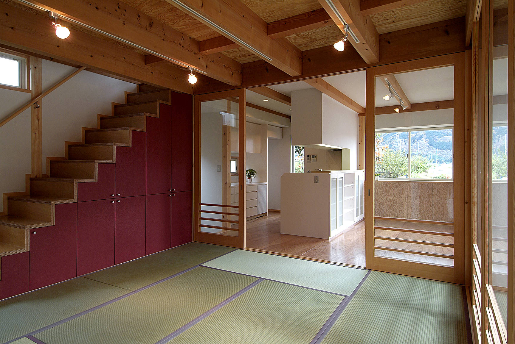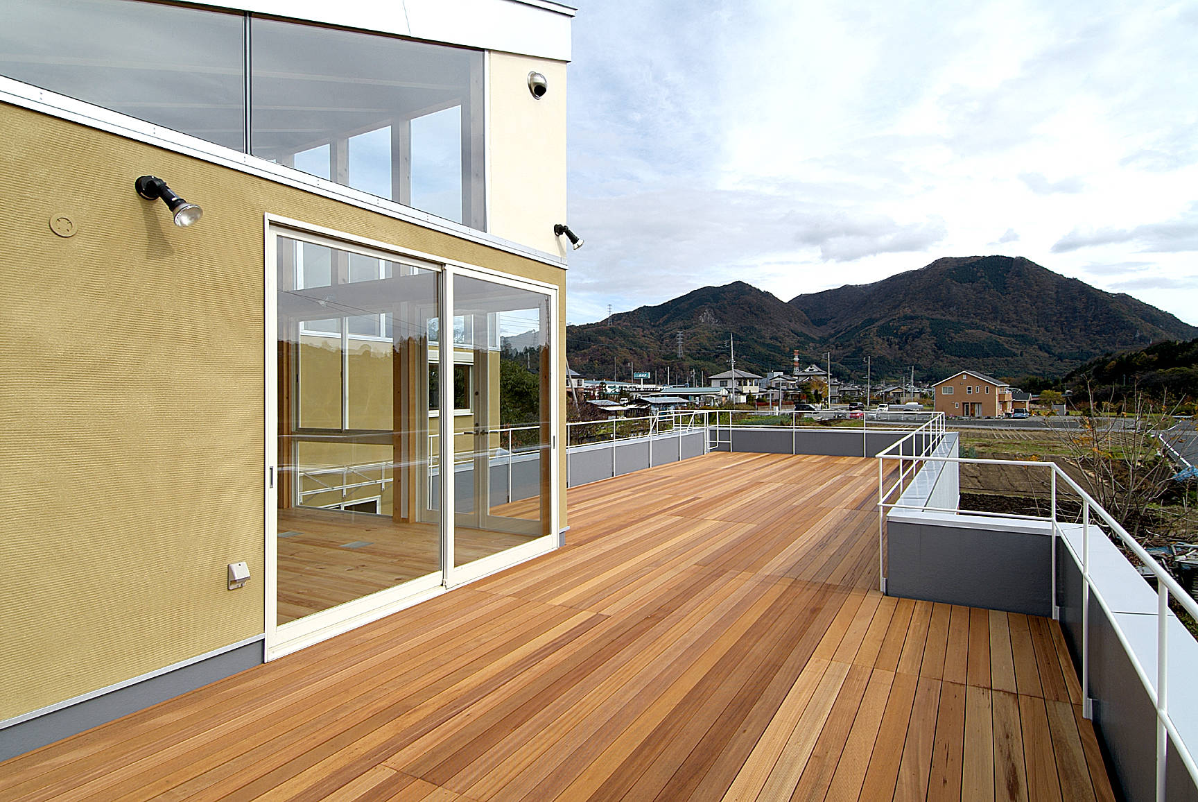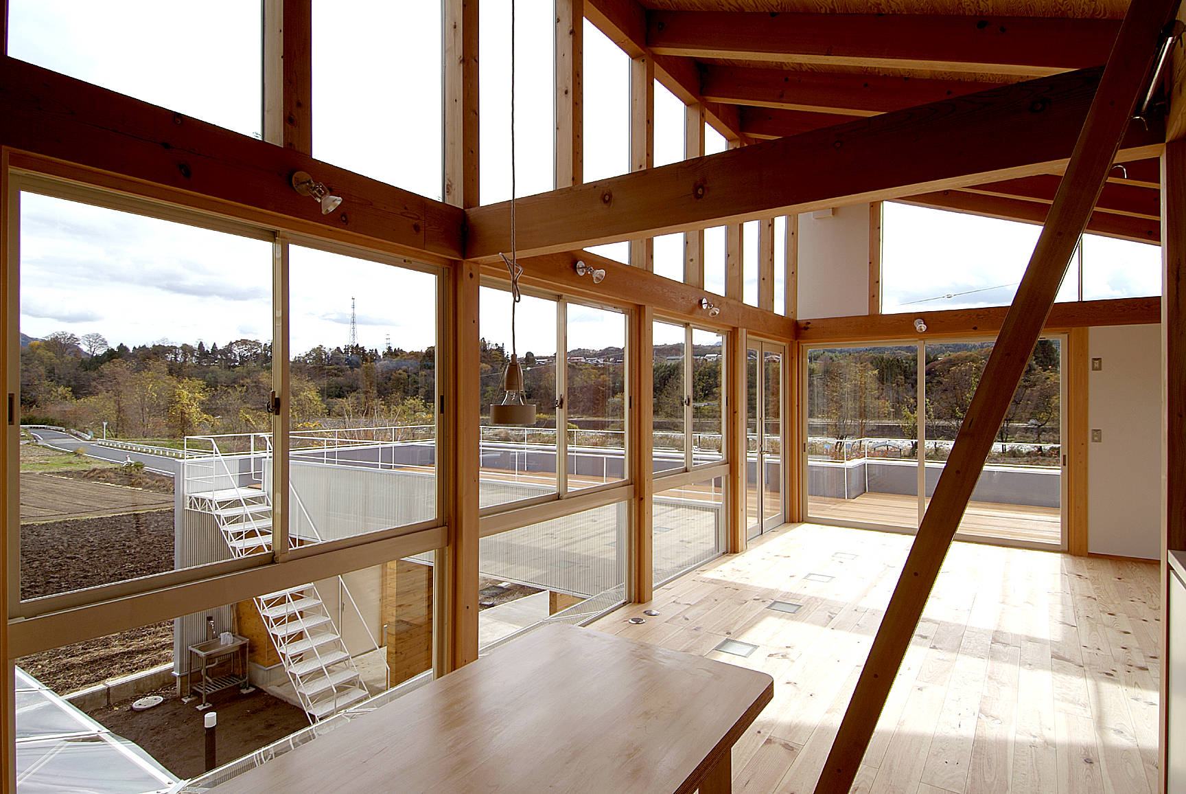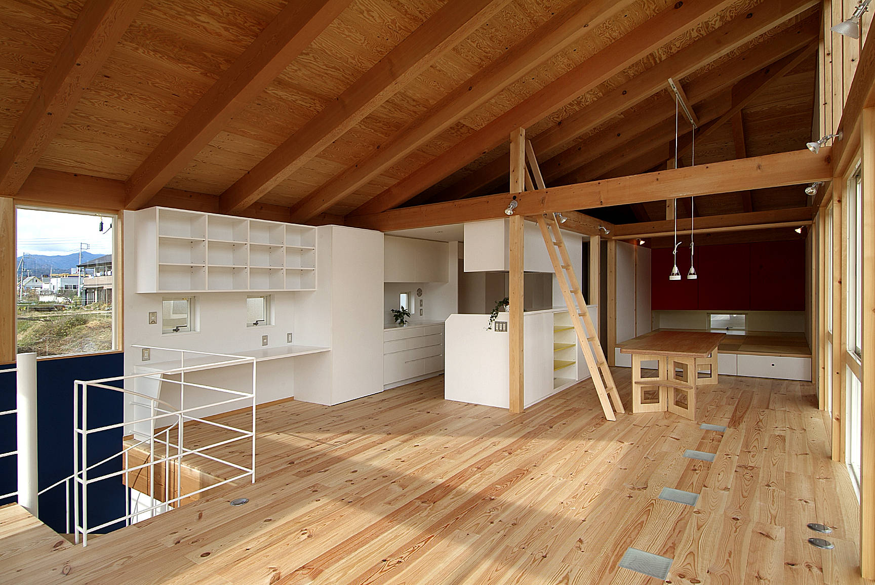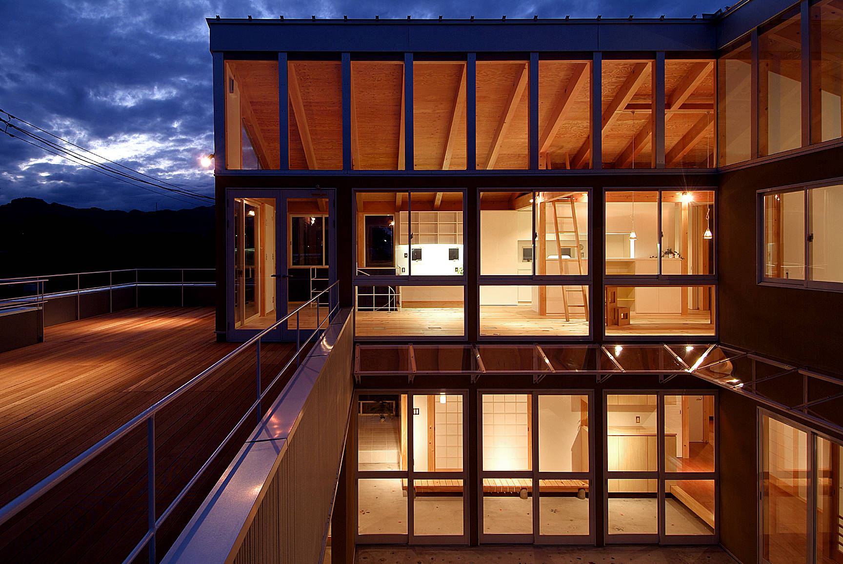 南側には吾妻川が流れ東西には周囲の山々が見えるロケーションに建つ二世帯住宅です。共有の土間空間を中心に親世帯と子世帯に分かれます。親世帯は1階中庭に面して茶の間とダイニングがあります。土間にある螺旋階段を上がると子世帯の2階リビングへ。リビングに面した2階デッキスペースは二世帯共有のくつろぎの場所。親世帯の中庭からも上がれて周囲の自然を満喫できる特等席です。ビールが大好きな家族全員が集まるとここで楽しくワイワイとBBQが始まります。