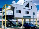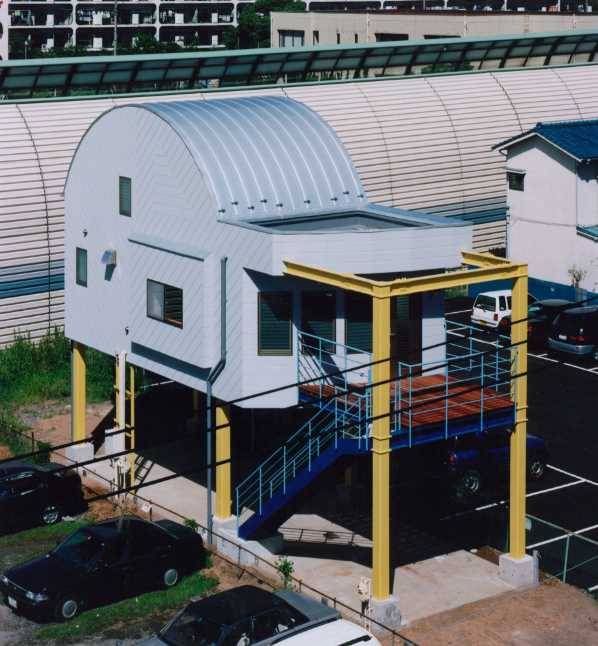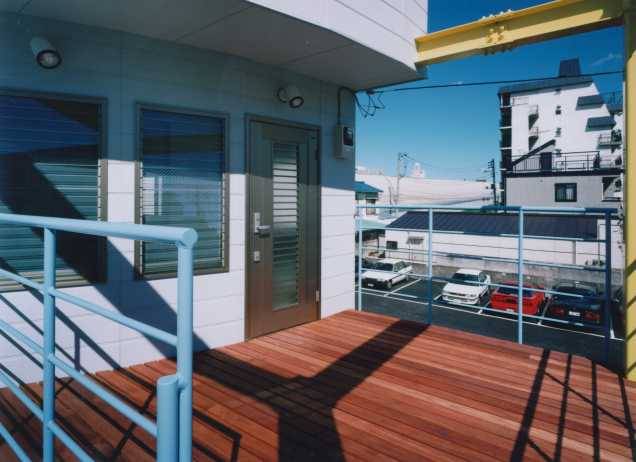 間口5.2m奥行き15mの細長い敷地に建つ都市の男の別荘である。後ろに高速道路が走り、間口が狭いという悪条件の敷地で、格安に取得できた。キャンピングカー等の複数の車を停める。階段で2階南側のウッドデッキに上り、そこから室内に入る。車好きの仲間と集まる