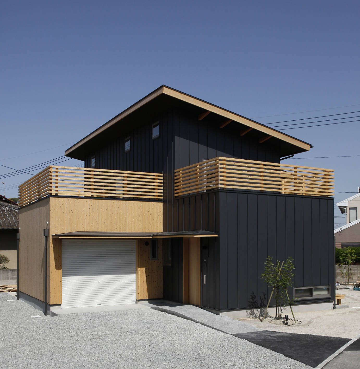 木造2階建、二世代住宅、天然木の羽目板とガルバリウム鋼板の外壁のコントラストが和モダンのテイストを醸し出している。リビングのそばに祖母室を配置しいつも家族の気配を感じられるよう配慮しました。