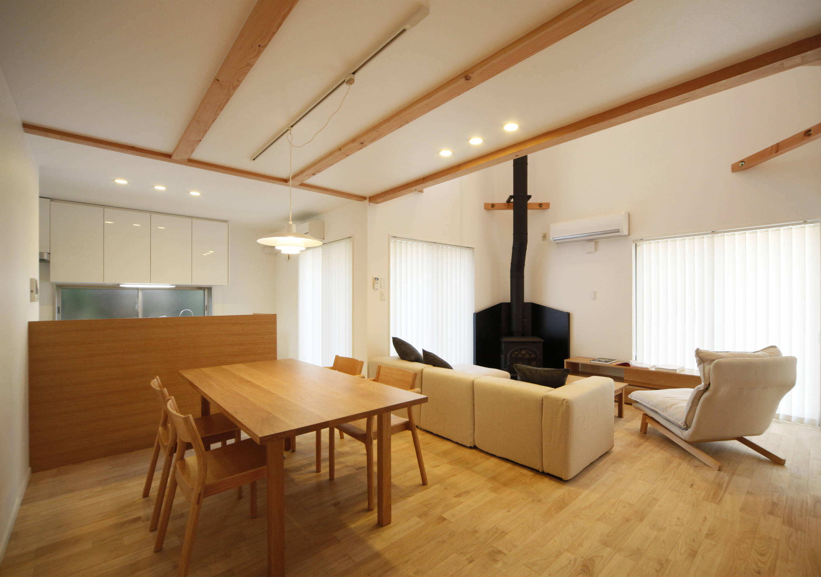 吹き抜けと薪ストーブがあるLDK。床は栗の無垢材