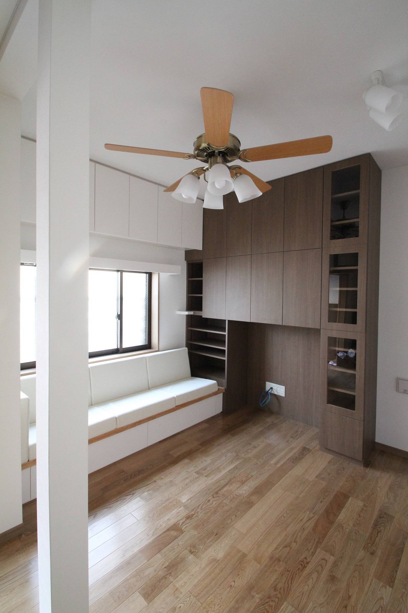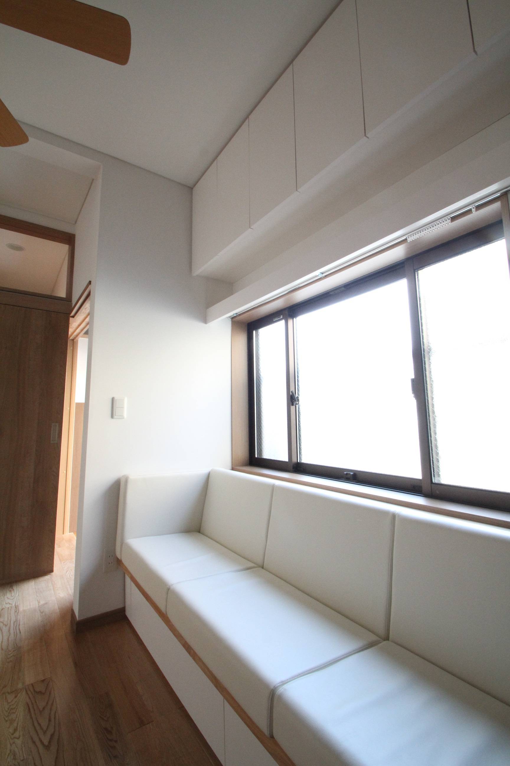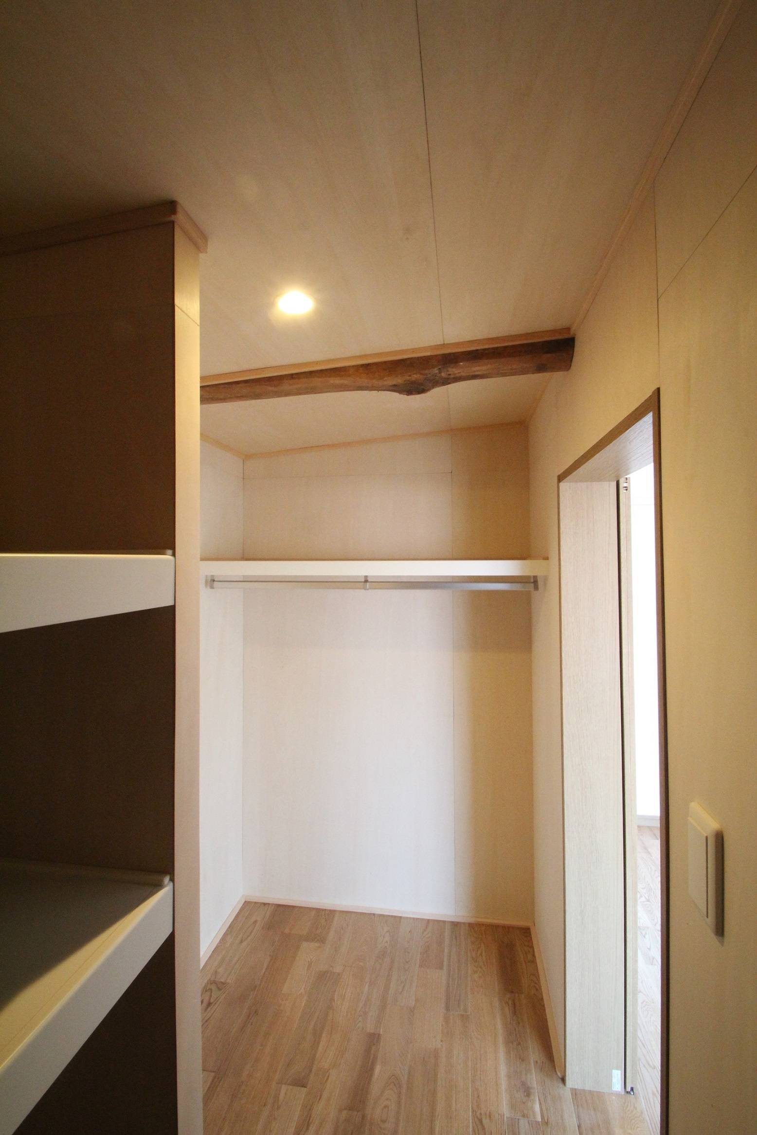 最上階は、天井を屋根なりに斜めに高くし、梁を見せることでちょっとした隠れ家部屋の様な個室になりました。お父様の絵を保管して置く場所、生活の用具など、どこに何を入れどう出すかを綿密に考え、取り出せる・仕舞える収納を色々な場所につくっています。製作したソファーの座面したの中にも奥様の仕事用品を入れるなど、必要な場所に必要なサイズの収納を設けています。
