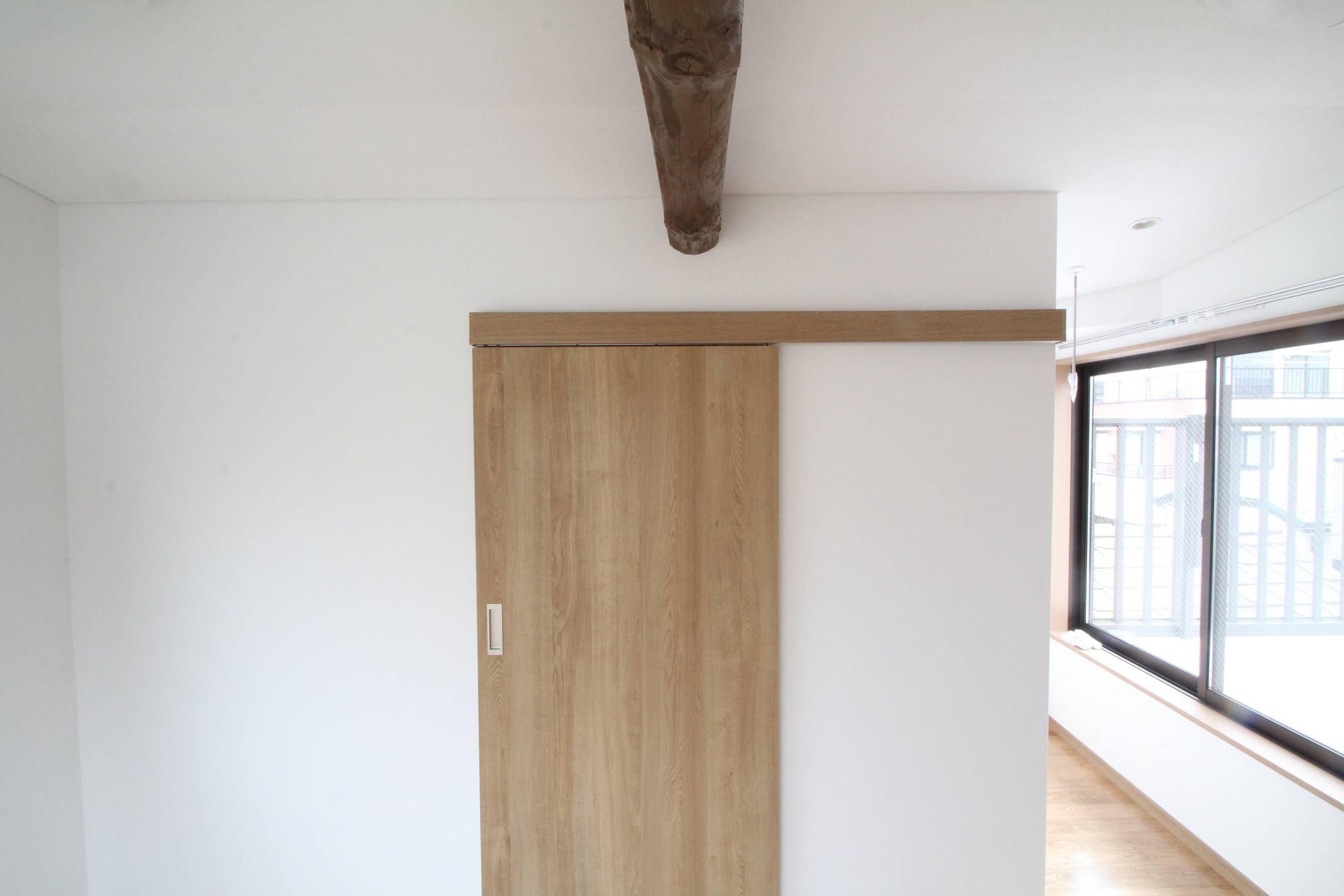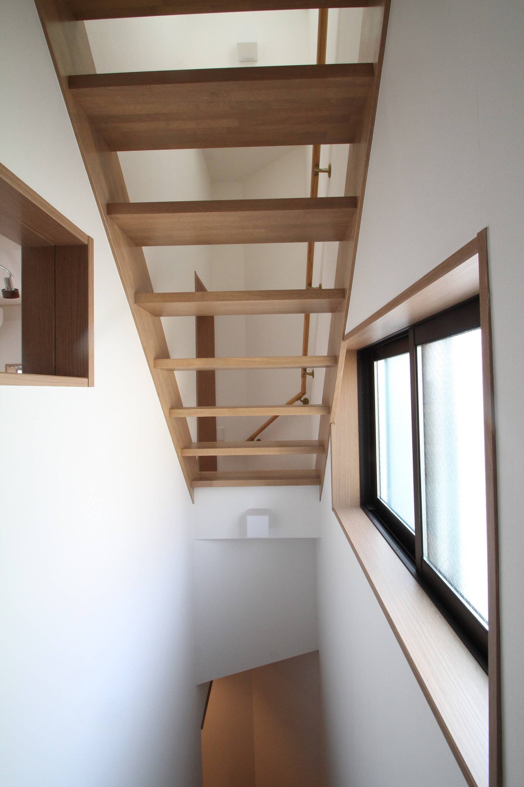 猫ちゃんが出ていかない様、玄関内側に引き戸を設けました。光を取り入れ圧迫感をなくす為、階段は踏み板の間の板を抜いたスケルトン階段にしましたが、猫ちゃん絶好の通り道になっています。耐震改修をしっかりするため、新たに基礎を作るなど、構造をフルリノベーションしています。
