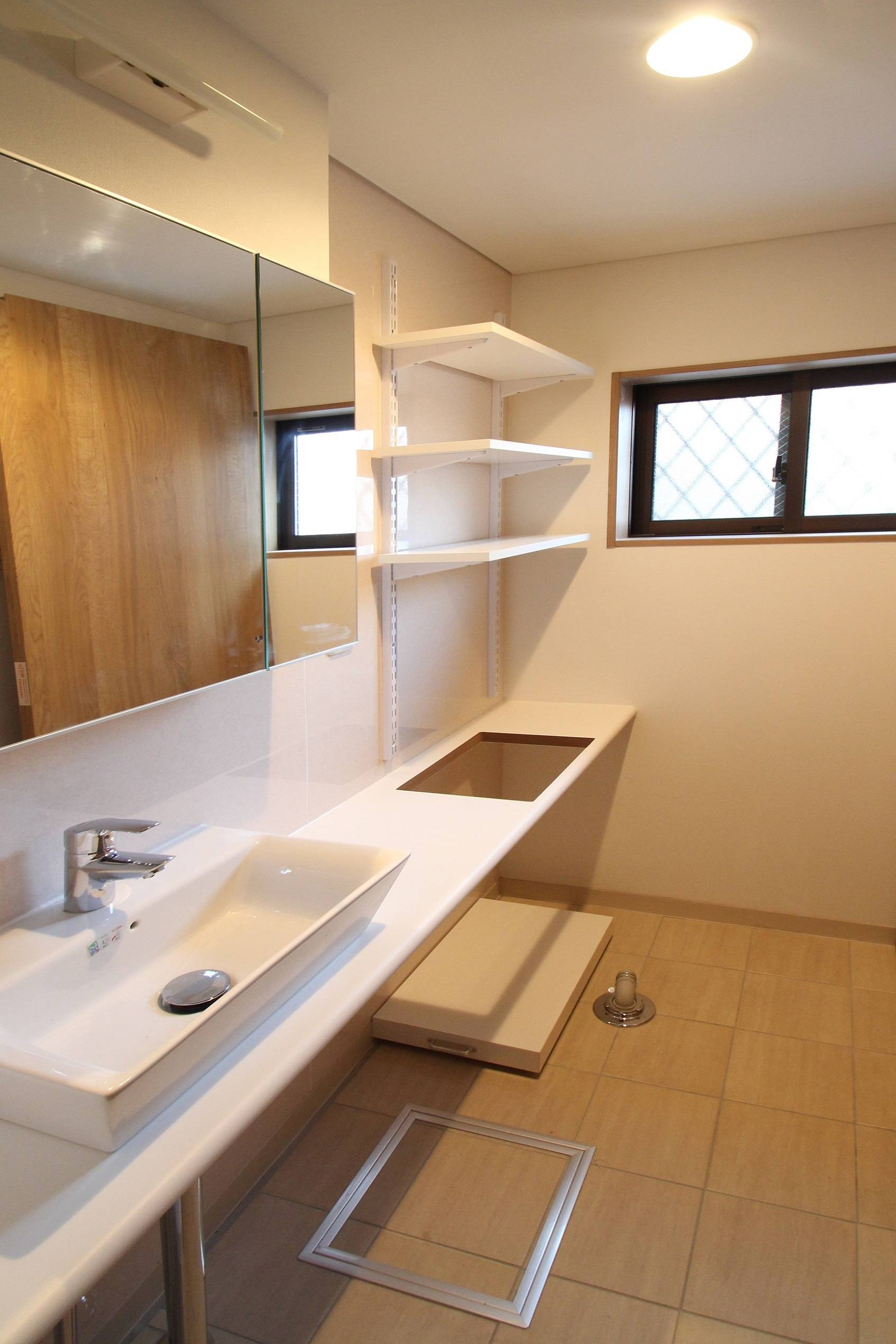 玄関ホールと洗面所が無い不便さを解消するため、小さいながらも玄関ホールをつくり、和室の居間を広げ、フローリング貼りにし、キッチンをつけることで、リビングダイニングキッチンとしました。とは言え、小さな面積ですので、作りつけのソファーをつくり、テレビ台を組み込んだ食器棚やソファー上部の吊戸棚、キッチンの廻りには家事がし易くなる収納を作りつけ、コンパクトながらも生活し易いLDKを実現しました。洗面所も新たに作りオリジナルの家具の工夫で、小さくとも洗濯・洗面・脱衣が出来る空間にしています。