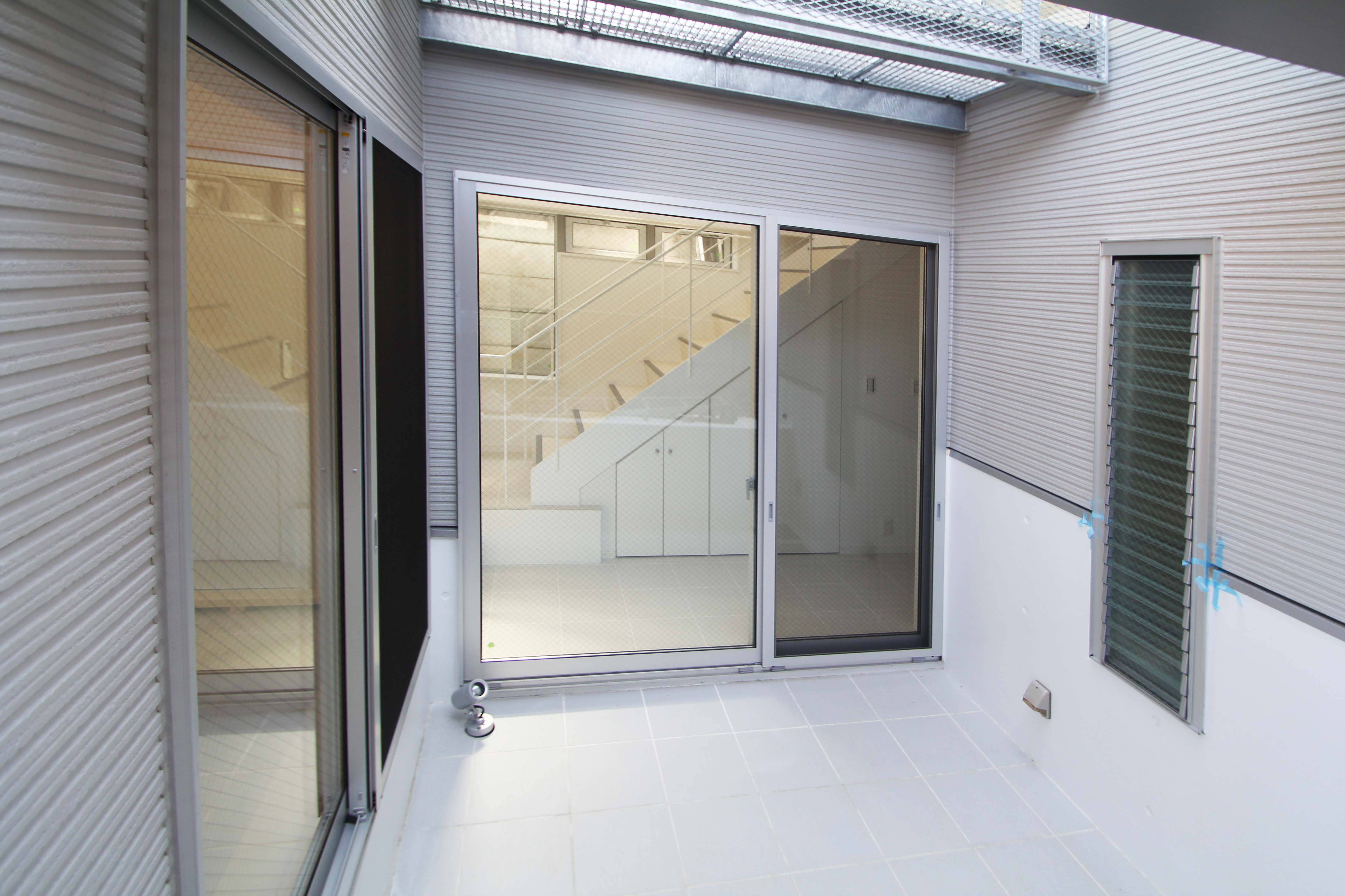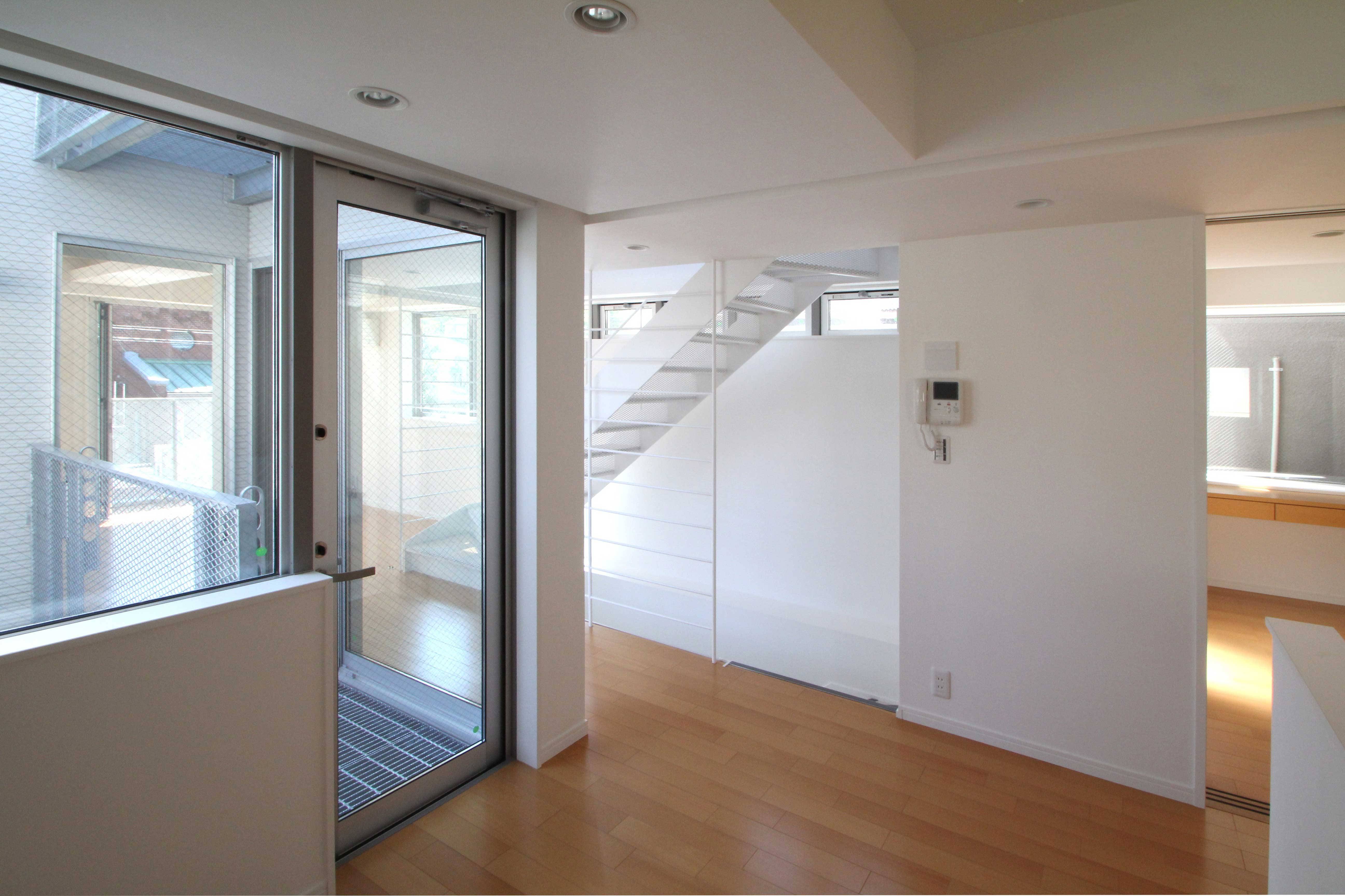 明るい家をつくる為、中庭を家の真ん中につくり、メッシュ素材でつくったスケルトン階段と共に光を通す筒となり、家の中に光をふんだんに取り入れます。プライバシーに配慮し、覗かれない様中庭には、ルーバー格子を階段には上下の横スリット窓とし室内が見えない様にしています。