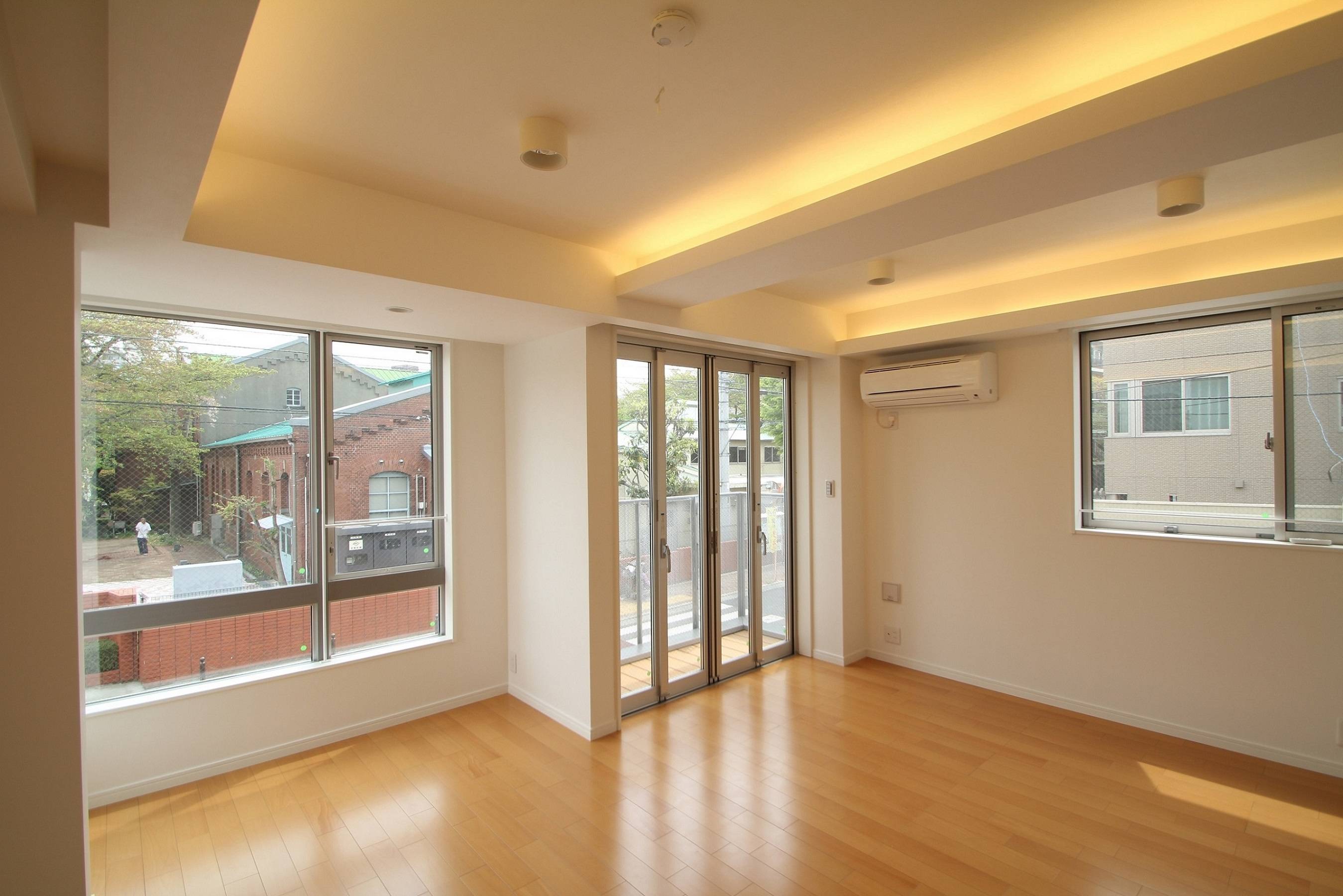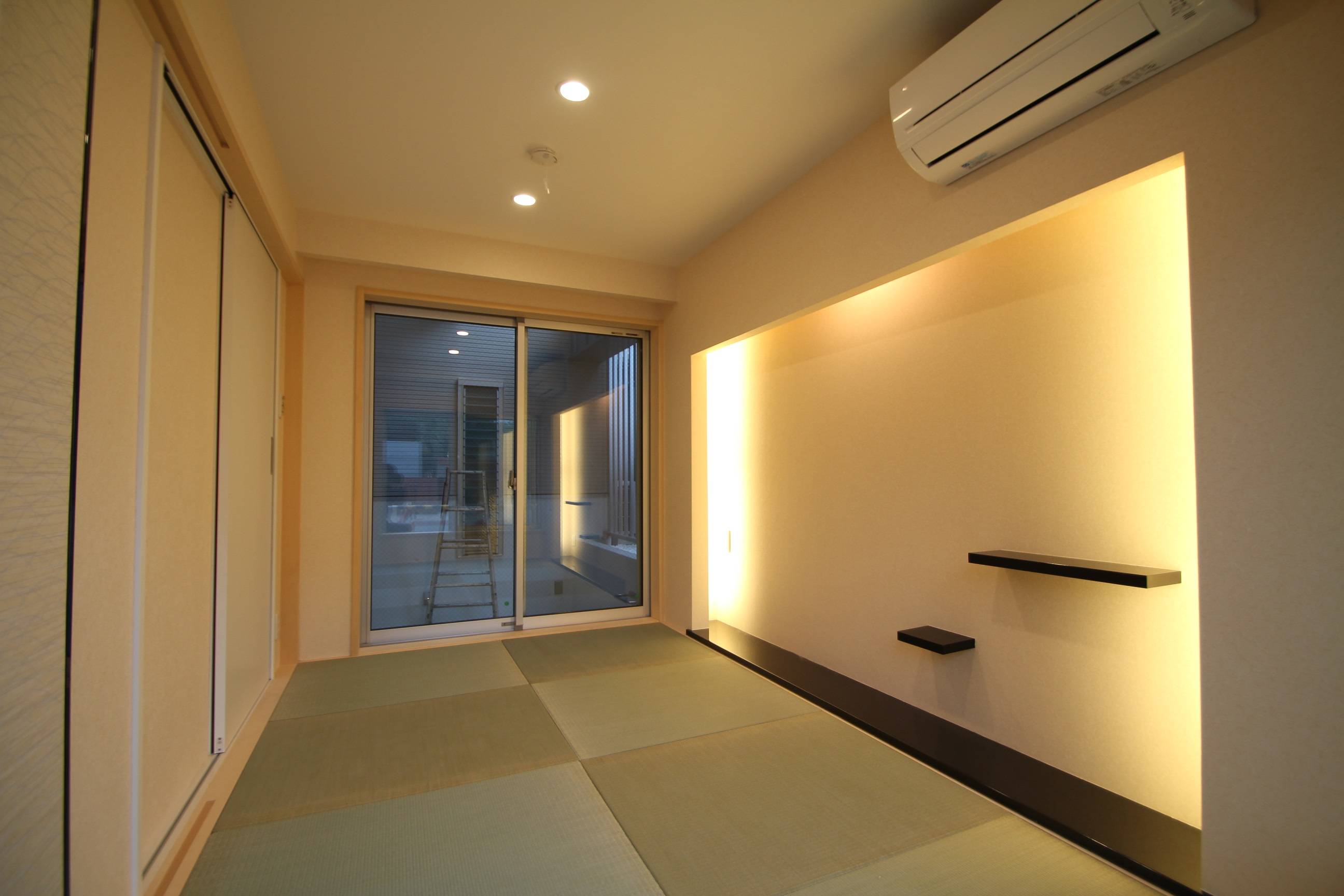 3階建ての建物とする為、1階を半地下にして、建物を下げ、階の高さを押さえる為に、鉄骨造ながら、天井ふところを小さくして、梁を出しています。この梁を利用して間接照明を仕込み、部屋の特徴に転換しています。天井高さは2.4mですが、中庭や階段の部分の抜け感があるので、開放感のある家になっています。