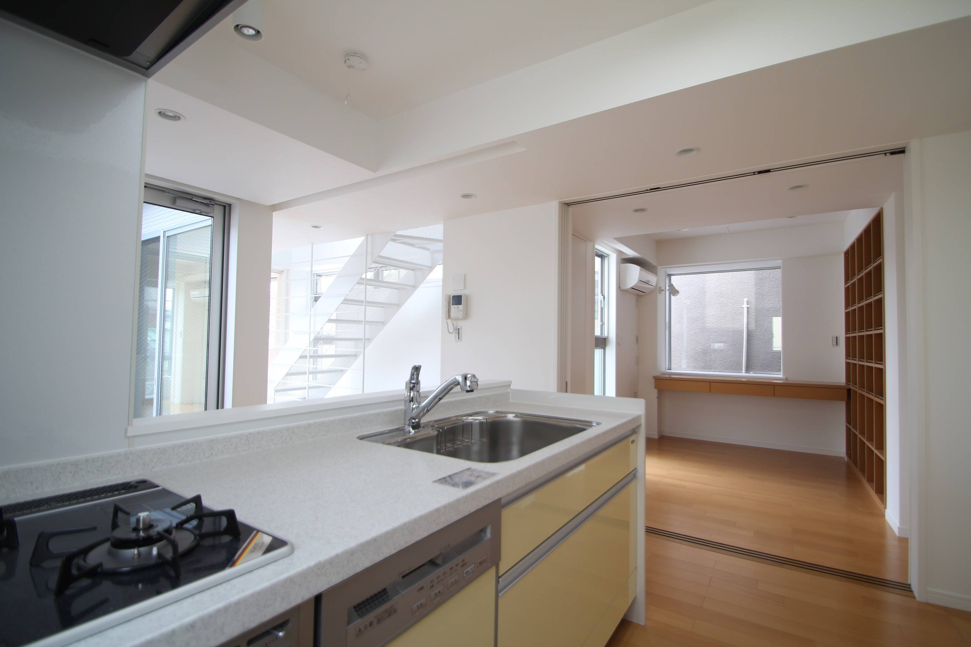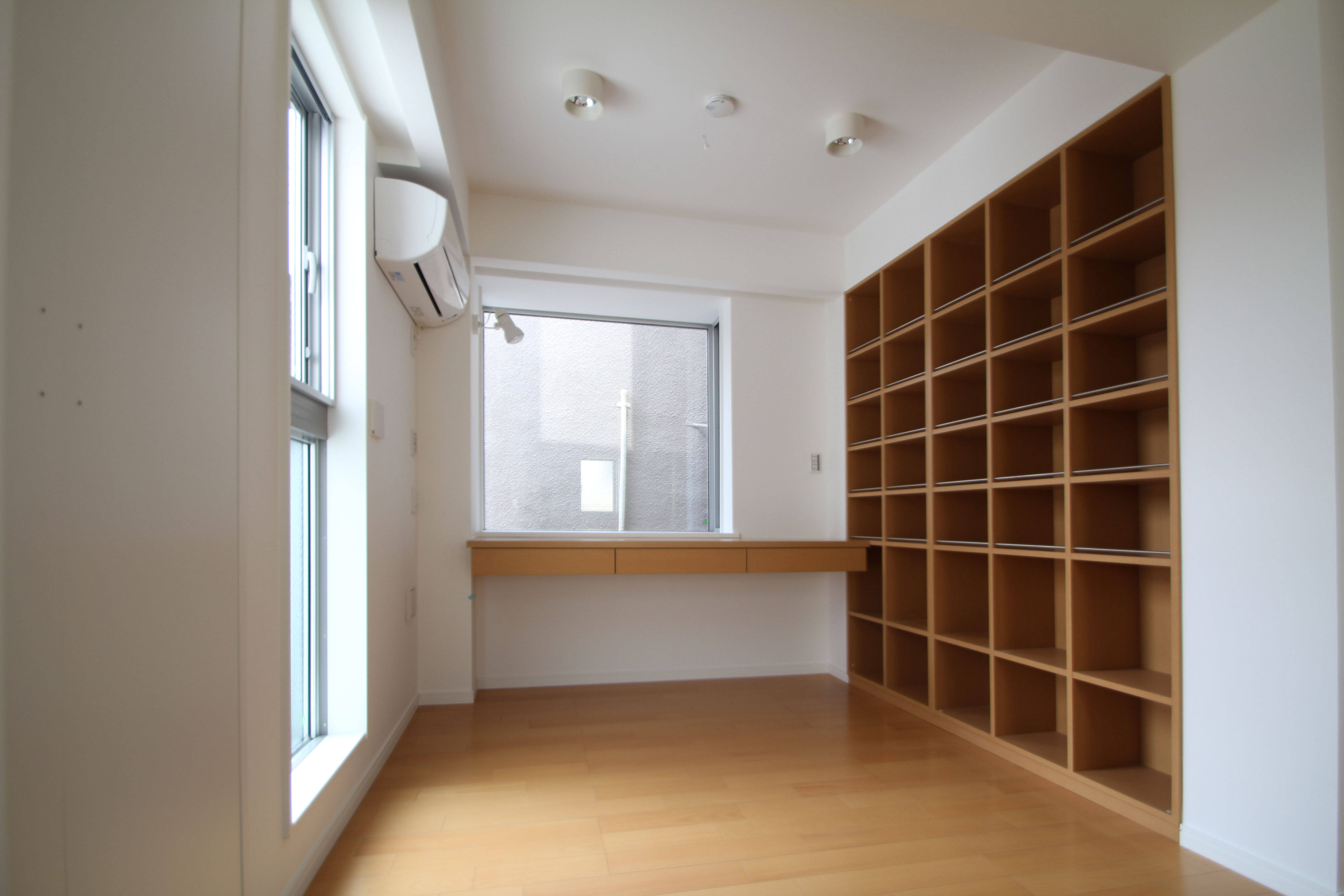 奥様のワークスペースには、趣味の本・DVD・写真集を入れる為、それぞれの大きさに合せた高さの棚の本棚を作りつけ、階段の横にも一面に本棚をつくり大量の本を収納する場所を確保しました。公園の桜を借景とする為、2Fの道路側にリビングを配置しています。屋上はバルコニーとし、普段は洗濯物干し、夏場は日焼けをしたり遊べるスペースになっています。