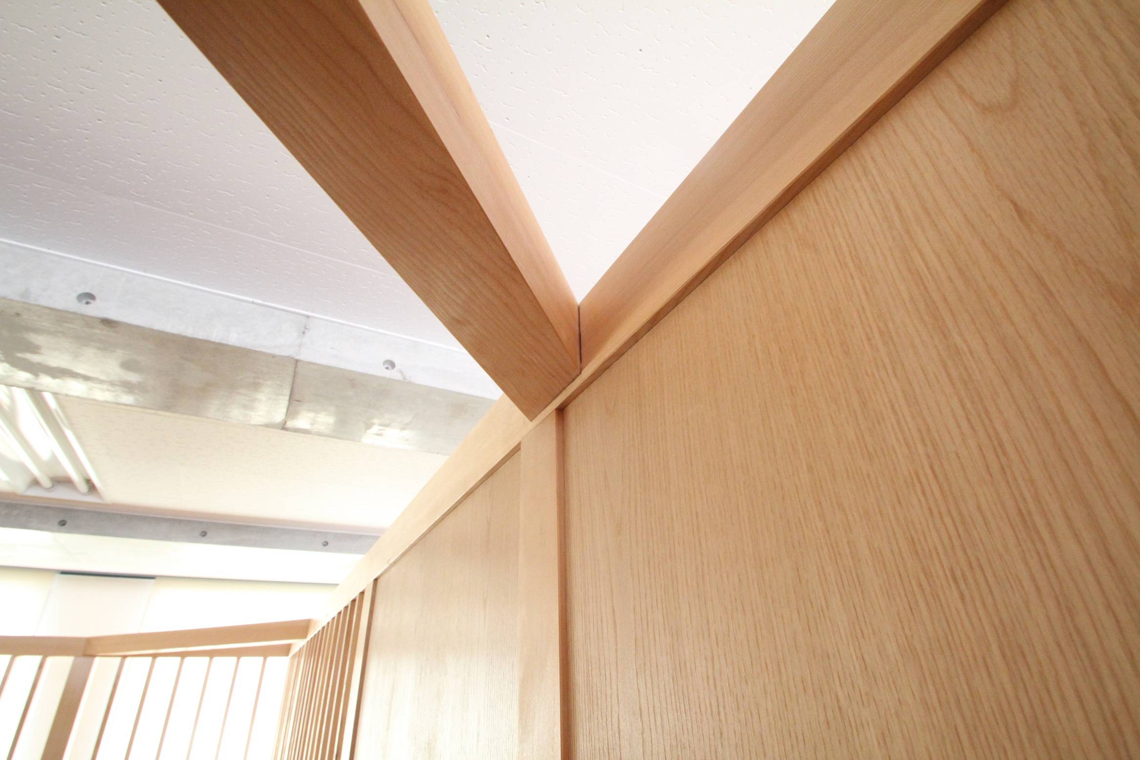 木の箱は天井まで壁とせず、上部をあけておく事で、部屋に抜け感が生まれ、せせこましい印象が無くなります。天井を工事しなくても良く、コストを抑えられる事を出来ました。