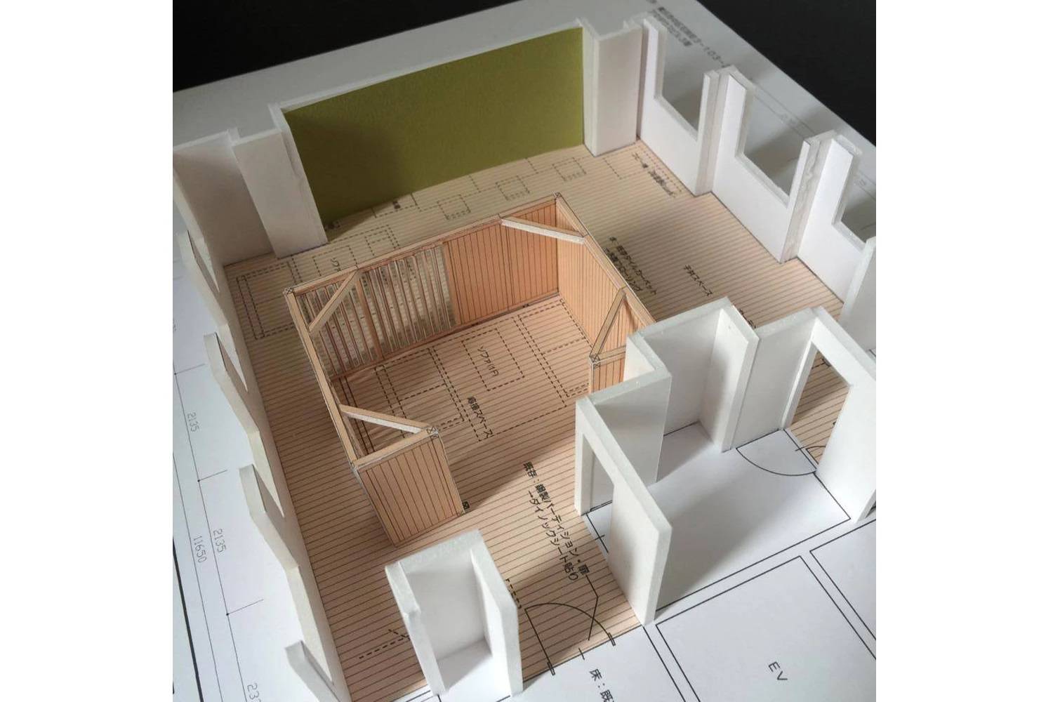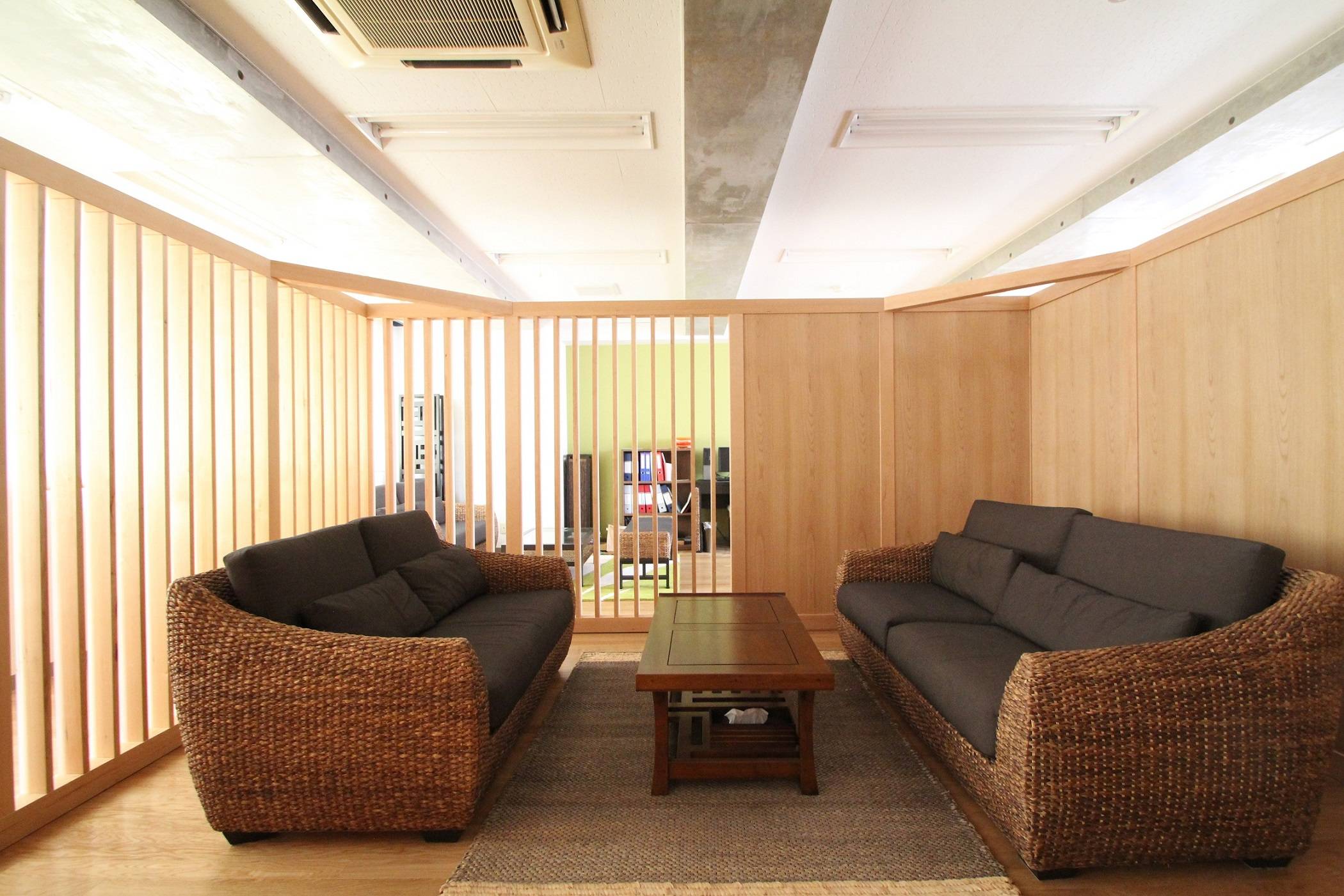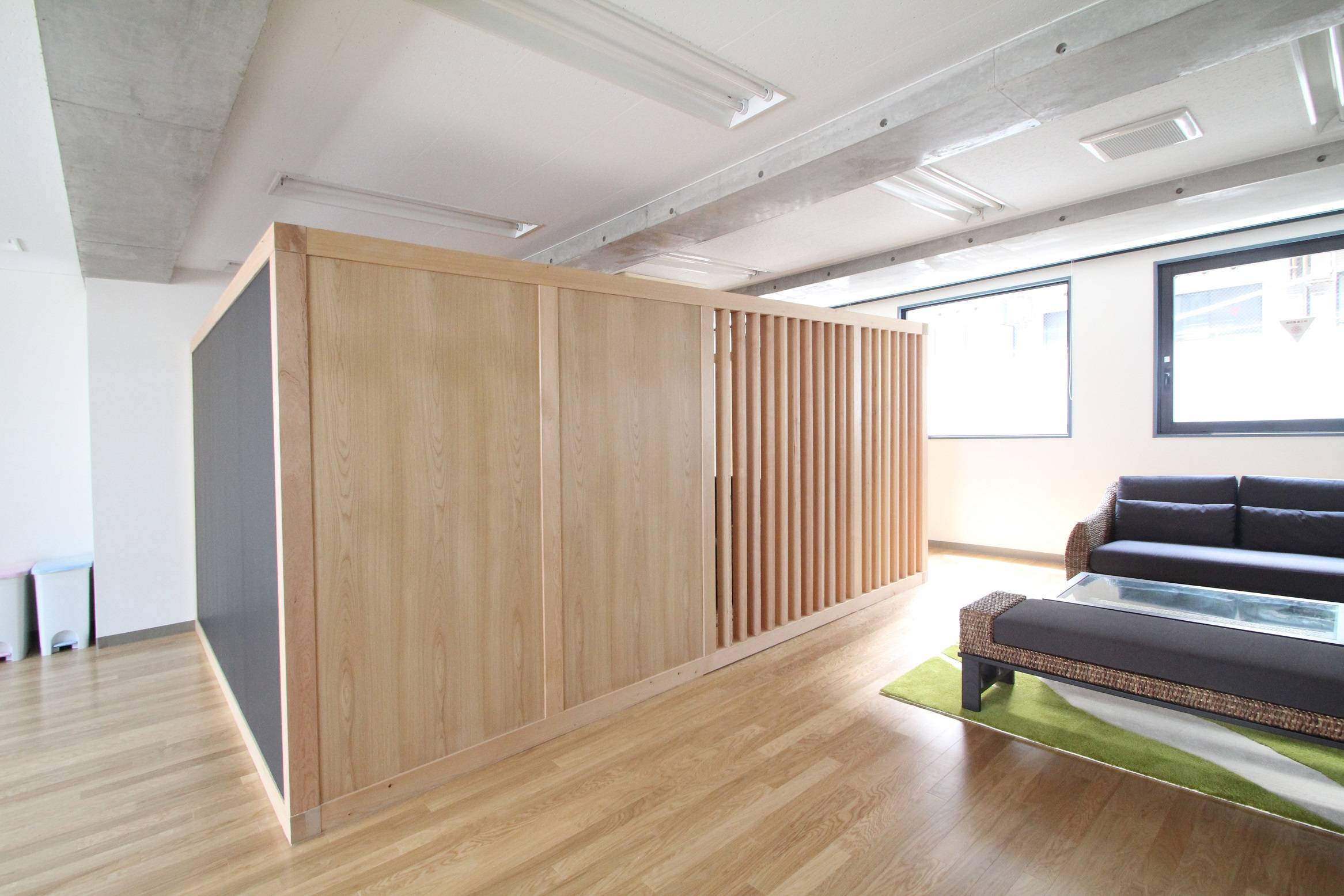 木の箱は、木のタテ格子の壁・木の壁・黒板の3種類の壁をつくり、来客スペースからは子供の遊び場・執務スペースはで見えません。一部、木のタテ格子の壁がある為、木の箱の中で何が話されているか、執務スペースからは感じ取ることは出来ます。子供スペース側は、黒板の壁とし、子供たちが自由に絵を書き、遊べる壁にしました。大人もミーティングで使うことが出来ます。