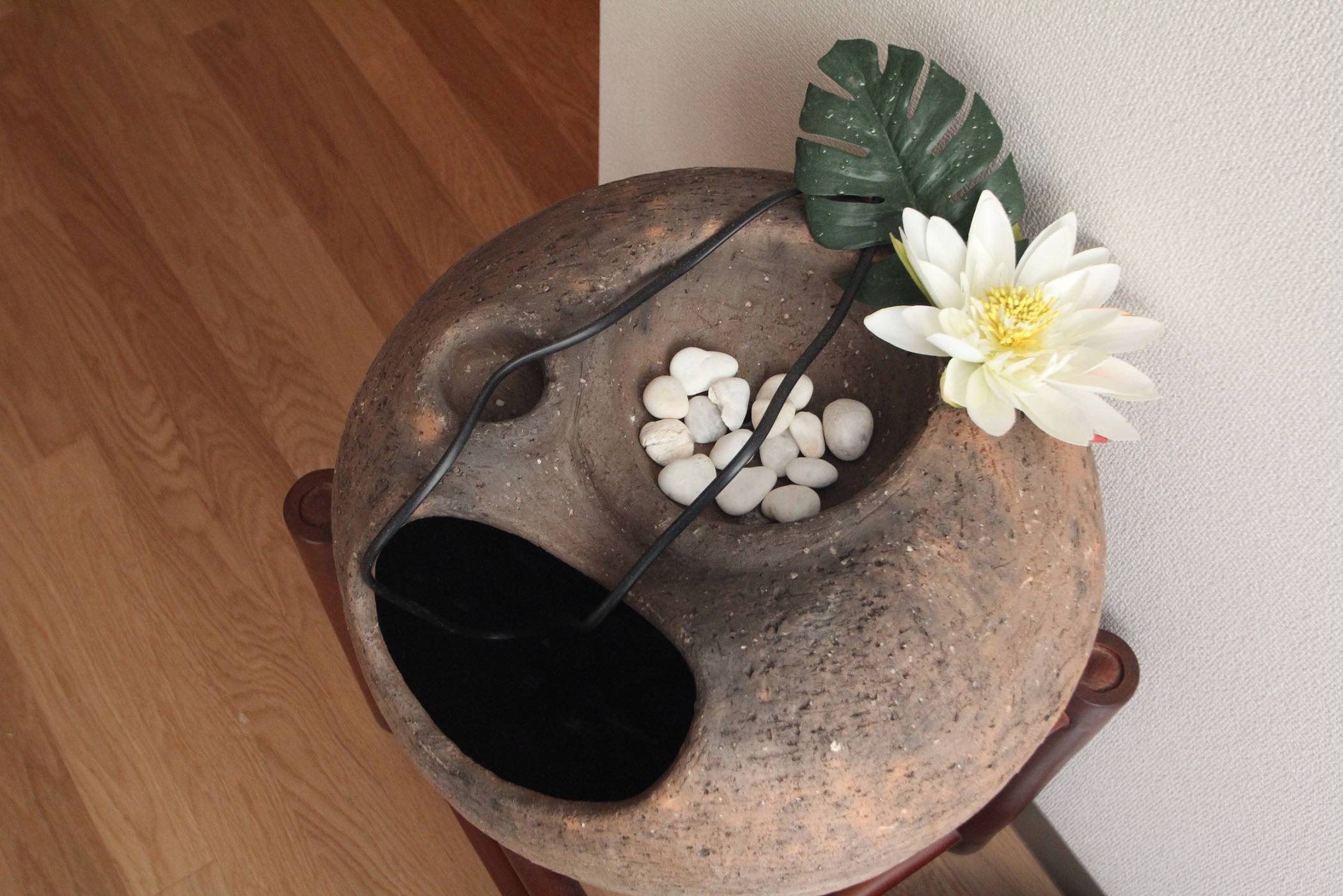バリ製の家具のソファー・ローテーブルに合せ、床はナラのフローリング、木の箱はツガ材でつくり、タテ格子がアジアの雰囲気をつくり、バリ製家具にフィットした、デザインとなっています。