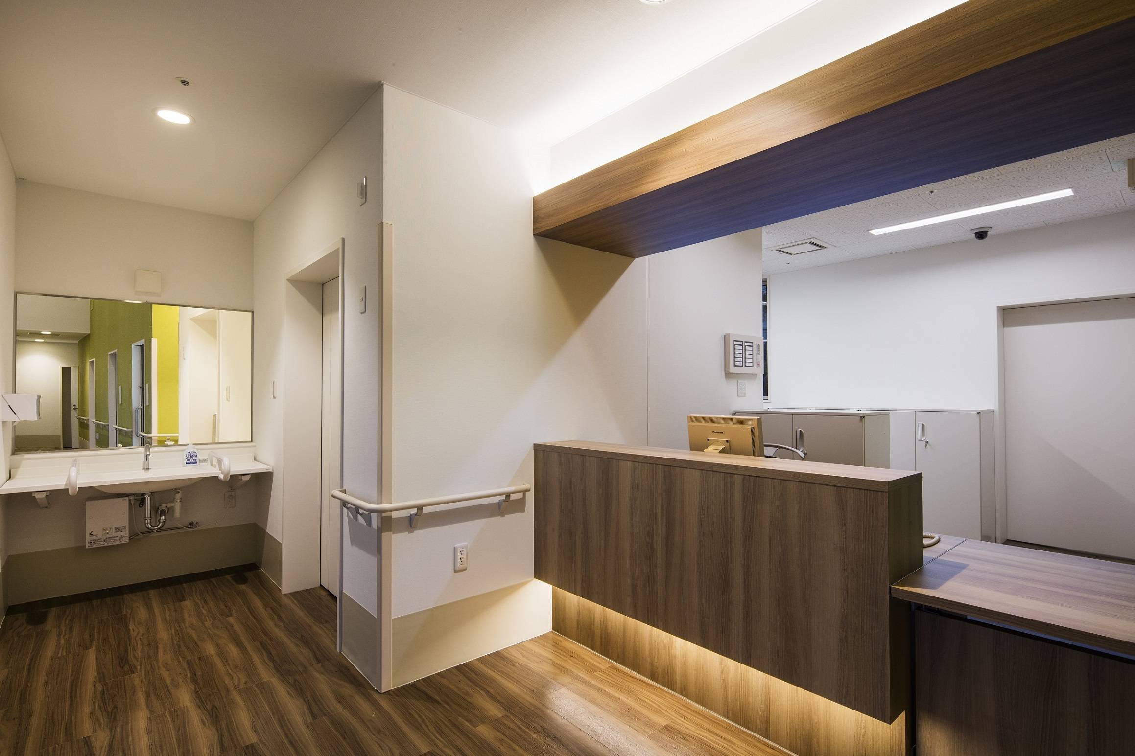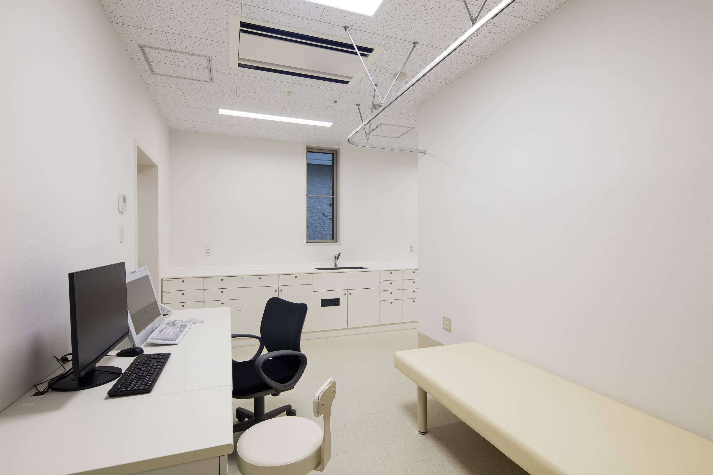 バリアフリーとしての、フラット床・手すり・幅の広い扉やトイレ・廊下など、高齢者施設を数多く設計してきたノウハウを組み込んでいます。また、患者さんとお医者さん・看護師さんの移動する場所が、重ならない様に、患者動線・スタッフ動線の2すじの動線をつくり、診察等がし易い間取りとしています。