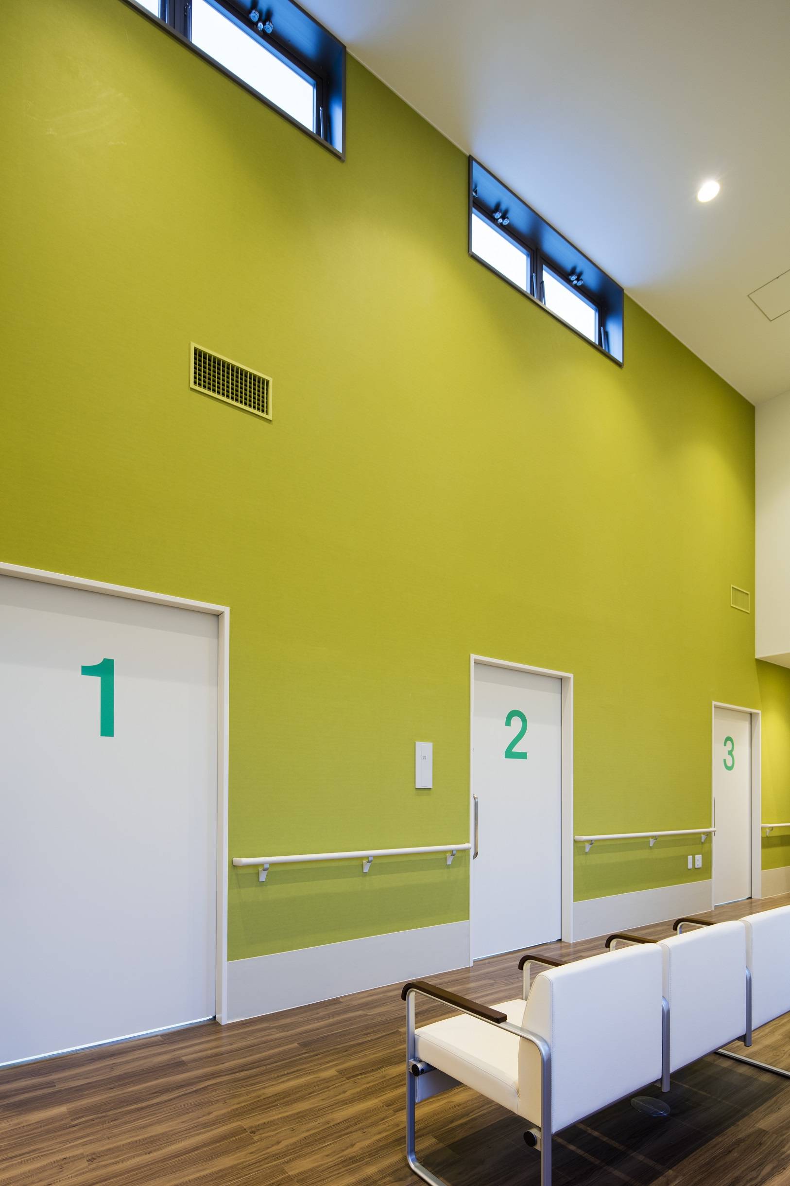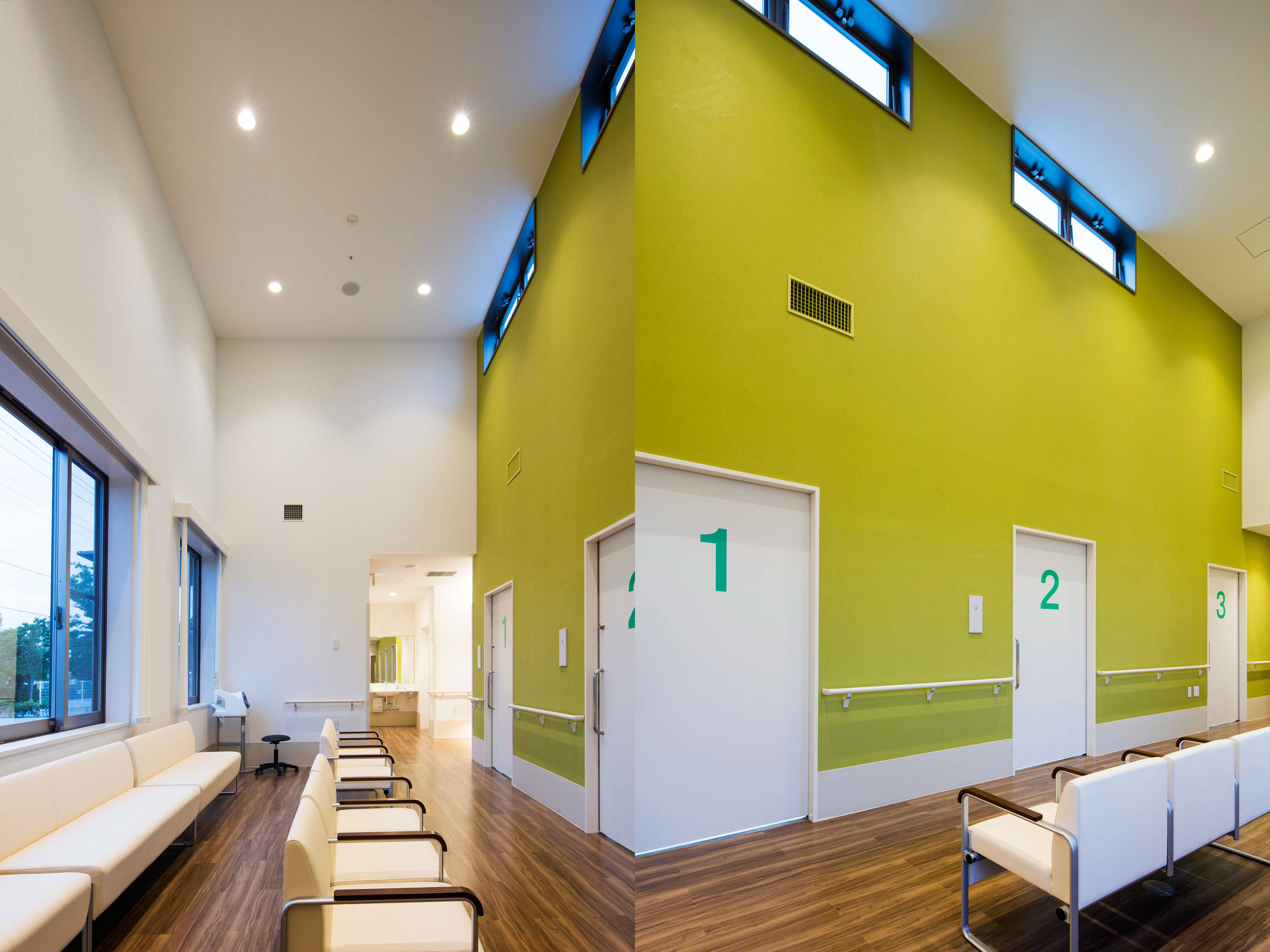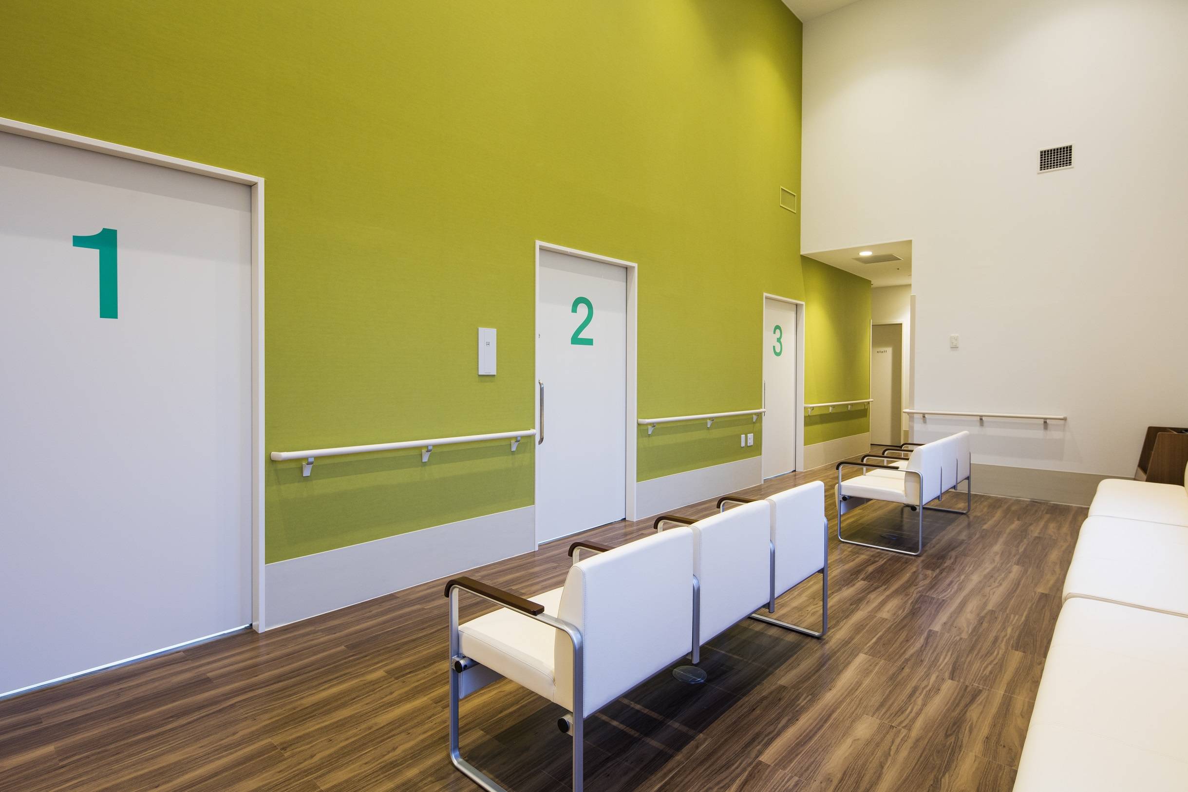待合室のダークトーンなフローリング調の床材と、若草色のアクセント壁が、落着きを与え、時間を心地よく感じられる空間となっています。