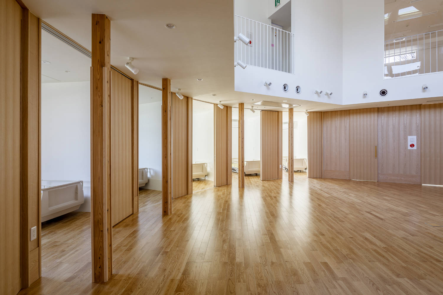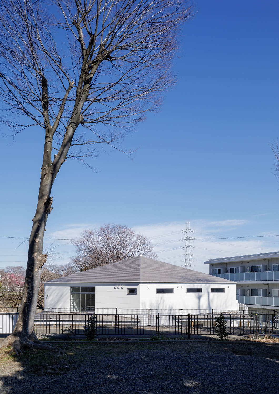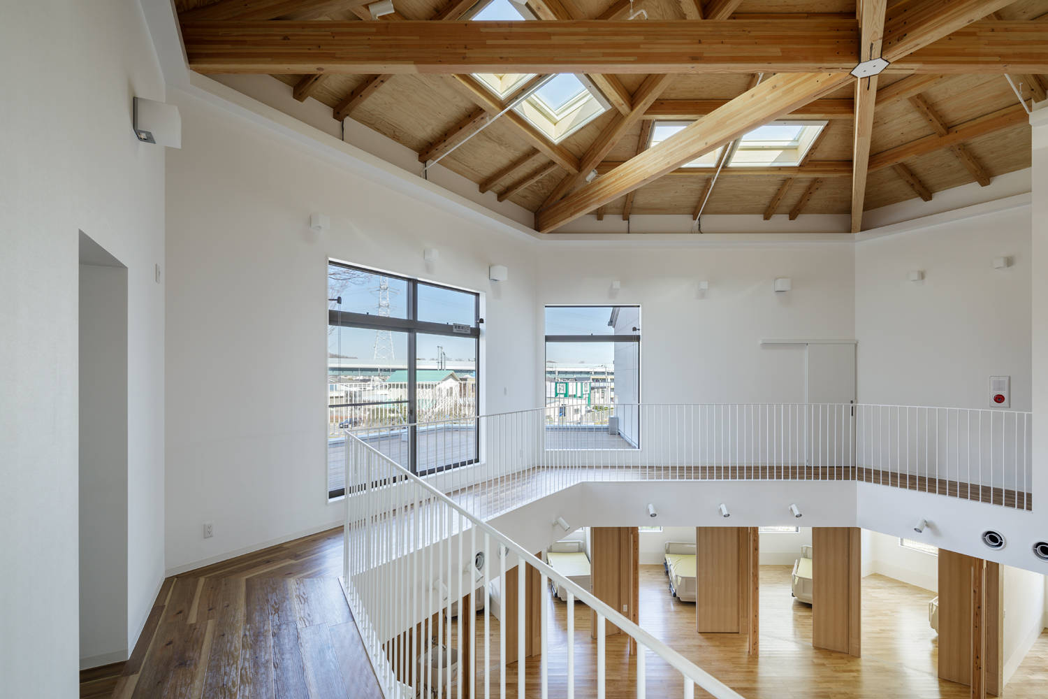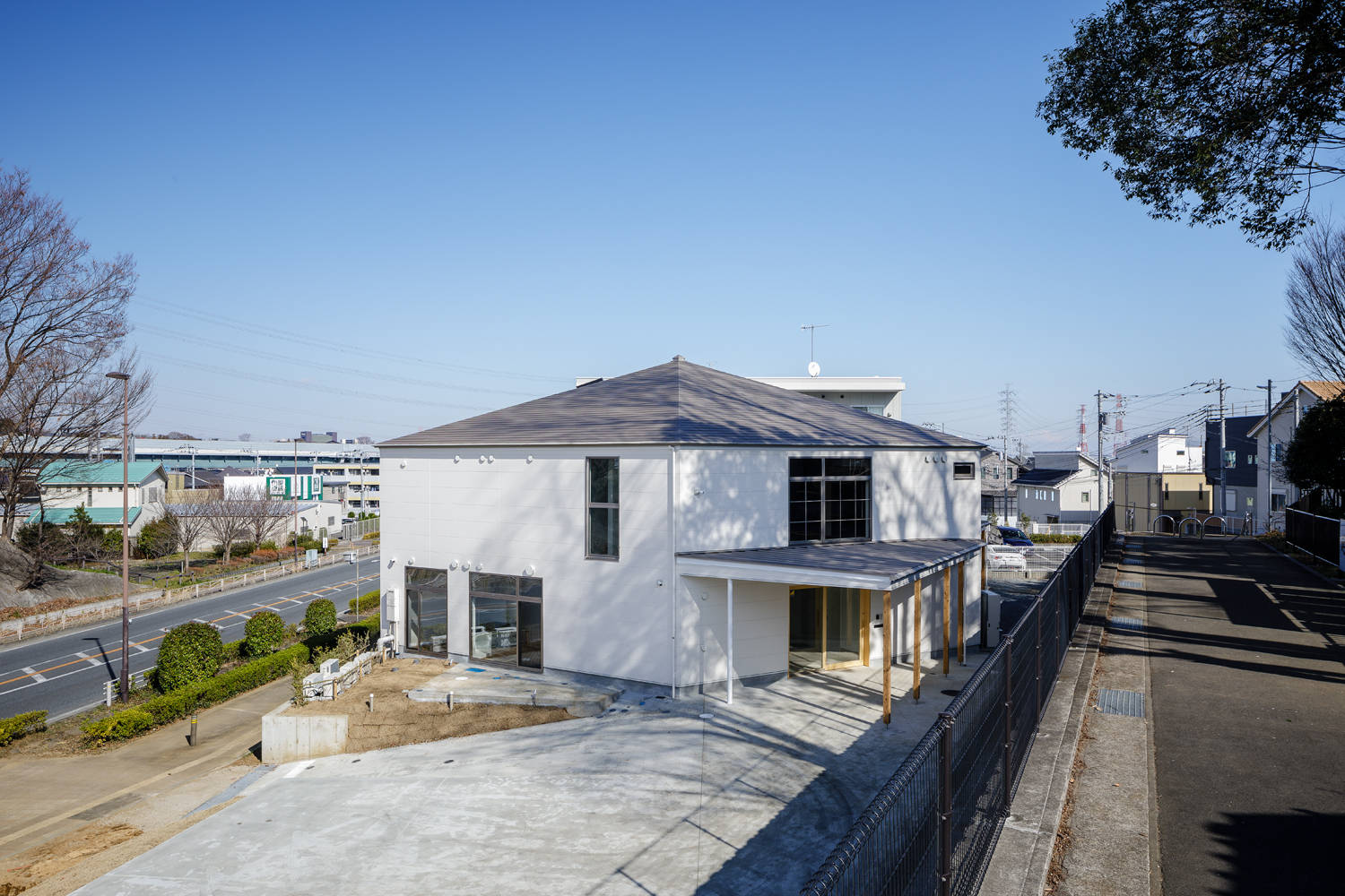 地域の福祉拠点となりながらALS(筋萎縮性側索硬化症)など、介護度の高い患者を受け入れる、在宅ホスピスとしての看護施設である。地域と繋がり開くことと、介護度の高い患者が利用する為の清潔さを保つ為の防御を両立させ、かつ、地域の拠り所となる求心性を持つ空間構成をリビングホールの構成により実現した。