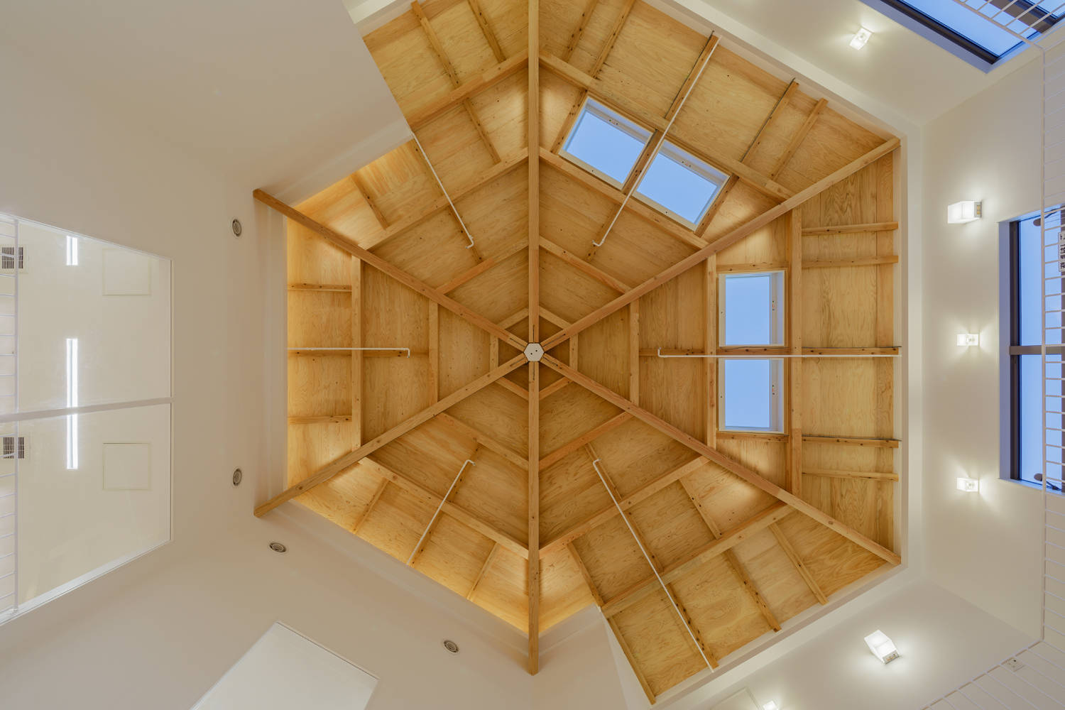 光を取り入れる2階の白を、木の屋根と、1階の木の床壁の空間が挟み、反射光を取り入れた明るい空間と、心地良い木の空間を同居させた。