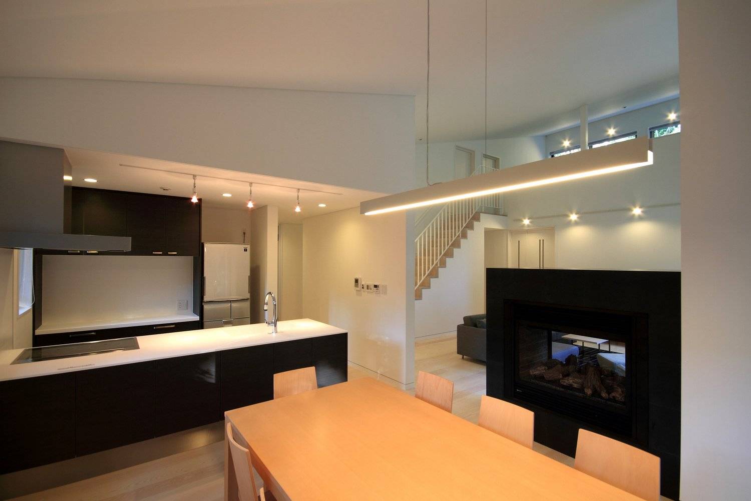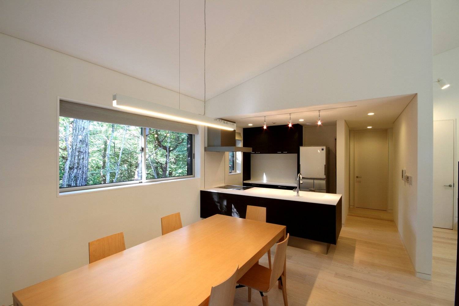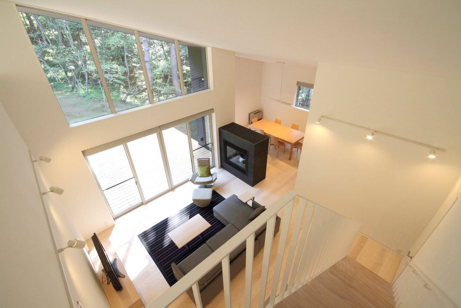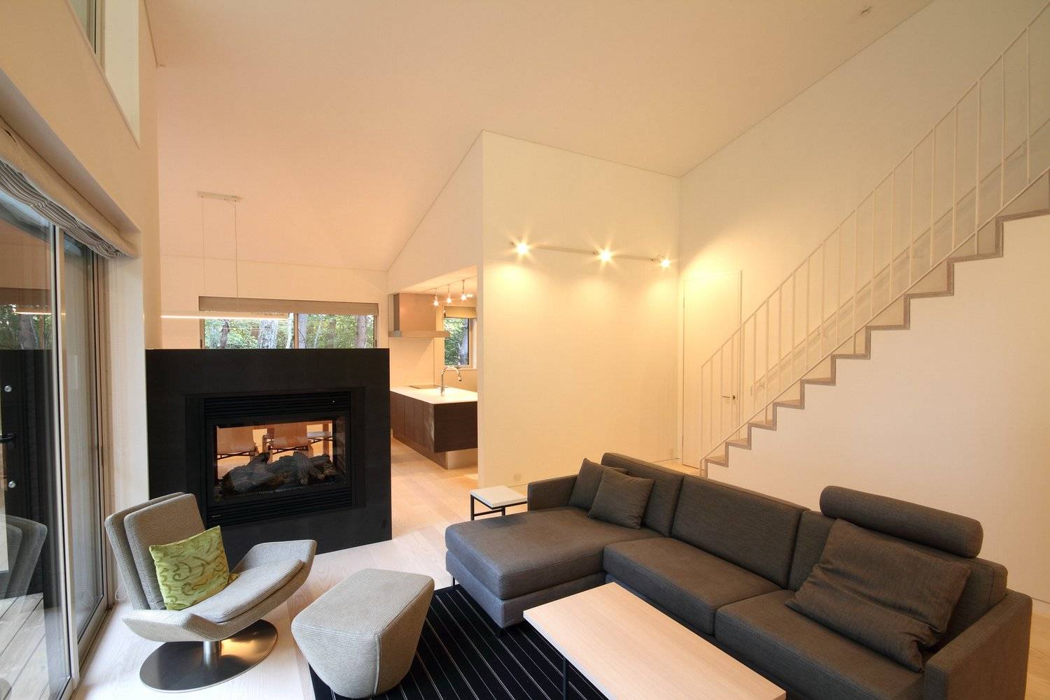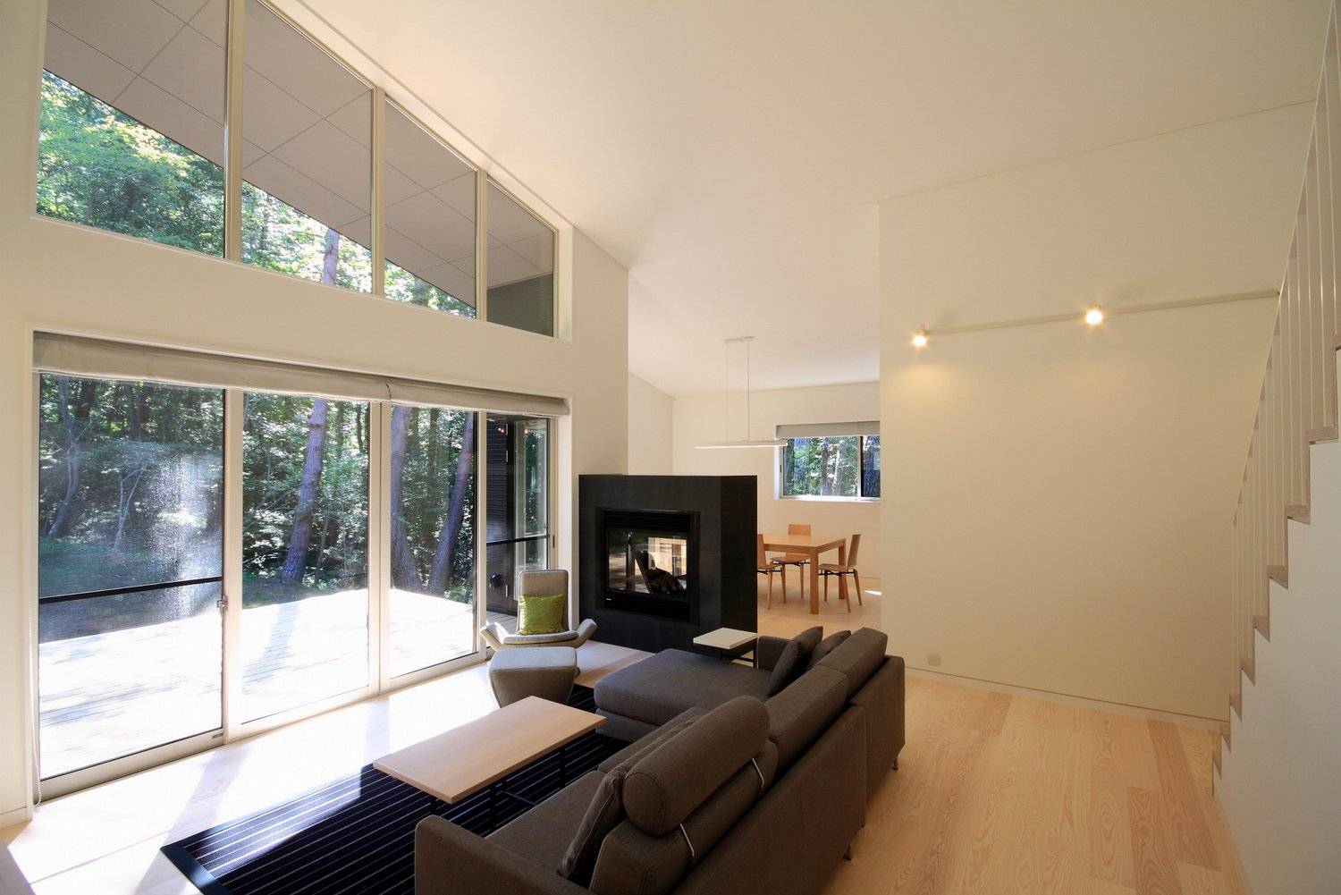 ほぼ正方形の平面プランの中心に、正面のカラマツ林を見渡す事の出来る大きな窓を持つリビングルームは約5mのゆったりとした天井高さがあり、2面にガラスの開口を持つ暖炉を挟んでダイニングキッチンと繋がっています。リビング後ろの廊下を挟んで建物北側には3つのベッドルームを。南側にはパウダー・バスルームが配置されています。