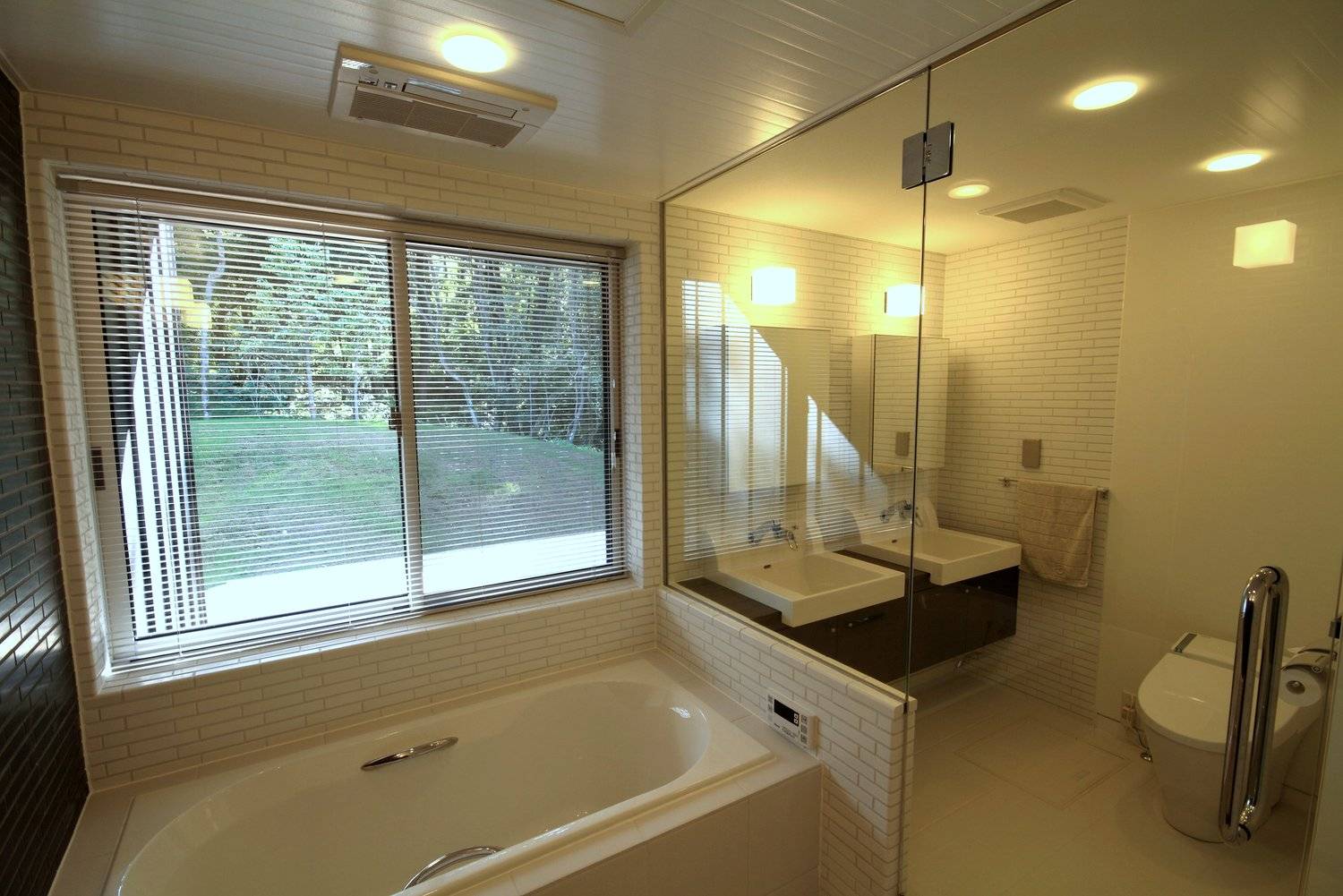 リビングとバスルームに面する南側の外部には、木々に囲まれ開放的な約20畳ほどの大きなデッキスペースがあり、リビングの大きな窓を開け放つ事で内部と一体的な利用が可能となっています。