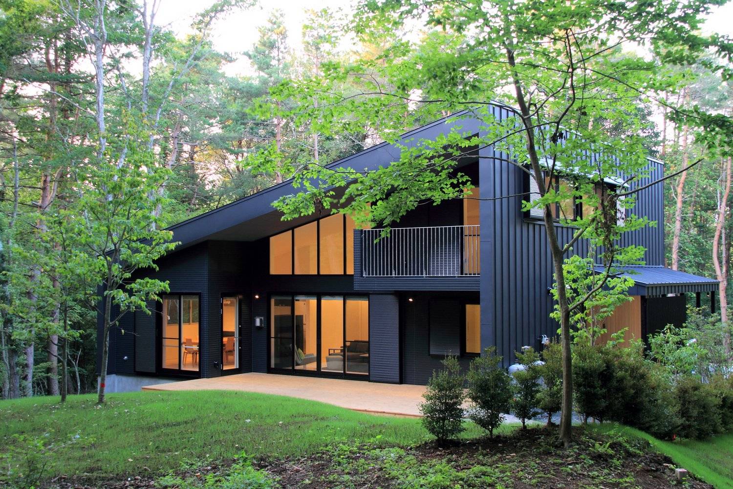 富士の北麓に広がるカラマツ林に位置する傾斜地に建つ別荘です。