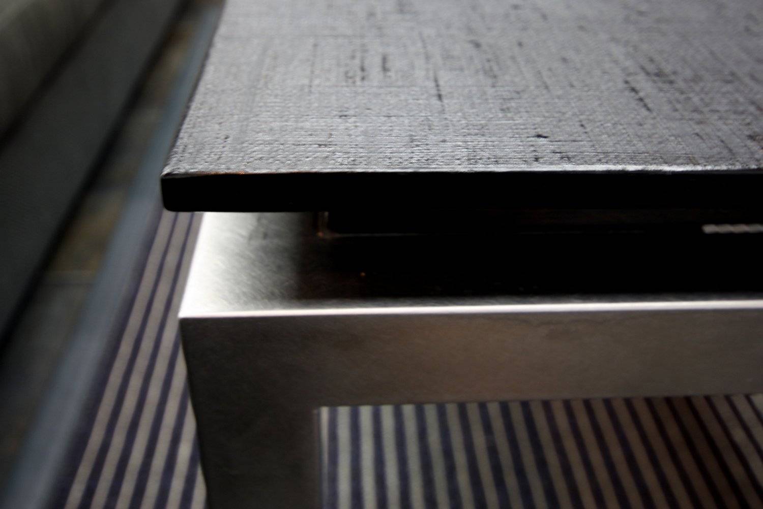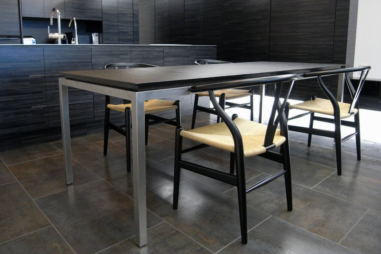 ステンレスフレームと漆塗りのトップを持つテーブル、ステンレスの厚板を使ったアイランドキッチンはオリジナルデザインです。