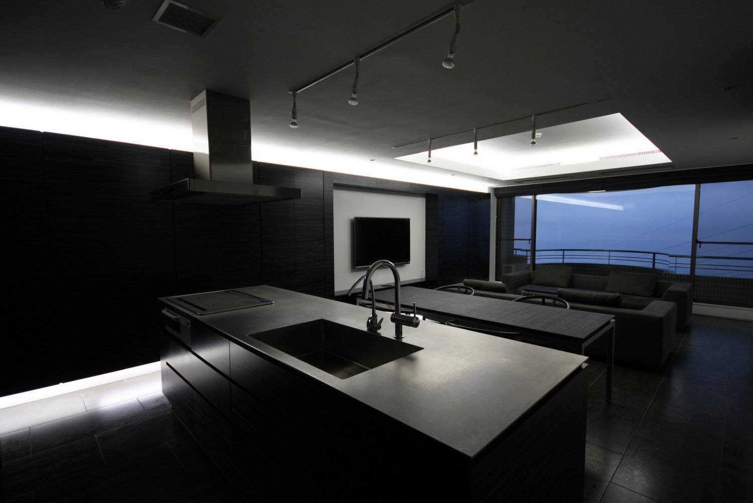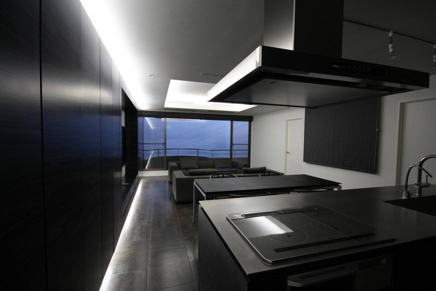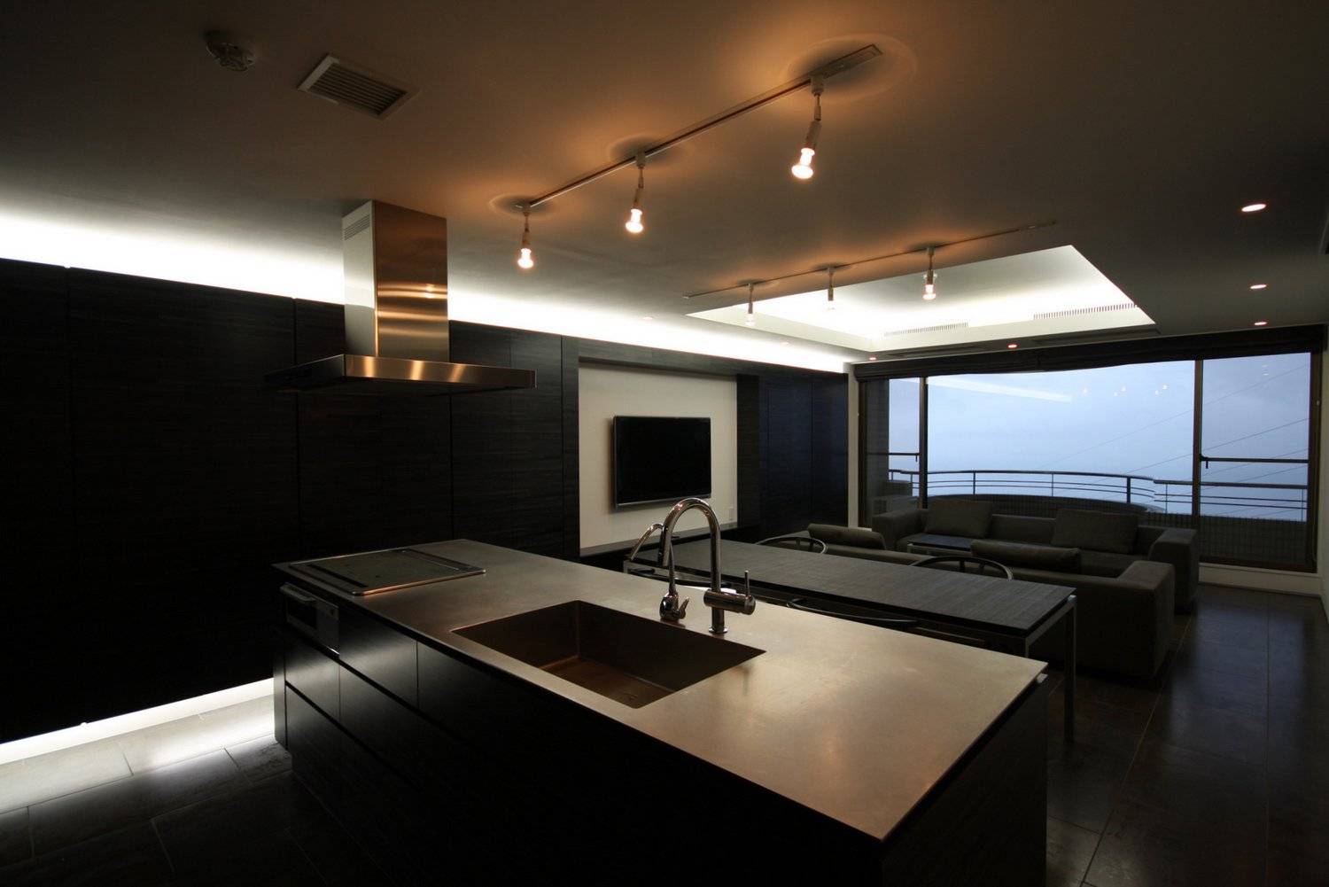 日常とは異なる雰囲気の中で、海を眺めながらのんびり過ごしたいという建築主の要望を受けて、この住戸の特徴である大開口からの景色を室内のどこにいても楽しめるように、既存の和室やキッチンなど撤去が可能な間仕切りを取り払い、リビングダイニングの面積を最大限に確保しました。そして窓際から順にソファー、ダイニング、キッチンを配置し、それぞれの窓への視線を遮らないようなレイアウトとなっています。