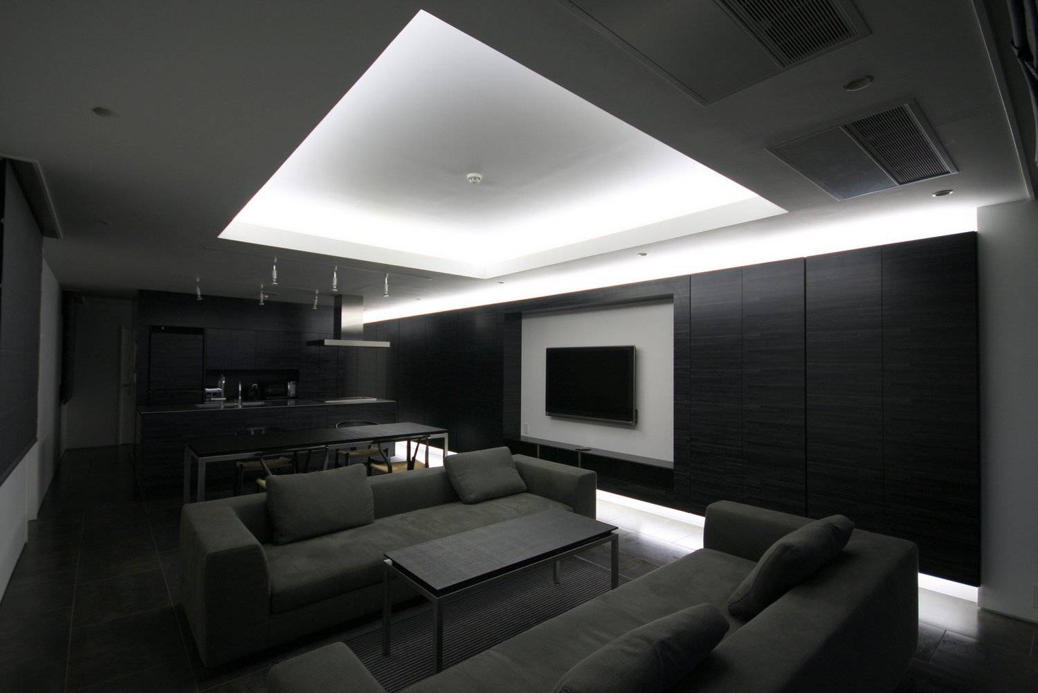室内は窓からの風景が引立つようモノトーンで統一しながらも、壁の染色された天然木の突板、床の金属的な質感を持つ大判タイル、そして漆塗りのテーブルトップなどの特徴的なテクスチャーを持つ素材を用いています。間接光を主体とした照明を用いる事で窓へ向かう奥行き感を演出するとともに、それぞれのテクスチャーを浮かび上がらせるように工夫しています。
