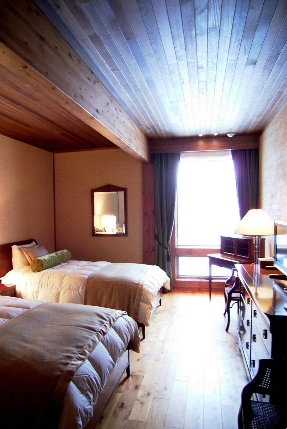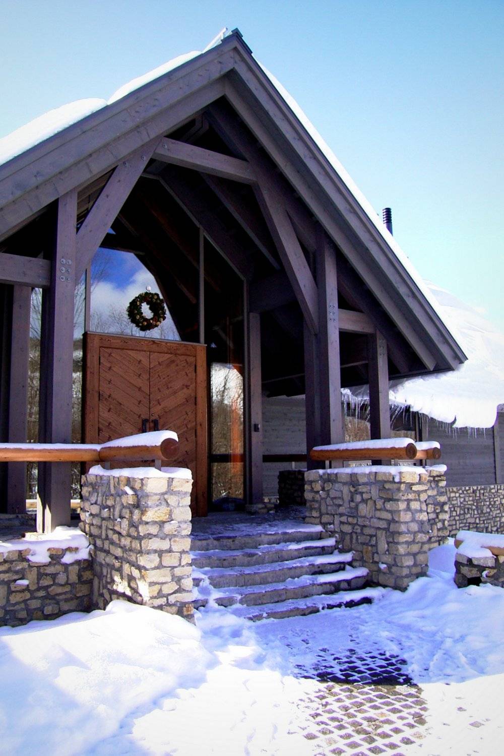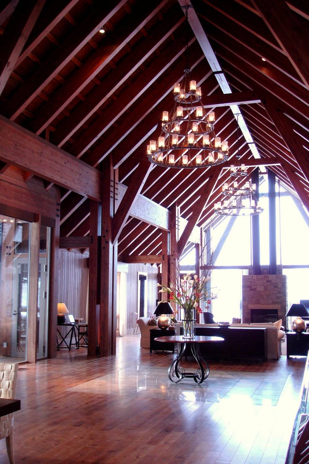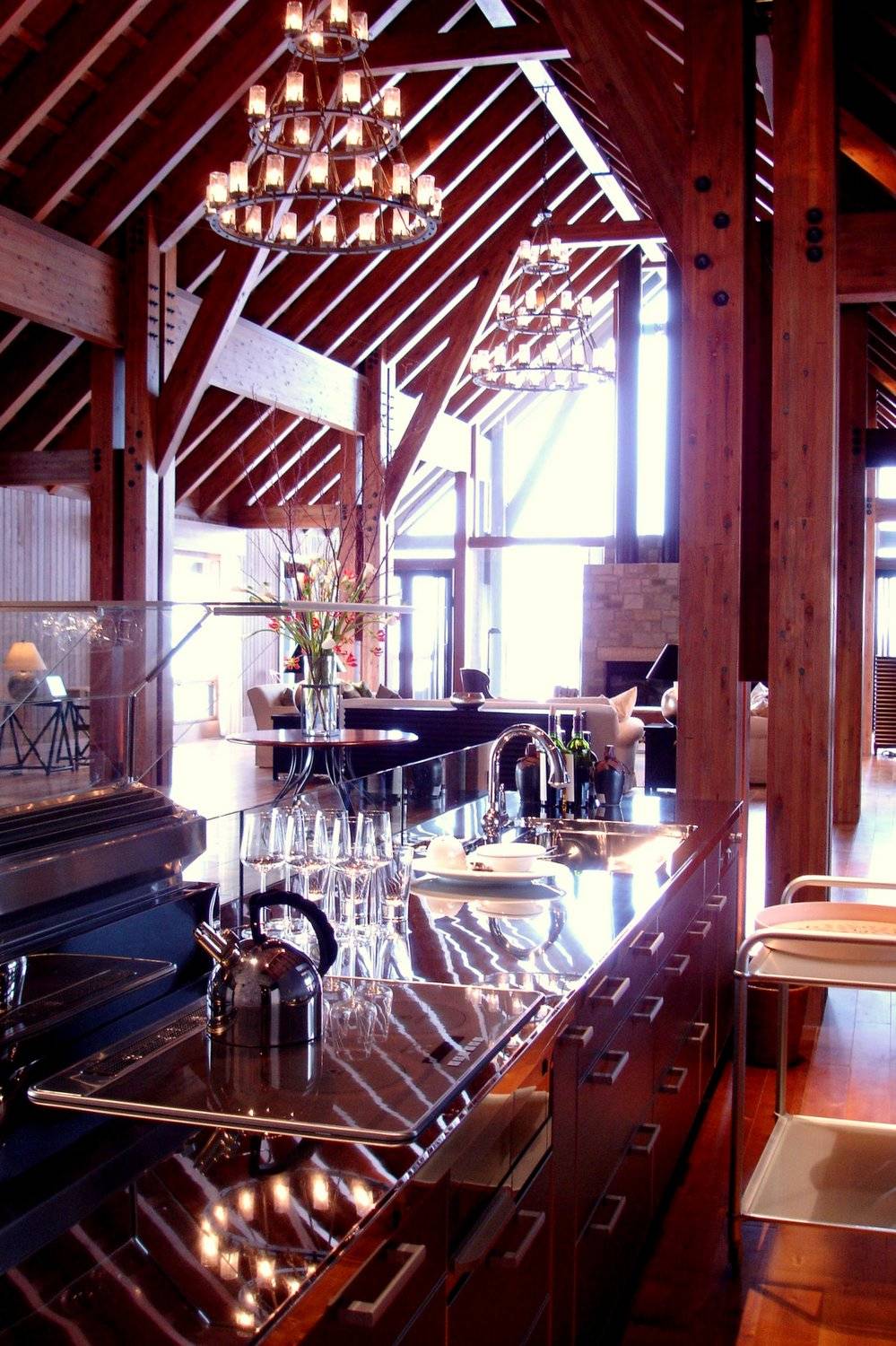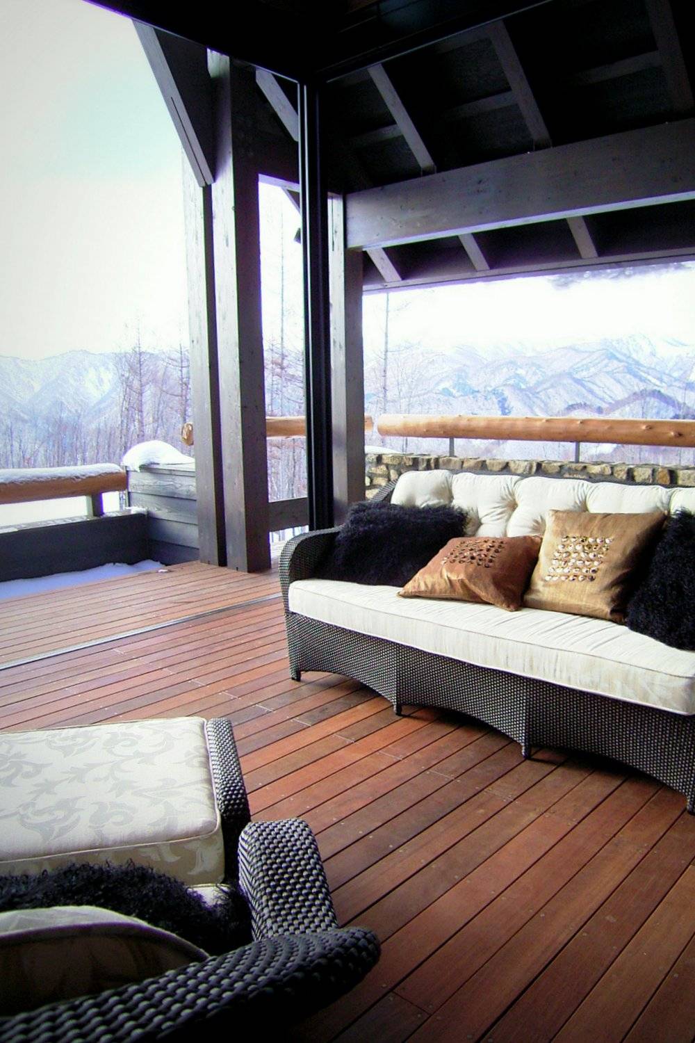 正面の大開口から山々を望む、リビング、ダイニング、キッチンなどのパブリックスペースは、最高7mの天井高さと約140畳の広さを有し、220mm角の集成材を4本組合せた柱を6.3mのスパンで配した大架構で、冬季には大きな積雪荷重のかかる9寸勾配の屋根を支えています。