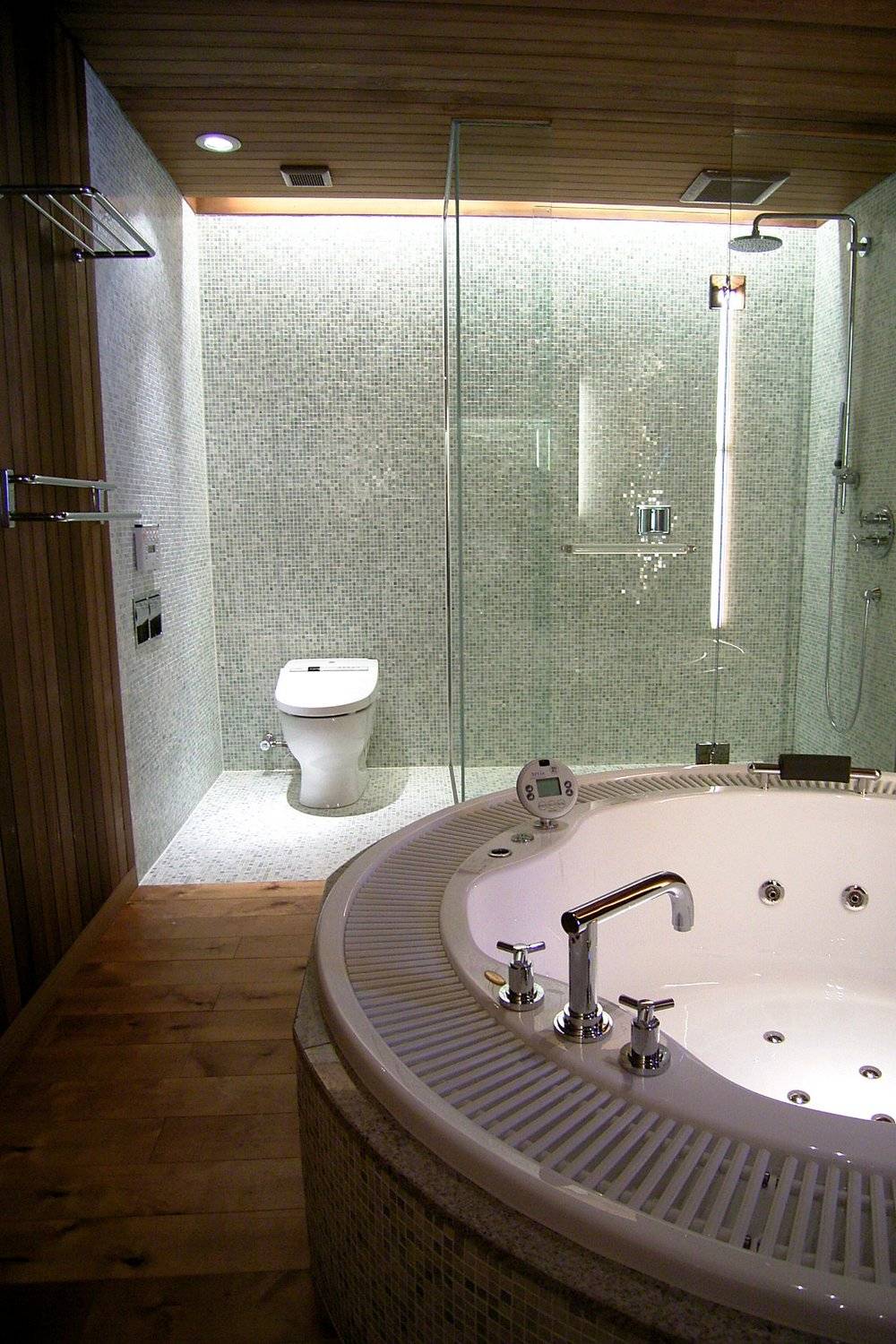 1階にはリビングダイニングとそれぞれパウダー・バスルームを持つ3つのベッドルーム、インナーガレージを配置。敷地に供給される温泉を利用した大きなバスルームは、窓を引き込む事で半屋外的な雰囲気の中で入浴を楽しむことができます。リビングに続く屋内のデッキスペースは、フルオープンの窓を開け放つことができ、半屋外のリビングスペースとして利用できます。