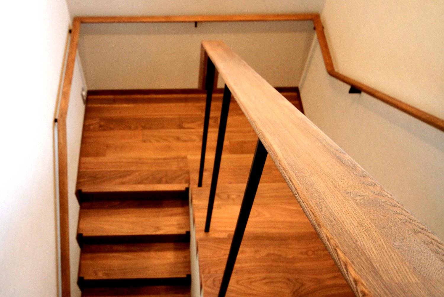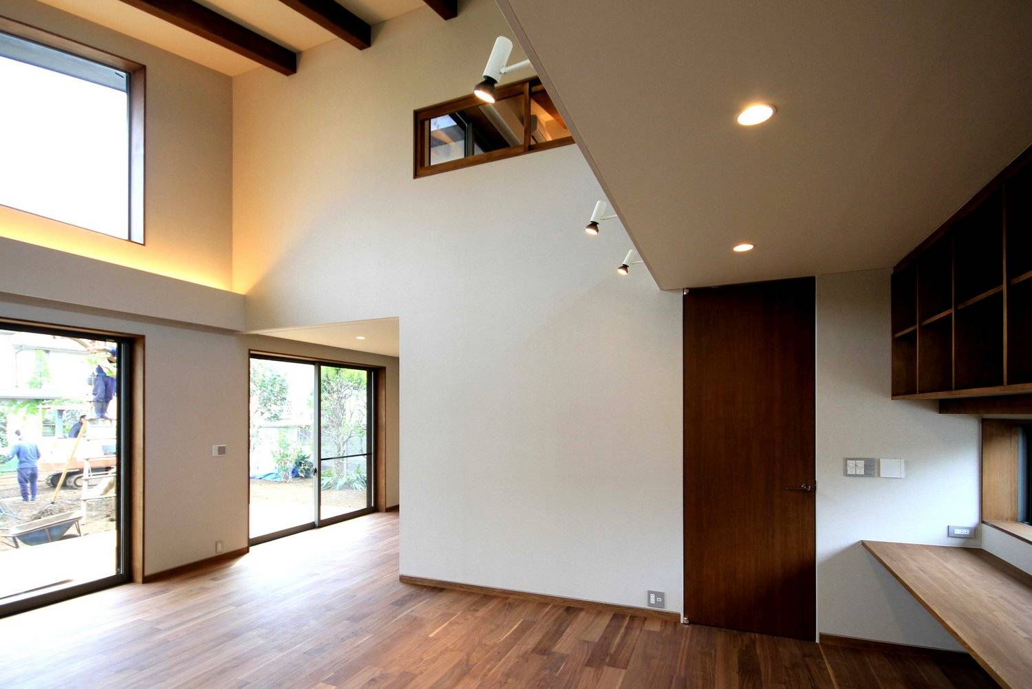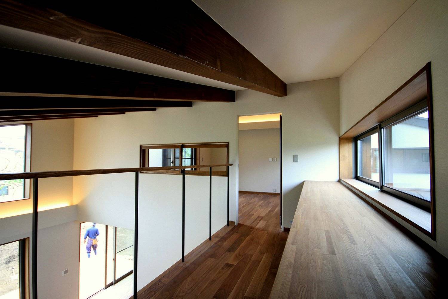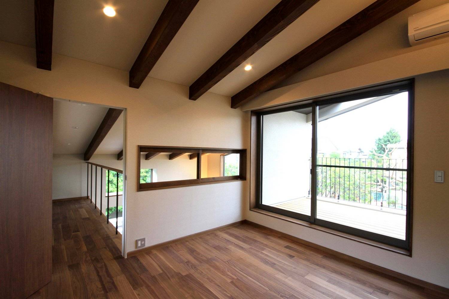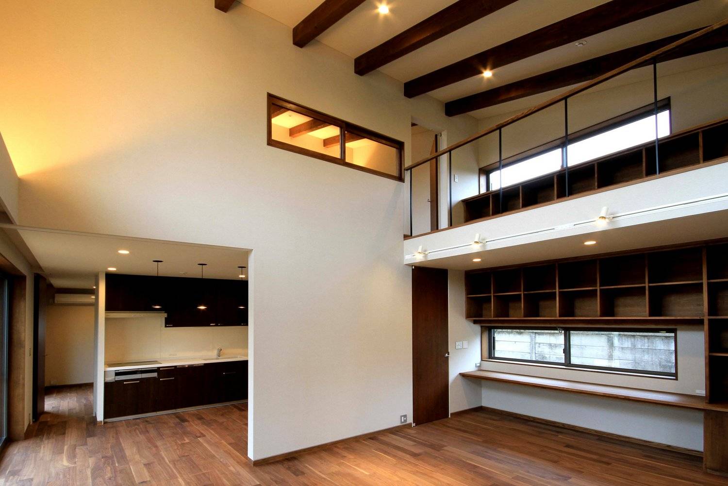 2階には前庭の全景を楽しむことのできる半屋外のバルコニーを囲むように2つの寝室。リビングの吹抜けに面した部分には書庫を設け、2階にも洗面とトイレを設けています。1階の天井高さは2.5mを確保。2階部分は小屋裏の梁をそのまま現した勾配天井となっており、面積以上にゆとりを感じることのできる空間となっています。