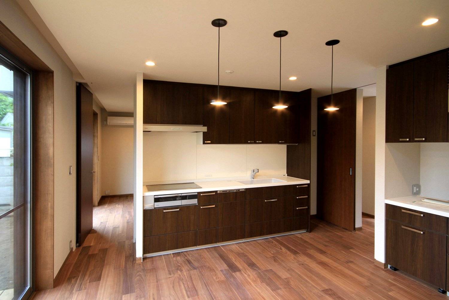 各階の構成は1階には吹抜けのあるリビングと機能的なダイニングキッチン、10畳の主寝室と洗面トイレと浴室を配置。北側の廊下とは別に主寝室、ダイニング、リビング間を行き来することができる動線を南側の庭に面して設けています。