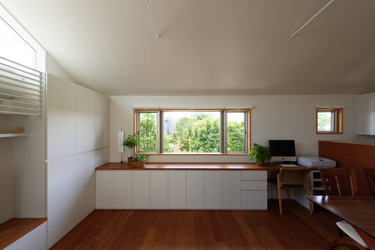 2階には庭と道路向かいの植木畑が望めるリビングがあり、地下から2階まで緑が楽しめる気持ちのよい家となりました。