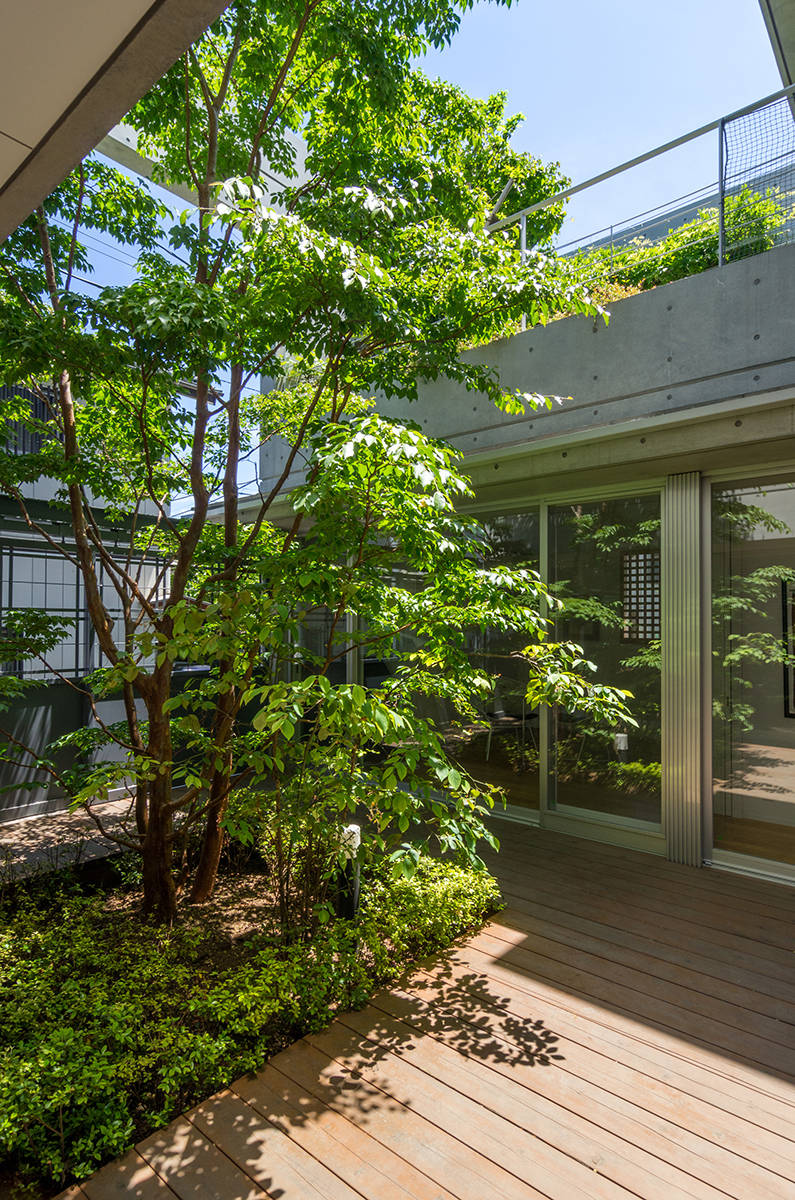 箱状の外形の中に各戸専用の中庭や共用の屋上庭園を内包し、プライバシーを守られながら緑と親しむ暮らしが展開します。