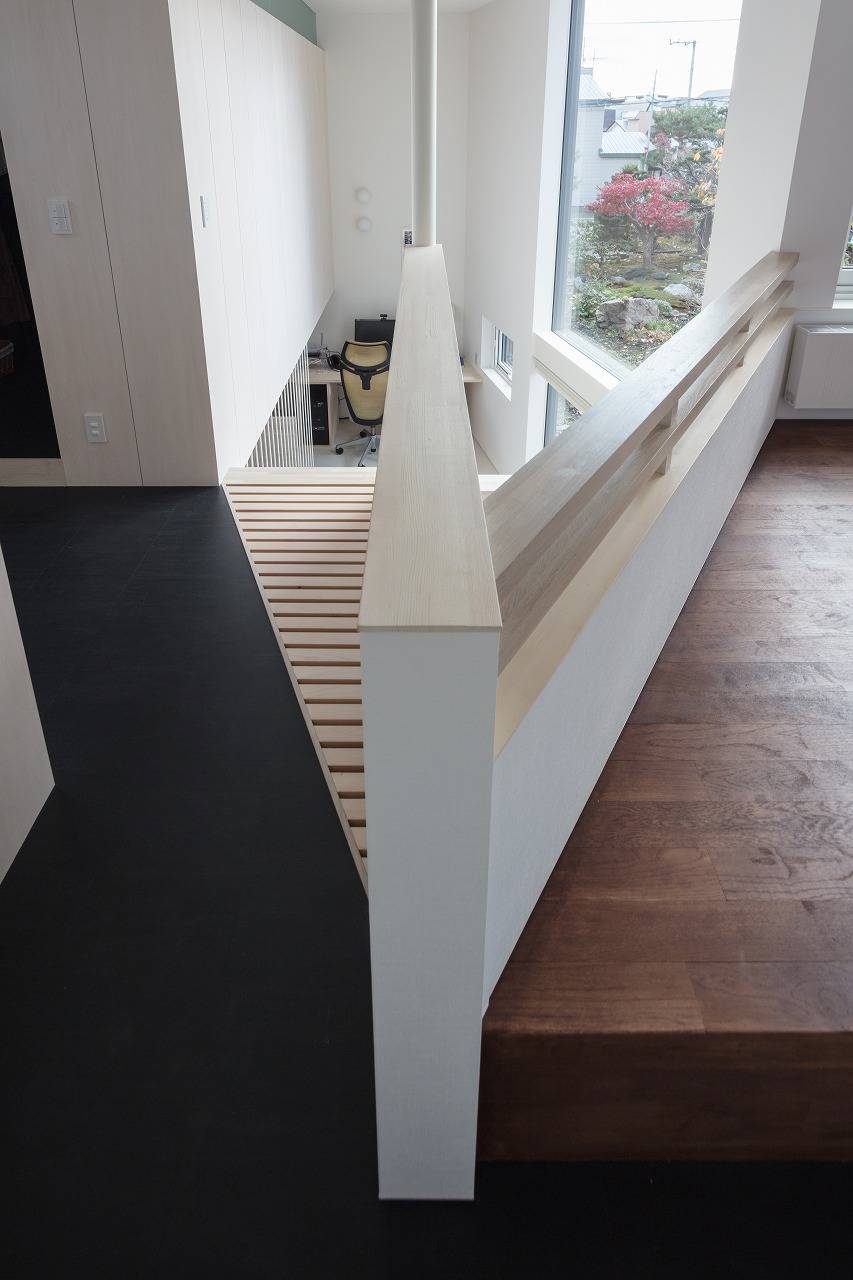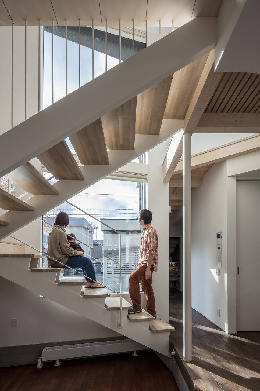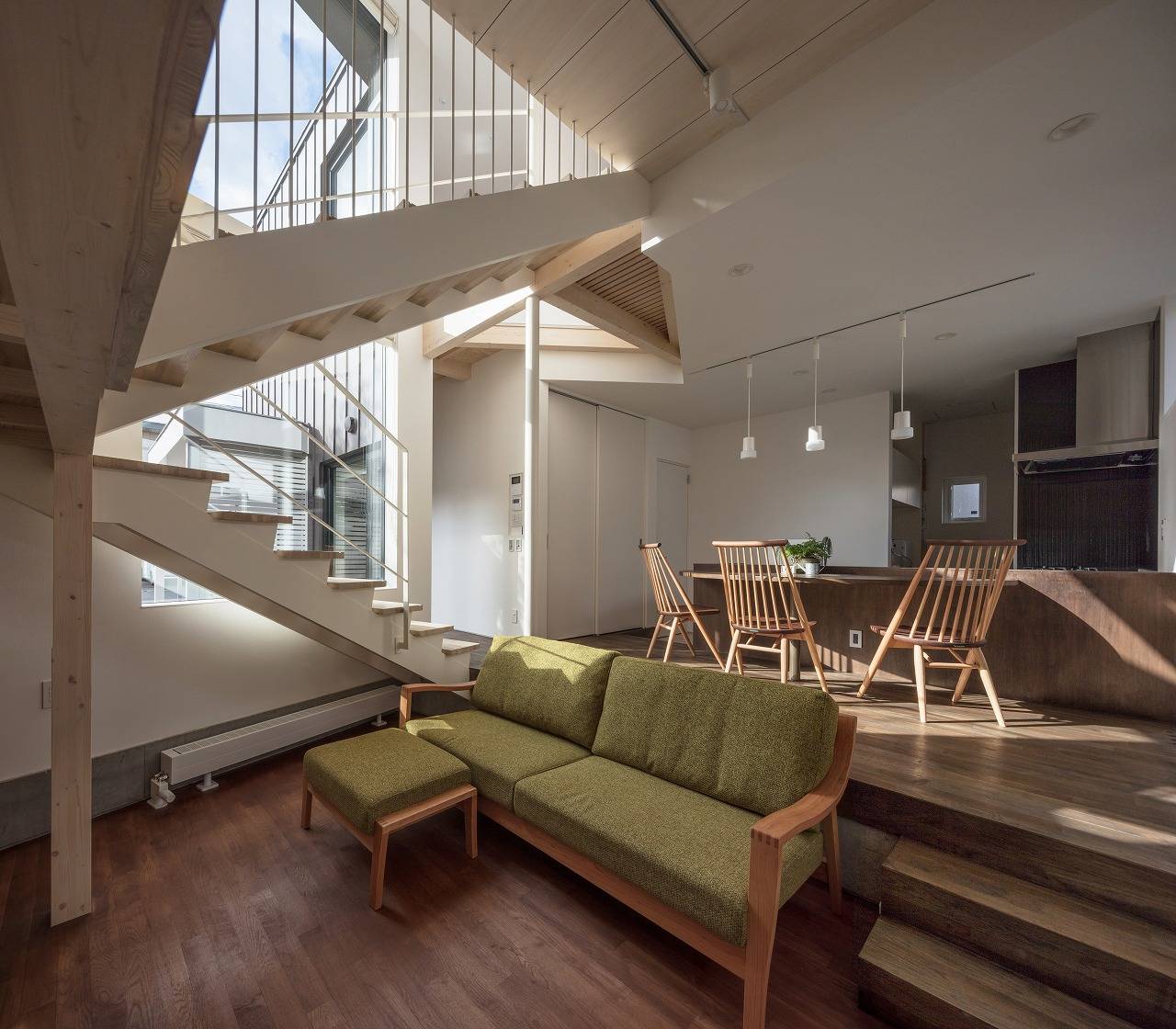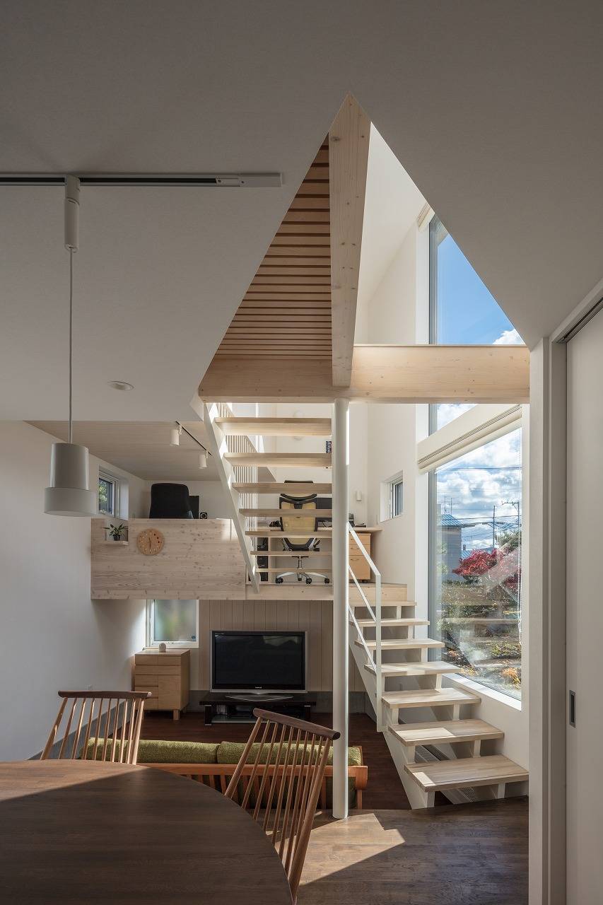 ひし形吹き抜けをめぐるスキップフロアの住まい。