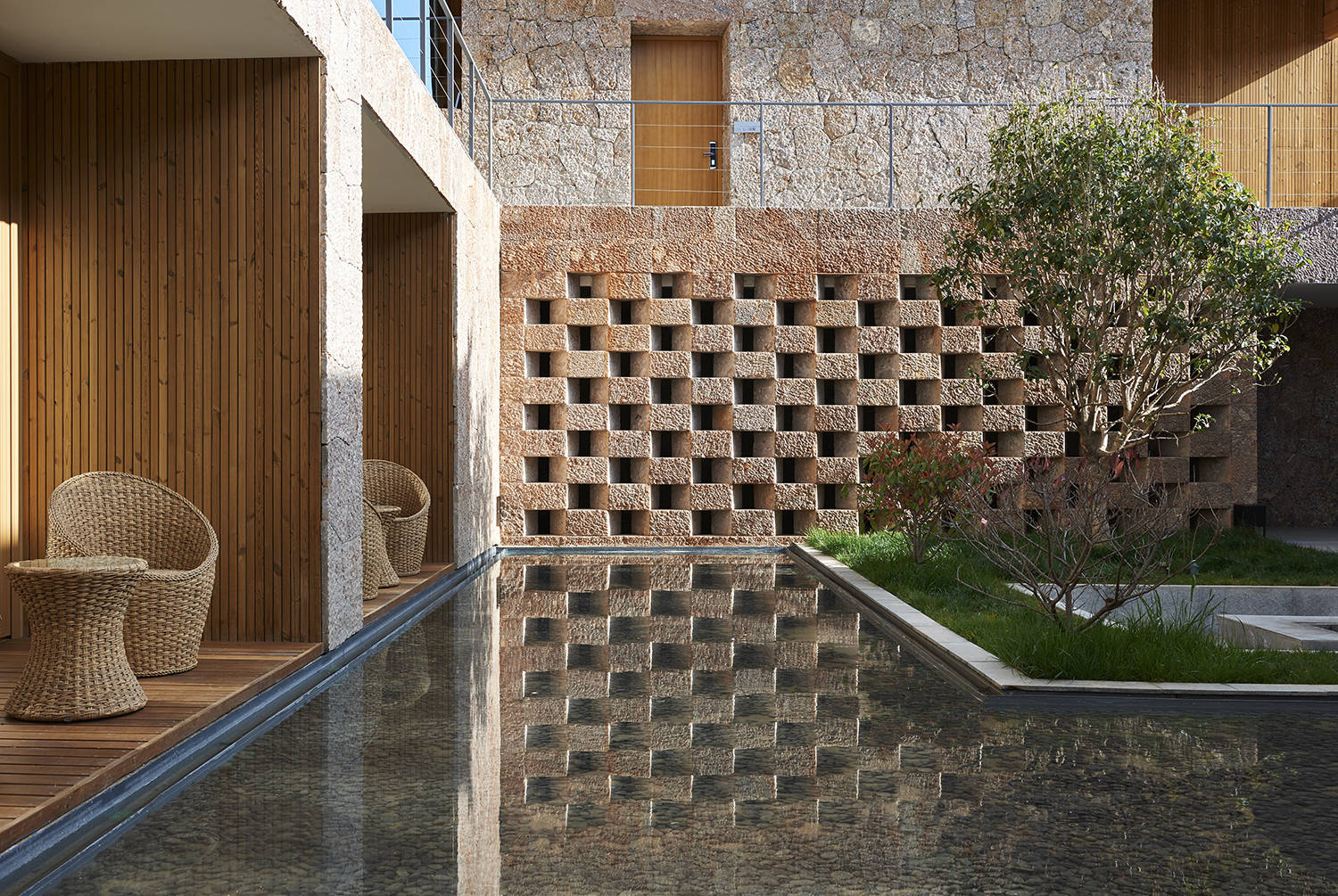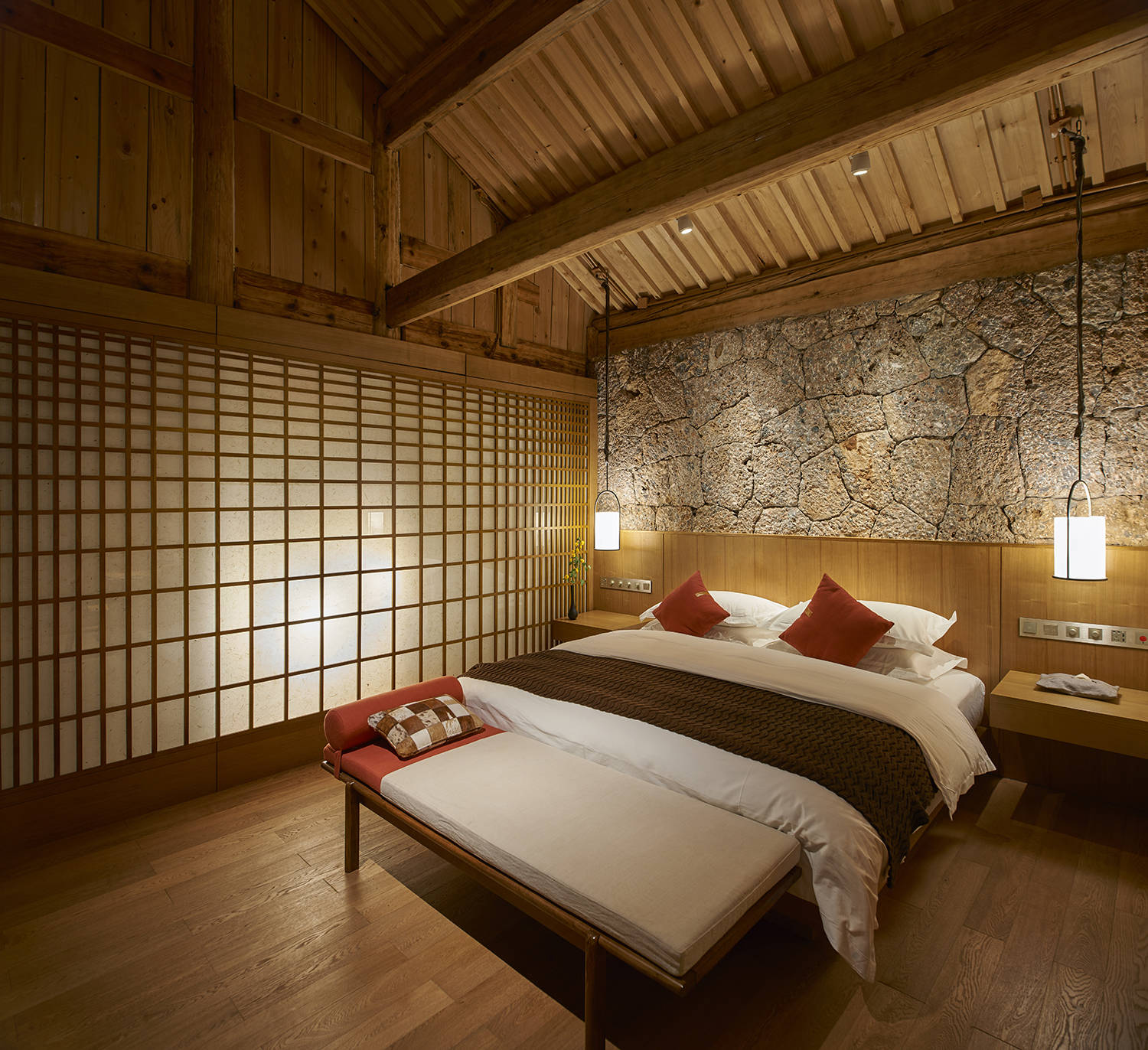 まず雪山と集落の風景を多様に享受するため、ランダムな石のヴォリーム群を設定する。一方で屋根は規則的に配置し周辺環境と調和させる。その結果露出された木造架構は、五花石の硬質な外殻と対比され、軽快さと重厚さが対比的に現れるように意図した。