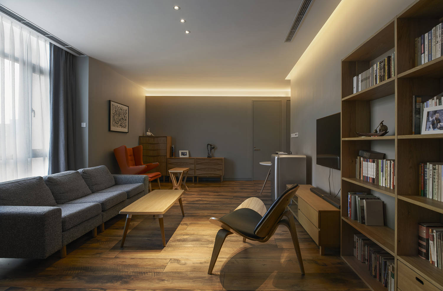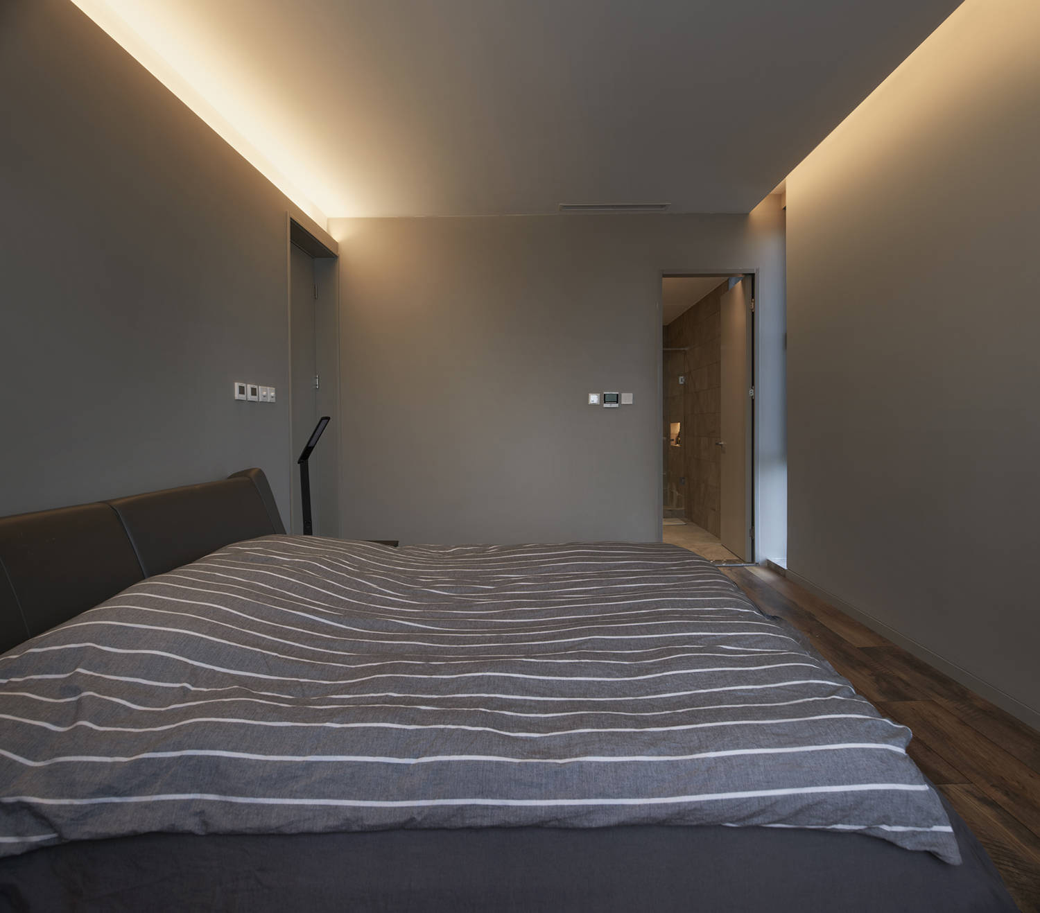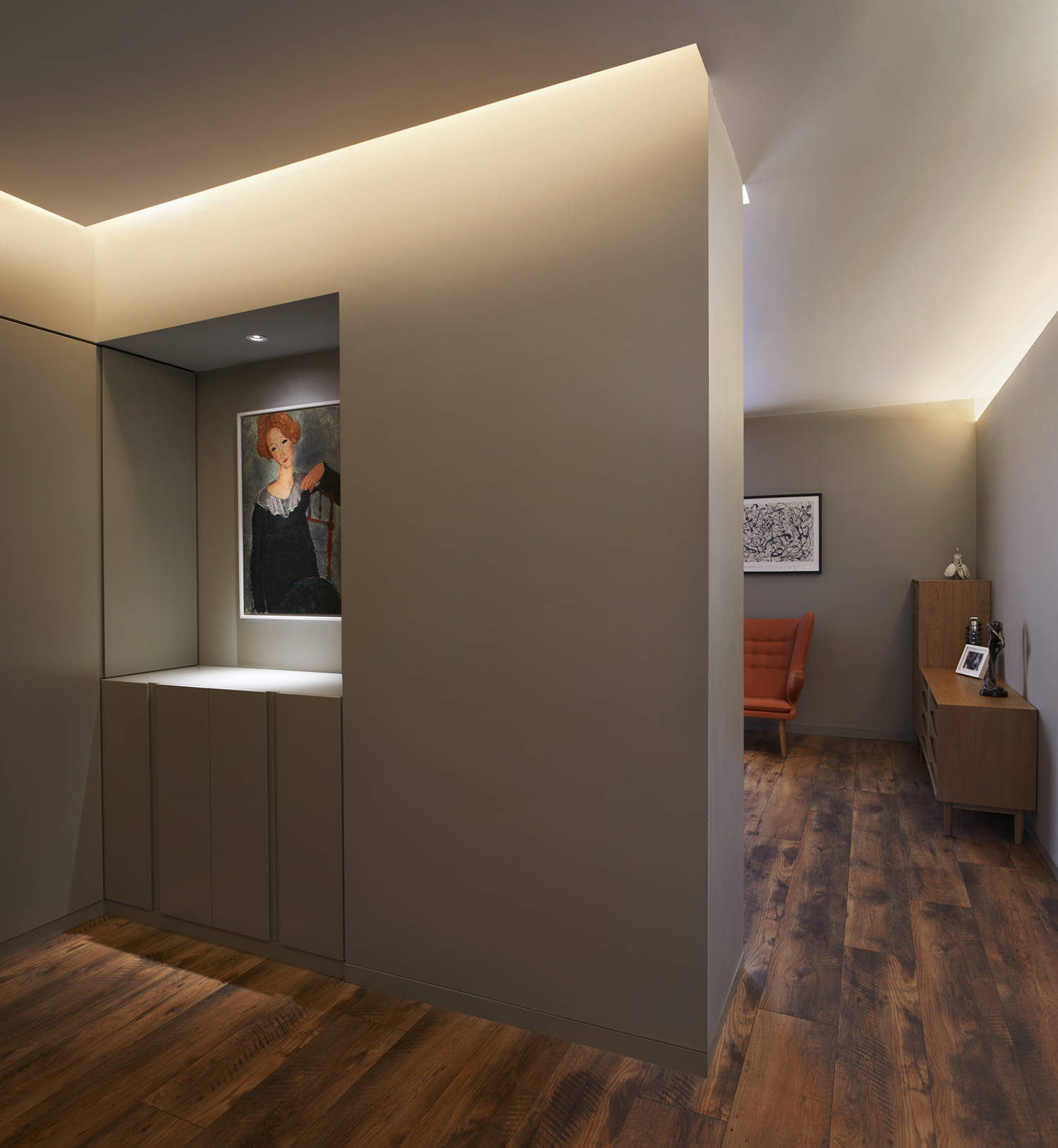 地上3階、地下1階の別荘建築を改築及び一部増築し、オフィス、ラウンジ、ギャラリー及び住居の機能を持たせる。3階の居住スペースは、灰色を基調としたミニマルな空間の中に、壁面と天井を照らす間接照明をバランスよく配置し、暖かい光に包まれる心地よい空間とした。