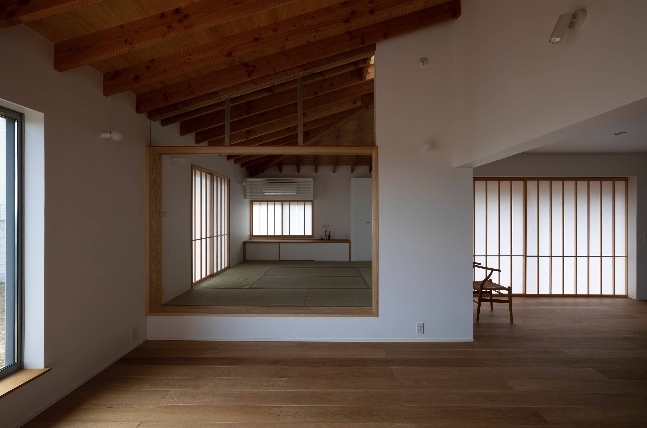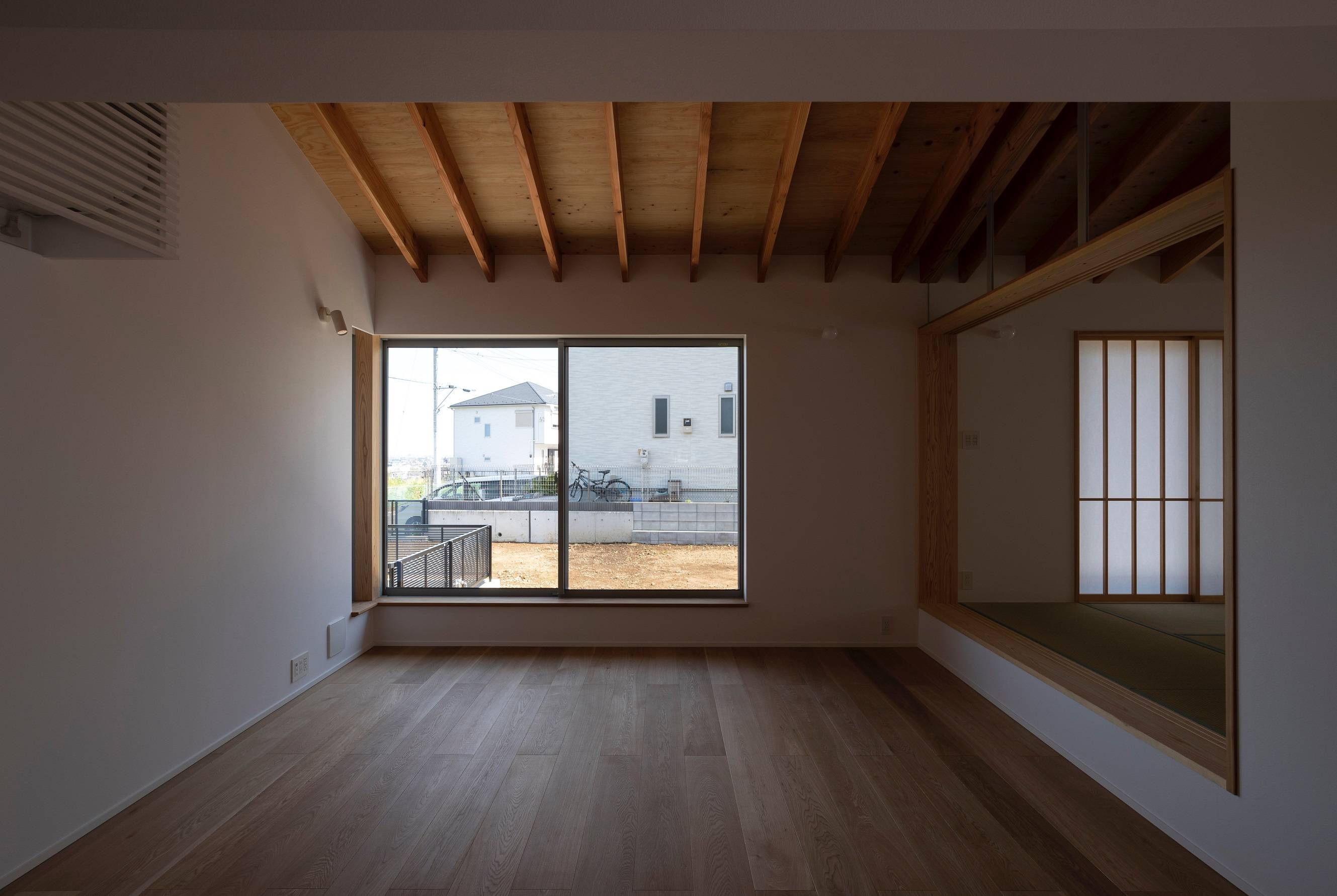 将来、周辺に家が立ち並んでも変わる事のない普遍的な美しさと、時間の変化を受け入れる和やかな住宅をイメージして設計を行いました。そして建物全体に風が流れ、光が行き届くように、中庭と吹抜けを効果的に取り入れました。またリビングの窓はフルオープンにすることで、内と外が一体となり家の中に居ながらにして豊かな樹々の中にいるような印象を生み出しました。