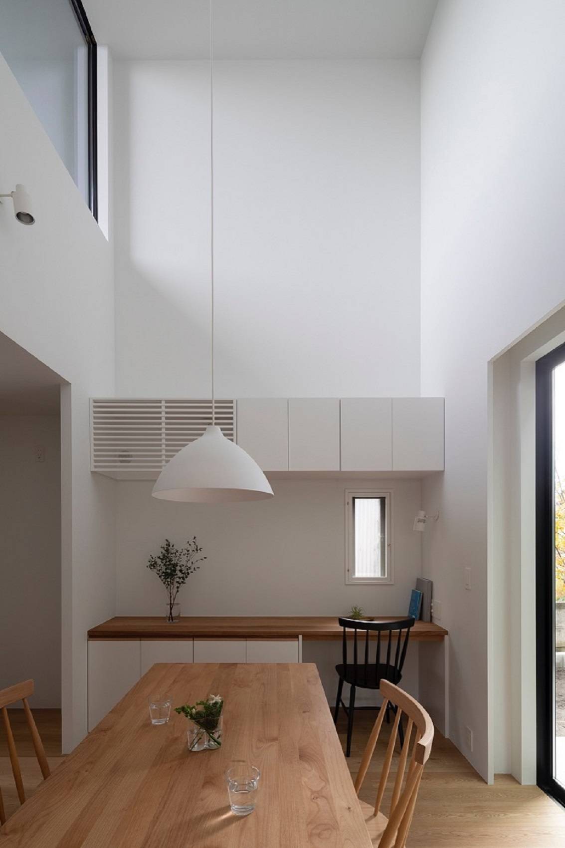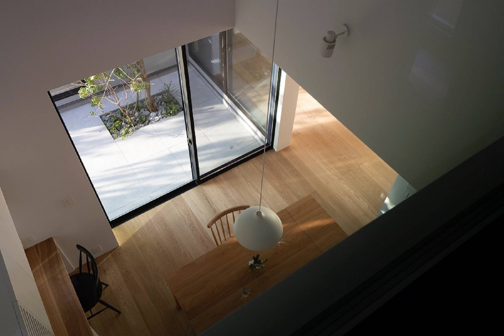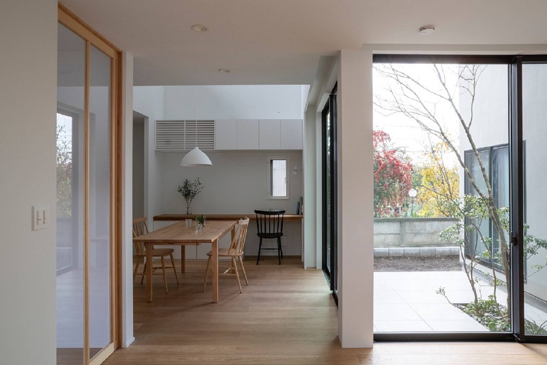 閑静な住宅地に建つ2世帯住宅の計画です。 建物の中心に中庭を設け、外部と内部が連続しながら展開していく空間が特徴的な住宅です。ダイニングキッチンとリビングは吹抜けや中庭と繋げる事で、それぞれの空間の距離感が程良く保たれるよう計画しました。 周囲からの視線を遮り安心感がありながらも開放感のある窓辺では、きっと穏やかな光の移ろいを感じることが出来るでしょう。
