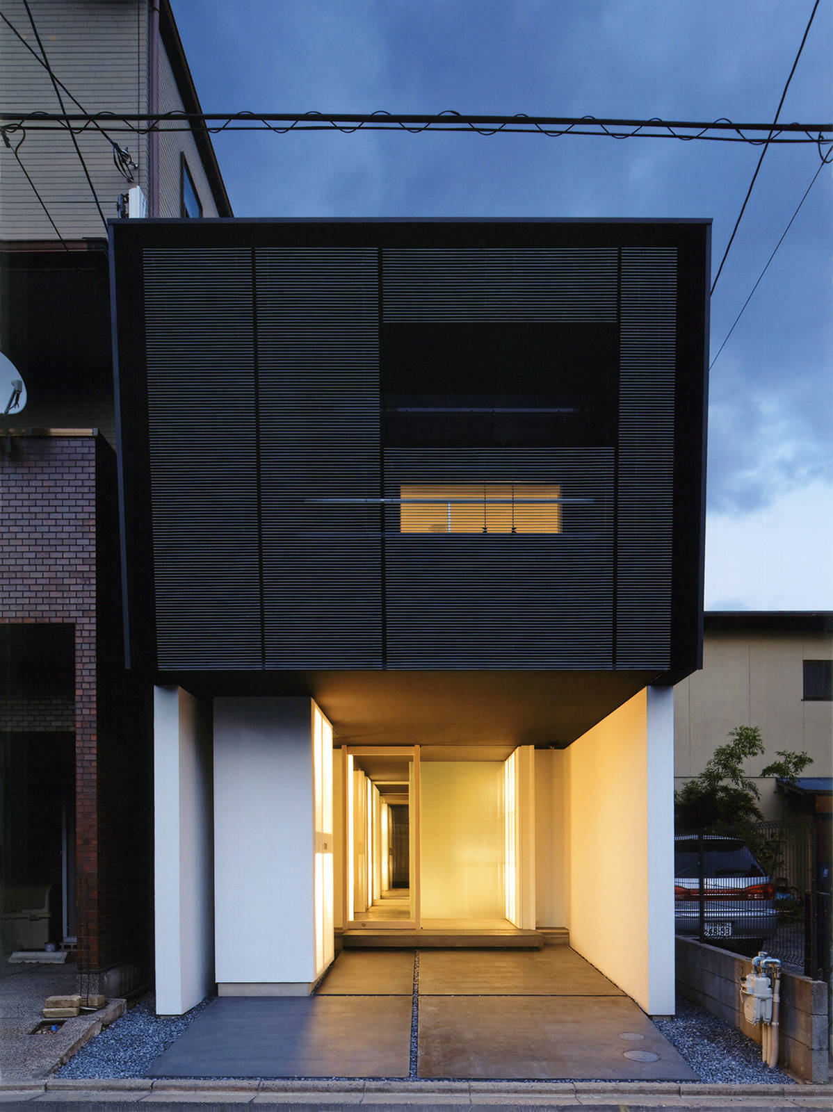 京都の細長い狭小地に建つ、木造2階建て住宅です。
