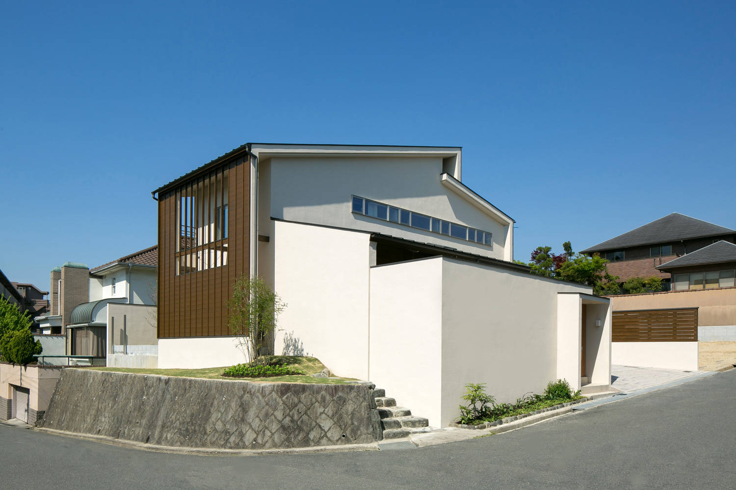 見晴らしのいい角地に建つ邸宅。地下ガレージを含む古家を解体して、新しい家族の住まいができました。
