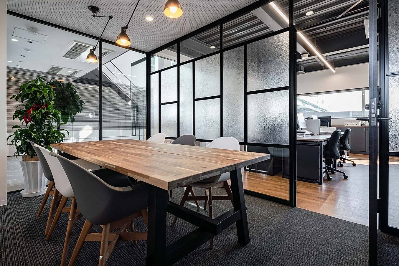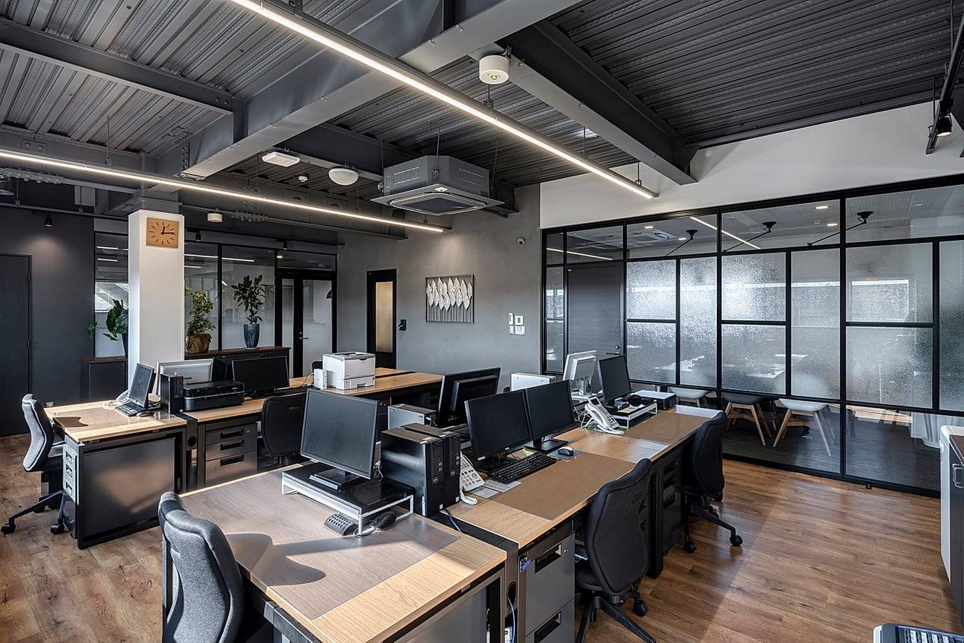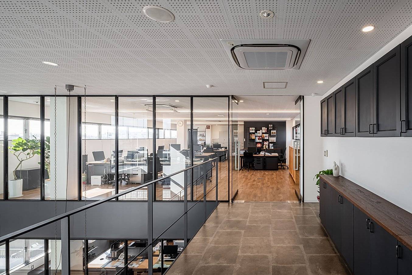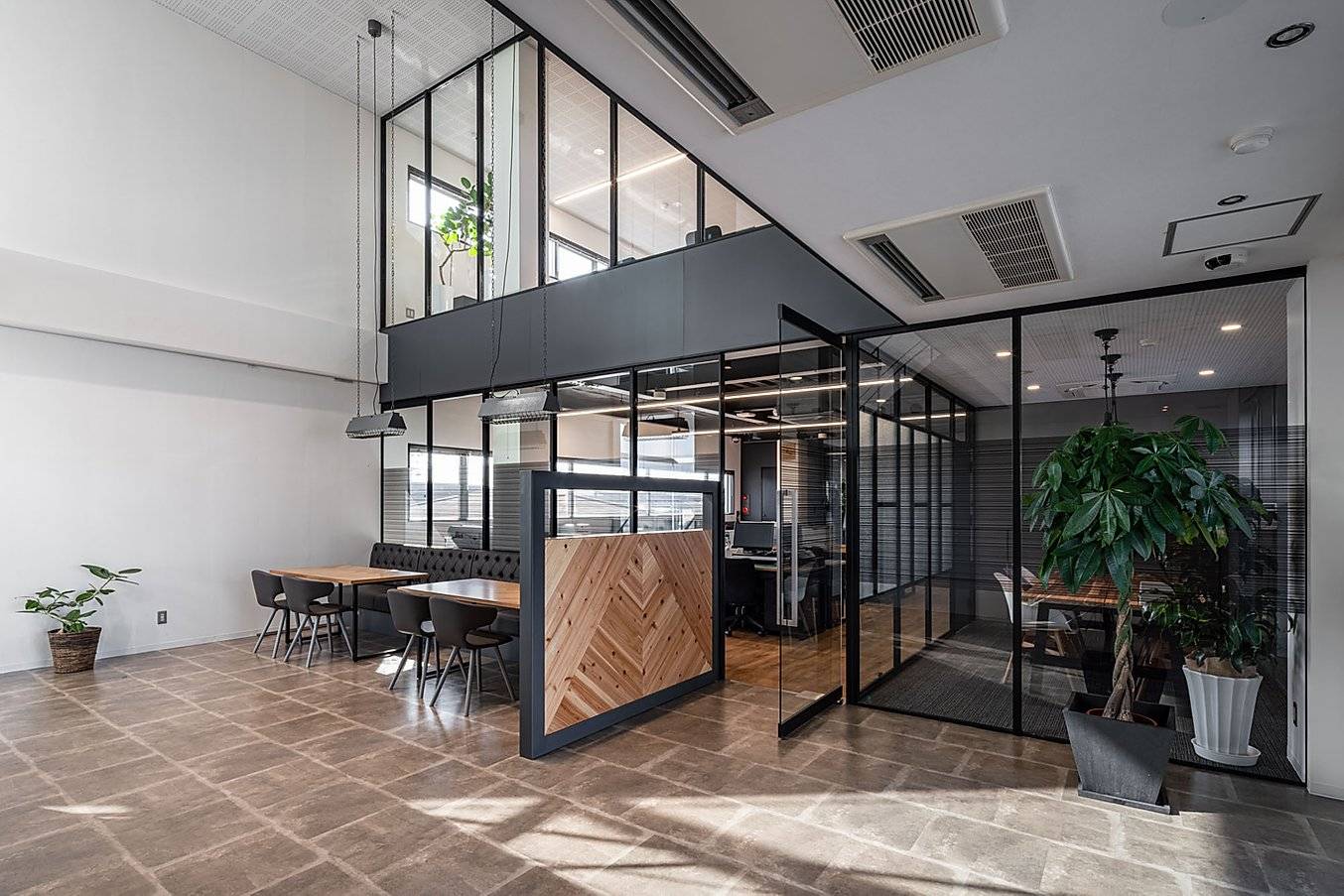 部屋により異なる天井高、適度な開放感あるガラスの仕切、付加されたサッシ等は、限られた面積の中でも多様な居心地を作り出し、さまざまなレベルでのモチベーションを高める。