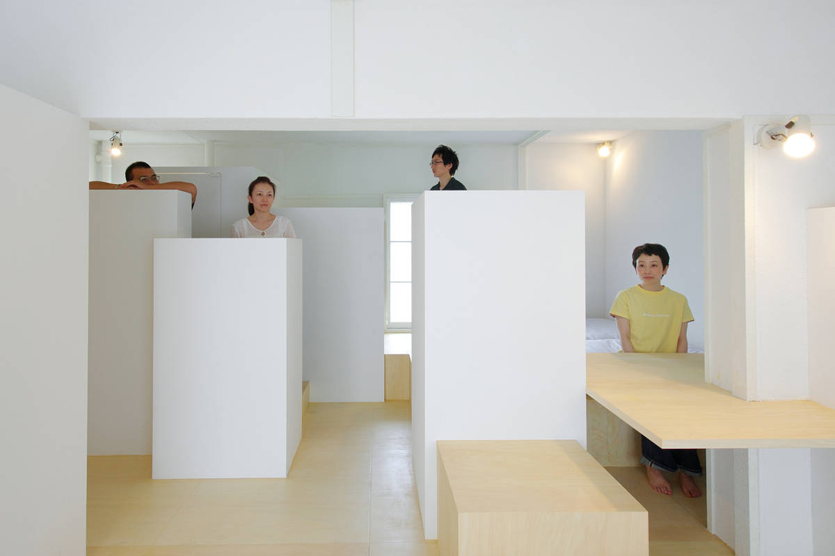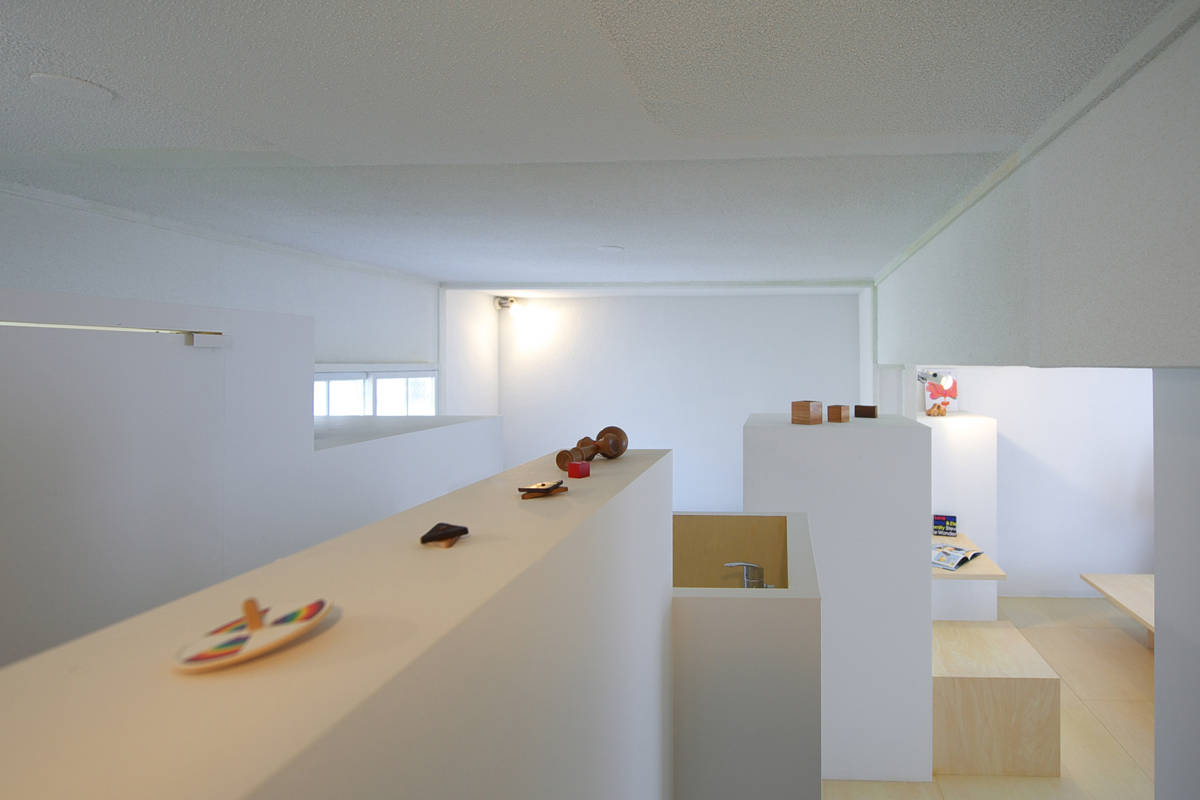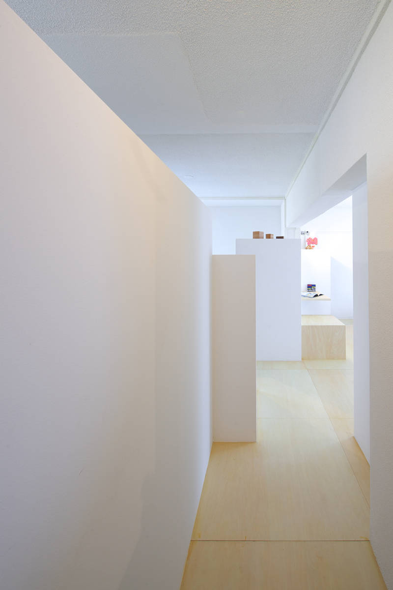 従来スケルトン/インフィルと言う時に曖昧にされてきた『物・荷物』の扱い方に改めて注目しています。設計段階に発生する残余空間に物・荷物を事後的に押し込むと言う手法はとらず、室内全体を「整理整頓された大きな納戸」と捉え、物・荷物を整理整頓するための仕掛け『整頓箱』を多数分散配置しています。無数の整頓箱は各々高さ・幅・容量が異なり、ワンルーム空間を穏やかに分節しながら大量の物・荷物をそのそばに引き寄せます。便器・洗面器・電子ピアノ・キッチンカウンター等もその内部に飲み込み、上部は陳列スペースとしても活用できます。
