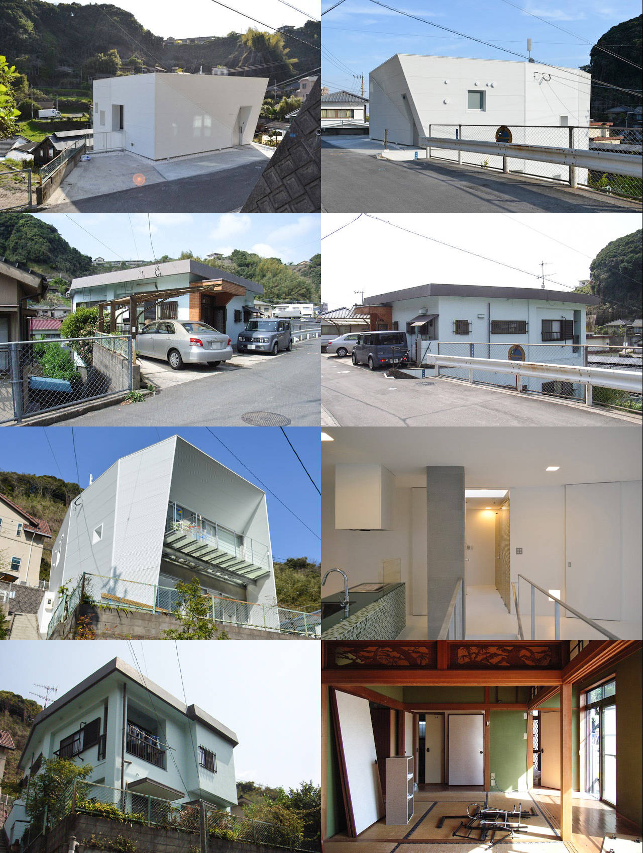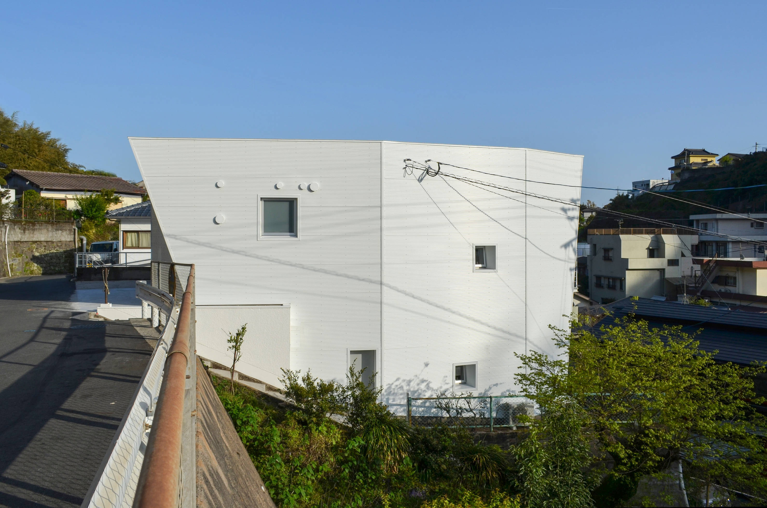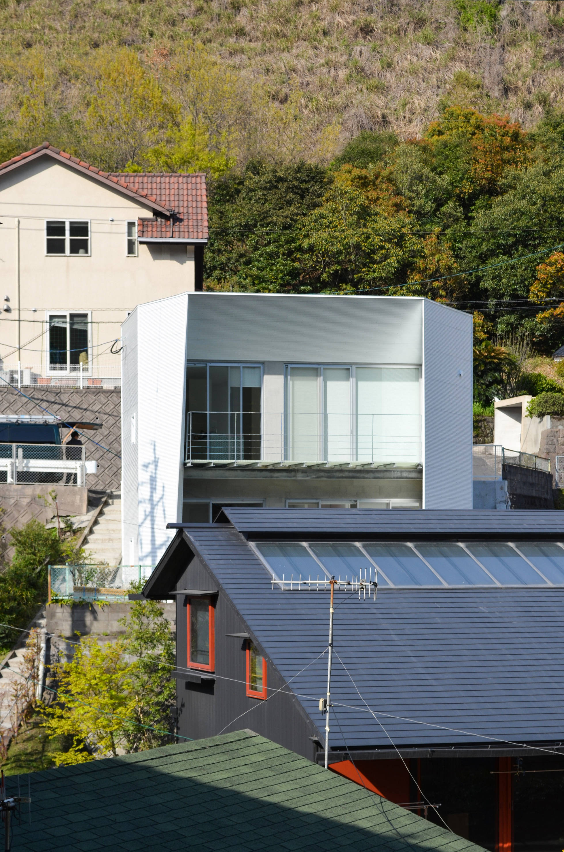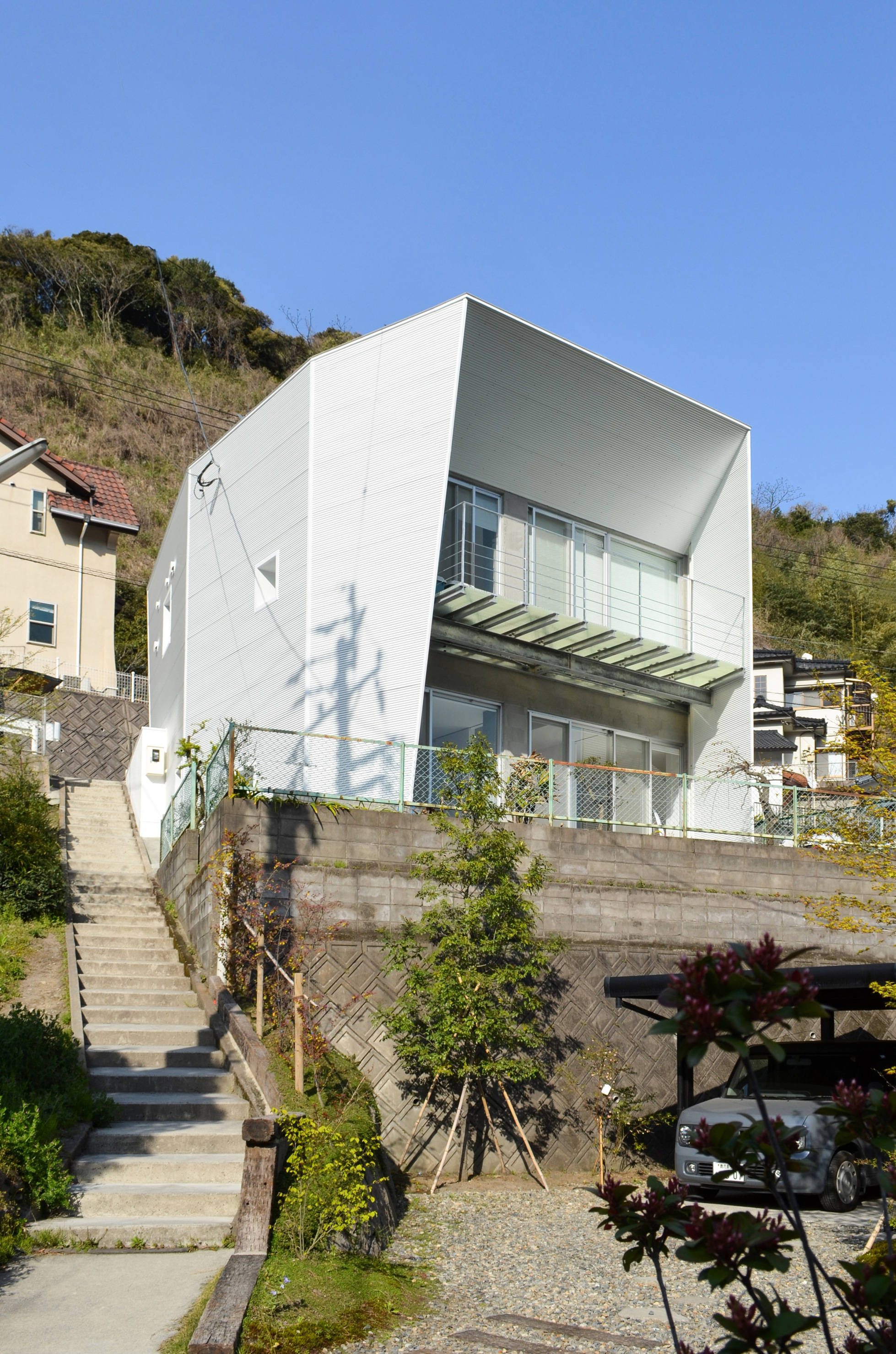 柱、梁型の露出する既存の外観は、鉄骨下地の白いガルバリウム小波板で覆いイメージの刷新を図った。また、南側の出窓及び奥行きの浅いバルコニー部分を減築し、広めの透明ファイバーグレーチング床による軽量な鉄骨バルコニーを設け、上下階とも全面開口とする事で明るく開放的な空間となりました。さらに、階段は構造的に位置こそ変えられませんが、上階の壁を取り払い手すりとし、広めの居間空間を実現しました。