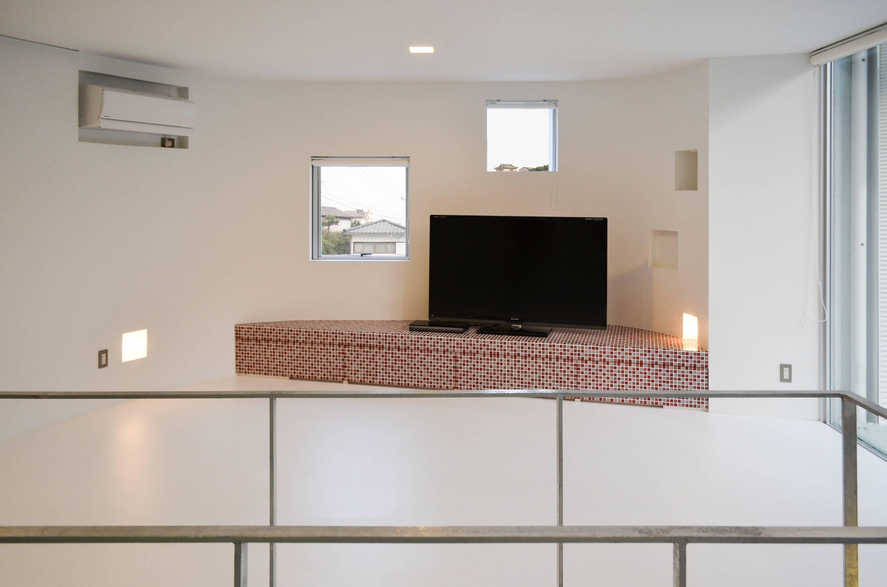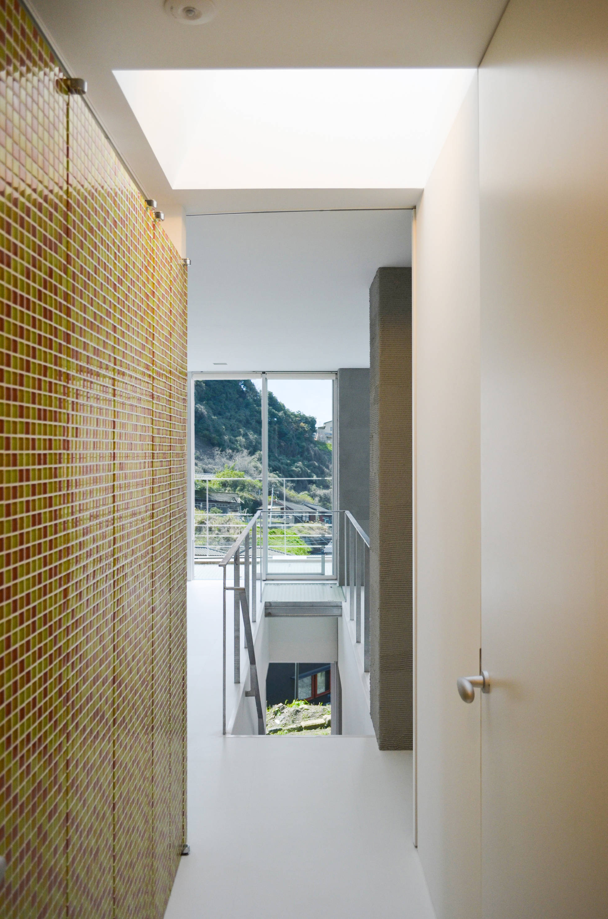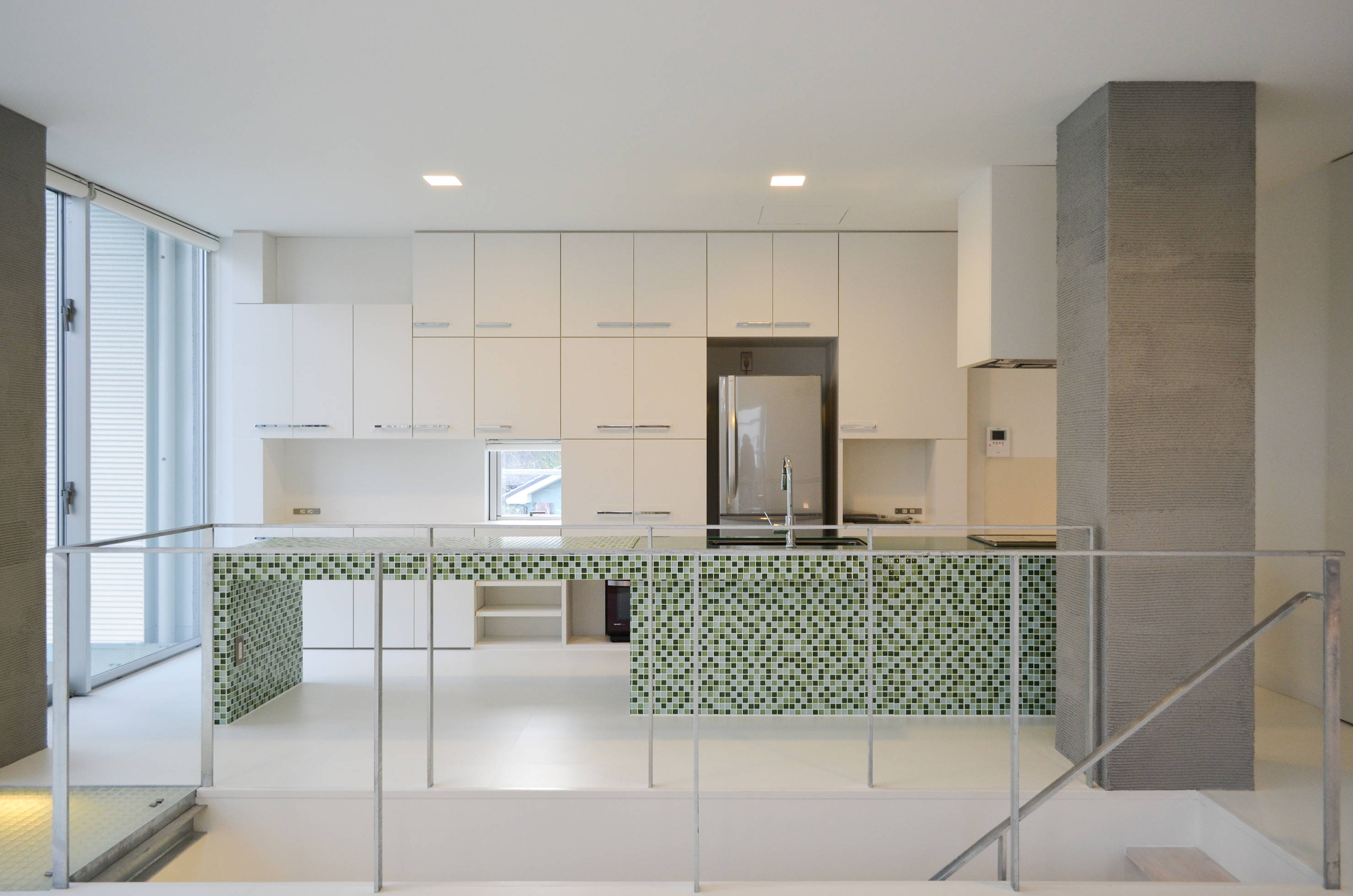 白い室内の各所に鮮やかな色のガラスタイルを使用し、空間のアクセントとしています。