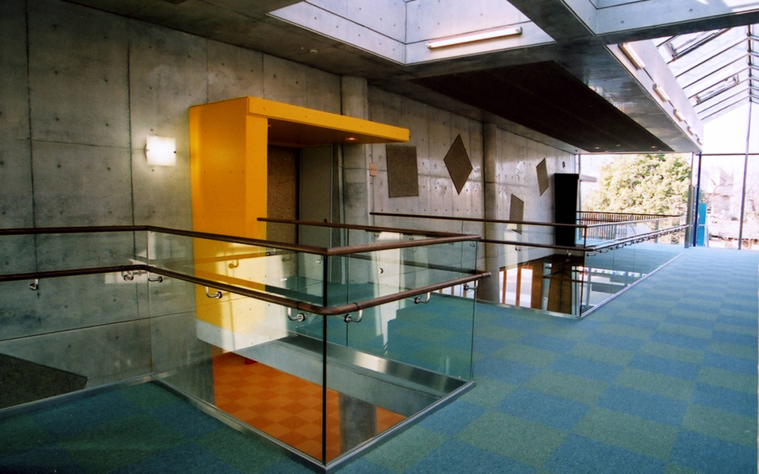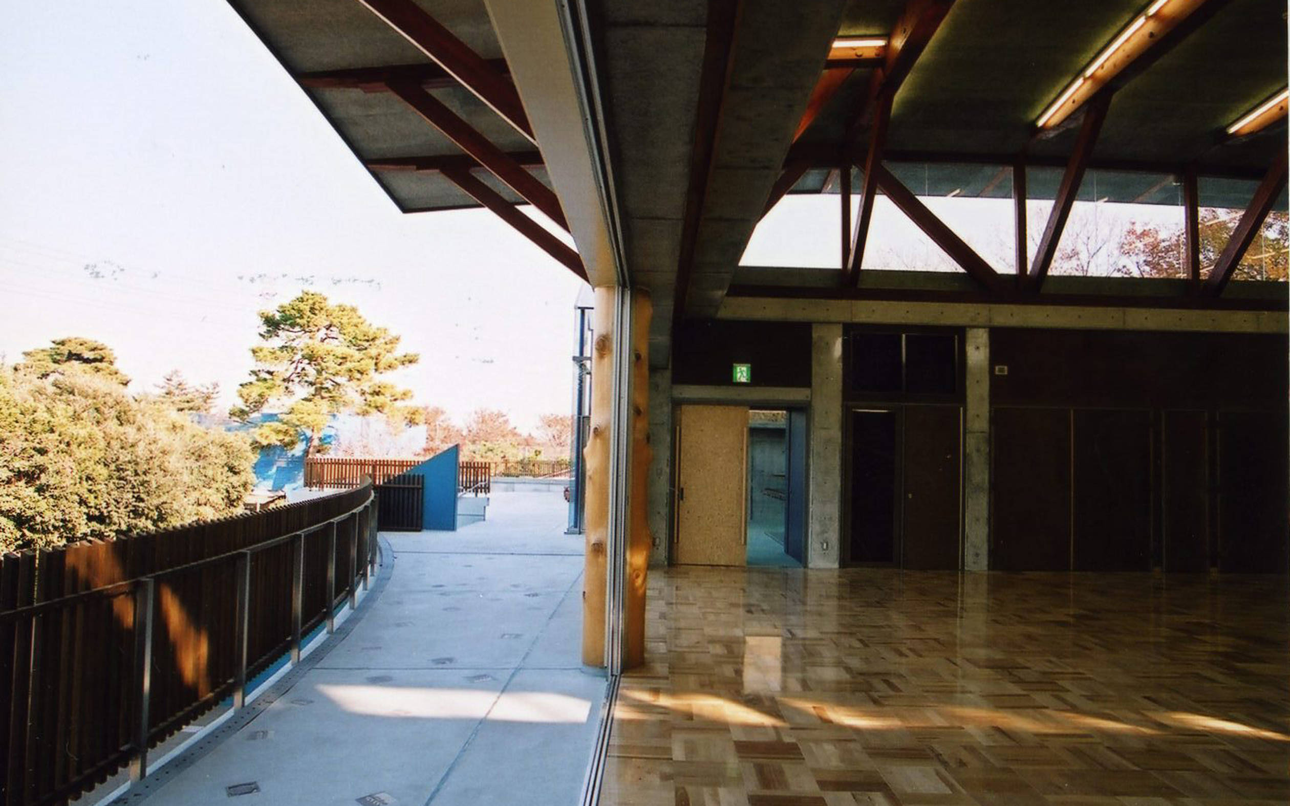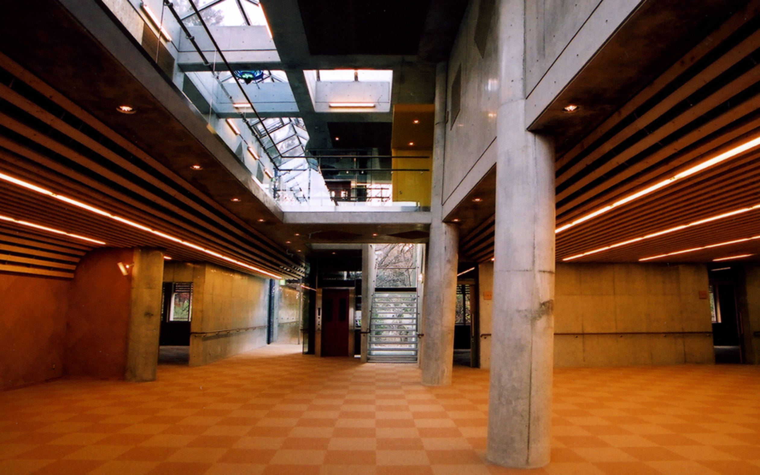 配置計画としては、南側のICUの緑を借景とすることと共に既存キャンパスの間に中庭プラザができることからキャンパス南側に配置することになりました。建物の全体構成は、1階に多目的スペースを設け、ウッドデッキと繋げ、様々な使われ方ができるよう配慮しました。教室や会議室は南側に配置しました。2階には大教室を設け、ルーフデッキと繋げて使えるようにしました。十字架はメインンセプトであり、全体の諸室構成においてもトップライトの配置や廊下の配置、各建具のデザインに至るまでデザインの手掛かりに十字架を意識しました。村野藤吾氏の既存キャンパスデザインの継承として、台形の安定した断面デザインや地窓や庇の深い窓廻りのインテリアや外観デザインに活かしました。省エネへの配慮としてトップライトの自然採光を取り入れると共に貯留した雨水をトップライトに流すという水冷システムを採用しました。これにより夏場の冷房負荷を下げると共に、水のゆらぎ感を楽しむことができます。