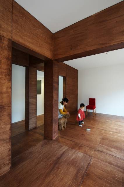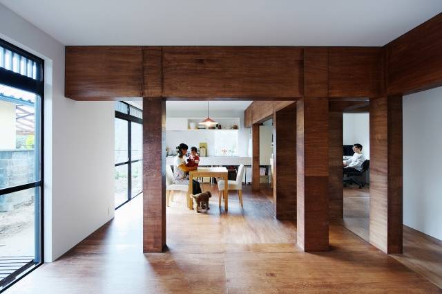 不要に思われる間仕切り壁を全て取り払ってしまうのではなく、存在感を増した「垂れ壁+壁柱」として残し、既存住宅に眠っていた特徴的な卍型の軸線を顕在化しています。「垂れ壁+壁柱」は遺跡のように今後も生活の中心に居座り続け、これからの新しい暮らしを静かに見守り続けることでしょう。