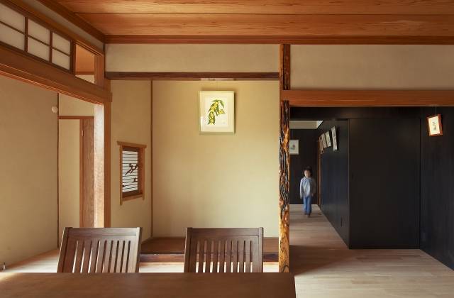 この「植物画」という異物(既存住宅にしてみればずいぶん奇妙な来客です)が蜘蛛の巣のように家の隅々に寄生することで、平凡な間取りが複雑に重層化し、多元的な経験を生む社交の場に変容しています。(例えば押入れの中の植物画を鑑賞した後に、床ノ間の前に置かれた椅子に腰掛けておいしい珈琲を飲み、仏壇入れの中に飾られた植物画について友達とあれこれ談笑し、ふと、縁側の向こうの庭=植物を眺める、という風に)