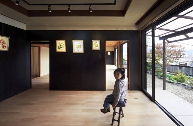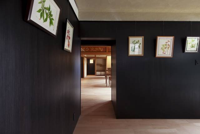 ここではその平面形状を一切変更せずに、「植物画」を飾るための黒壁を室内各所に挿入しています。