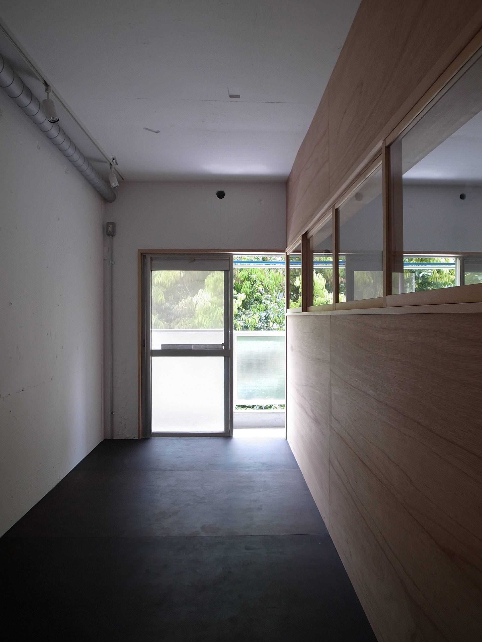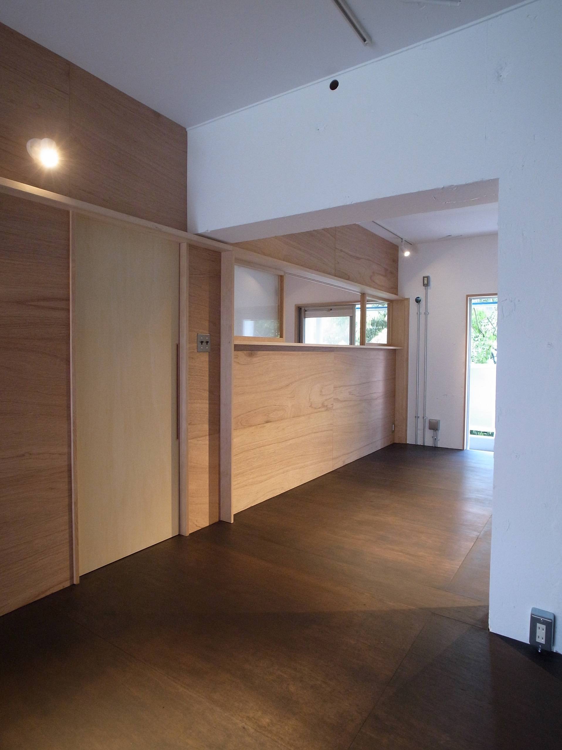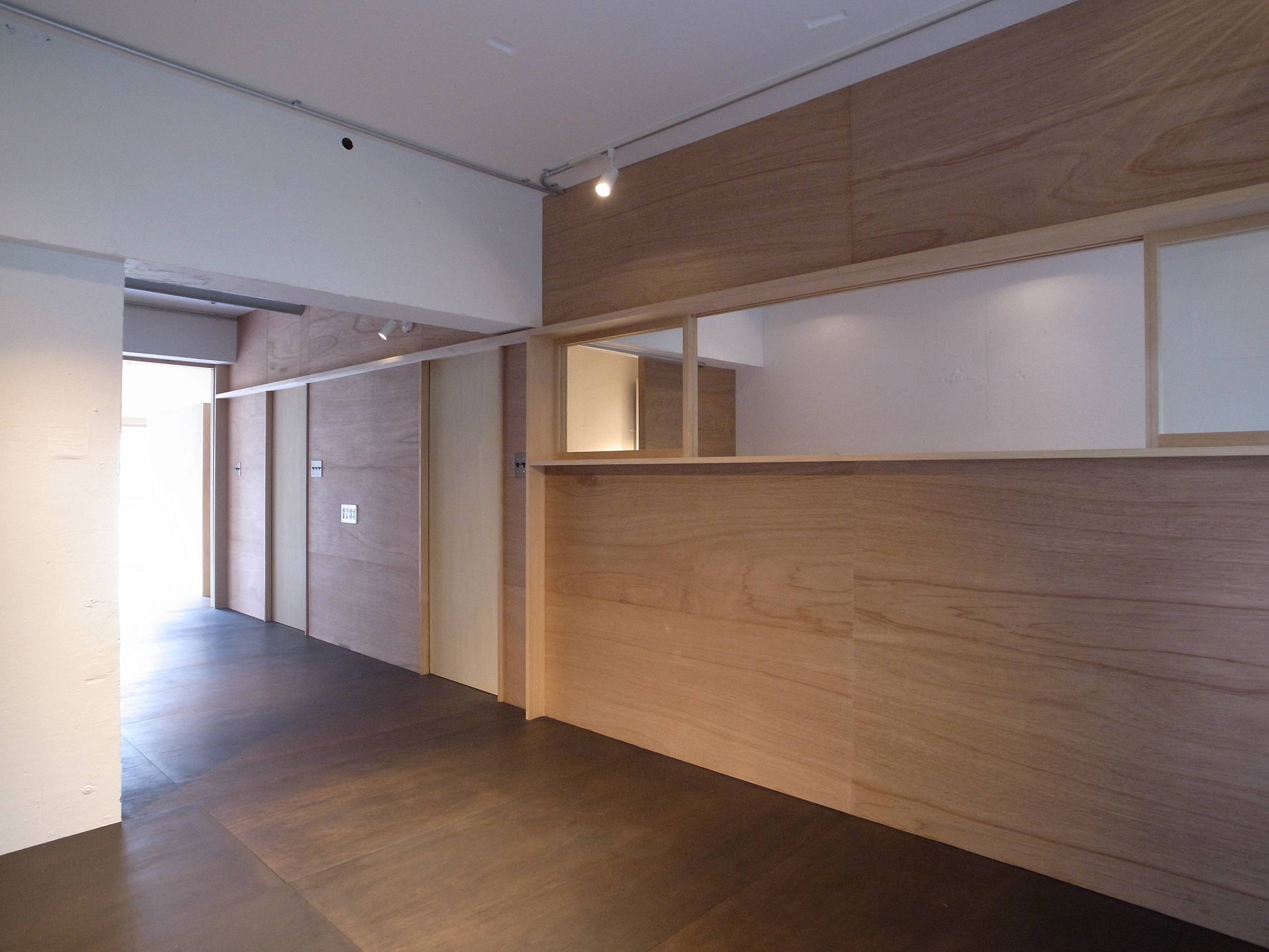 代官山の駅にほど近い立地ながら、静かな環境のマンションフルリノベーション。低予算という条件から、以前のプランから大幅な変更はせず、既存のRC壁を生かした設計とした。新設壁はラワン合板仕上げとし、水廻り以外は建具を開け放つとワンルームとなる。ワンルームとなった空間には東西に気持ちの良い風が流れ、マンション特有の風が抜けないプランにならないように配慮した。西側寝室の収納部分は建具で仕切らず、使い勝手を良くするため回遊動線とした。その結果、収納にも風が抜け、湿気たまりがなくなる。東側居間、ワークルームは緑を望むことができ、穏やかな光が差し込む落ち着いた場、中央の食堂・台所は東西の窓が望め、風の通りを一番感じられる仄暗く、安堵感のある場となった。